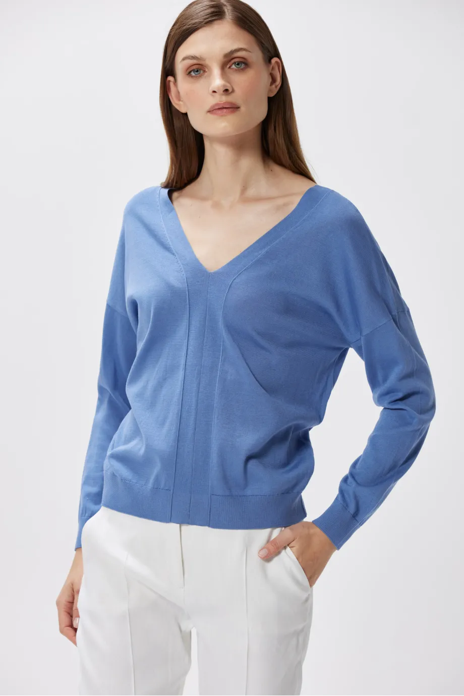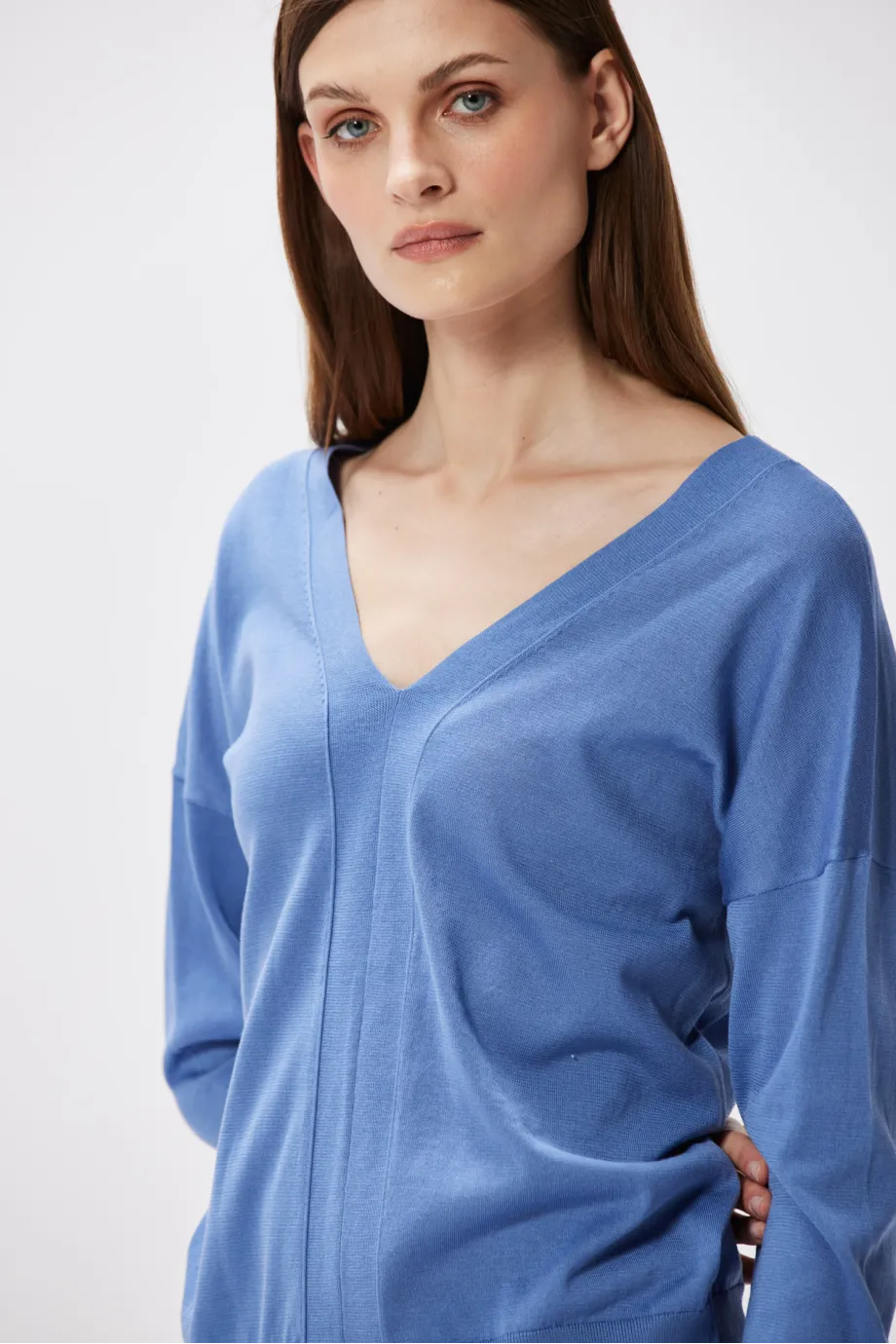 Hellblaue Bluse mit V-Ausschnitt