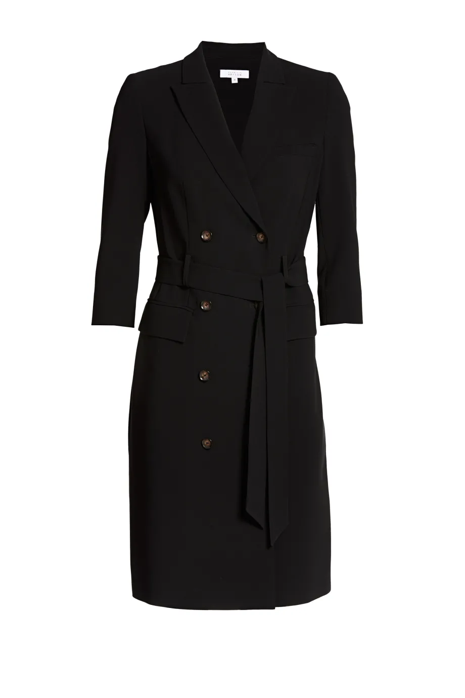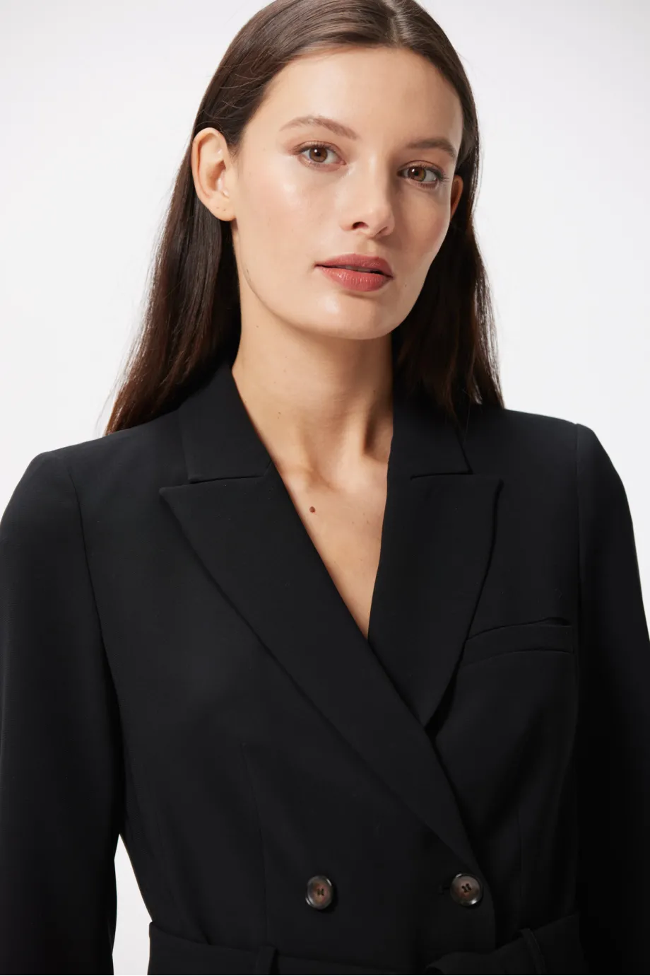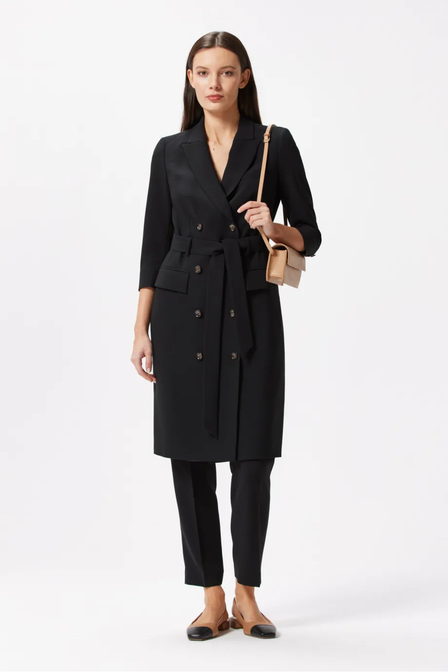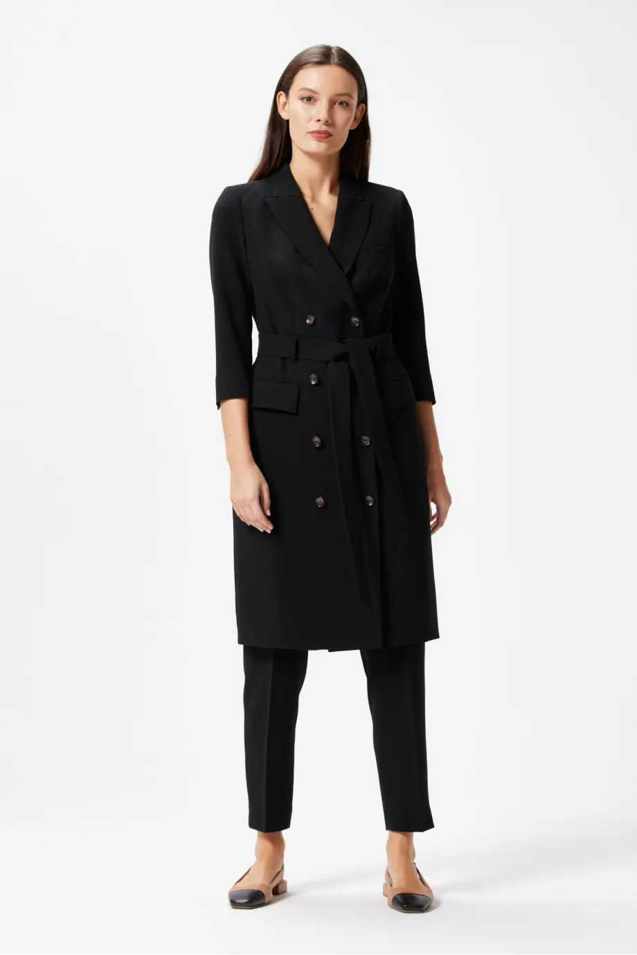 Das schwarze Zweireiher-Kleid Elise stammt aus der Frühling-Sommer-Kollektion. Es wurde aus atmungsaktivem Triacetat gefertigt, welches als der Bentley unter den Viskosen bezeichnet wird. Dieses schwarze Kleid mit Gürtel sieht auch nach einem ganzen Tag des Tragens makellos aus und ist ideal auf Reisen. Mit dem Business-Kleid von Patrizia Aryton erhalten deine Büro- und Besuchsoutfits eine feminine Note und einen modischen Look.