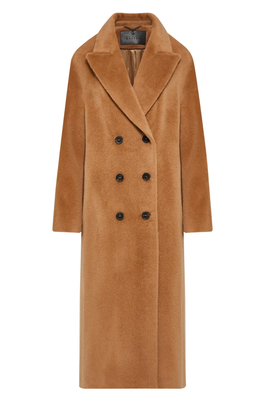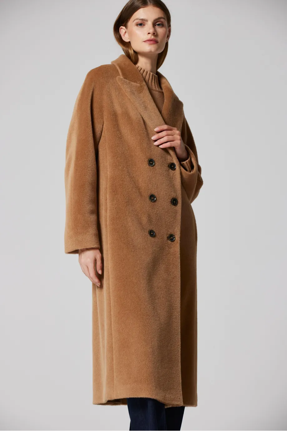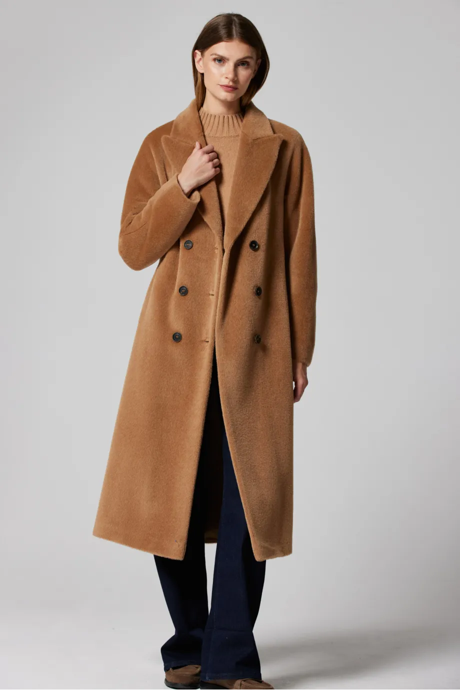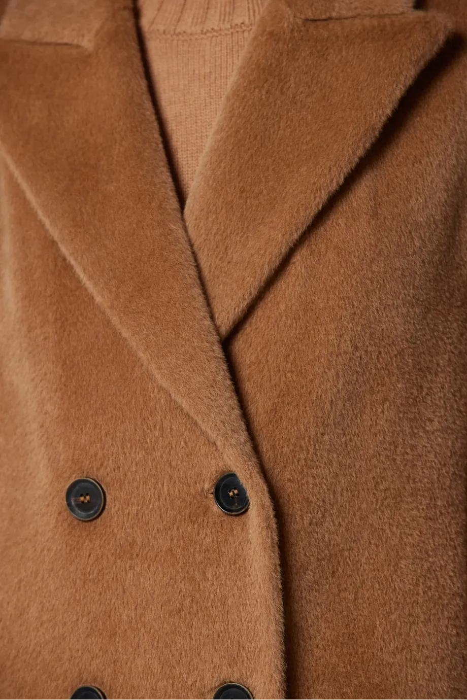 Camelfarbener Doppelreihiger Mantel aus Suri-Alpaka