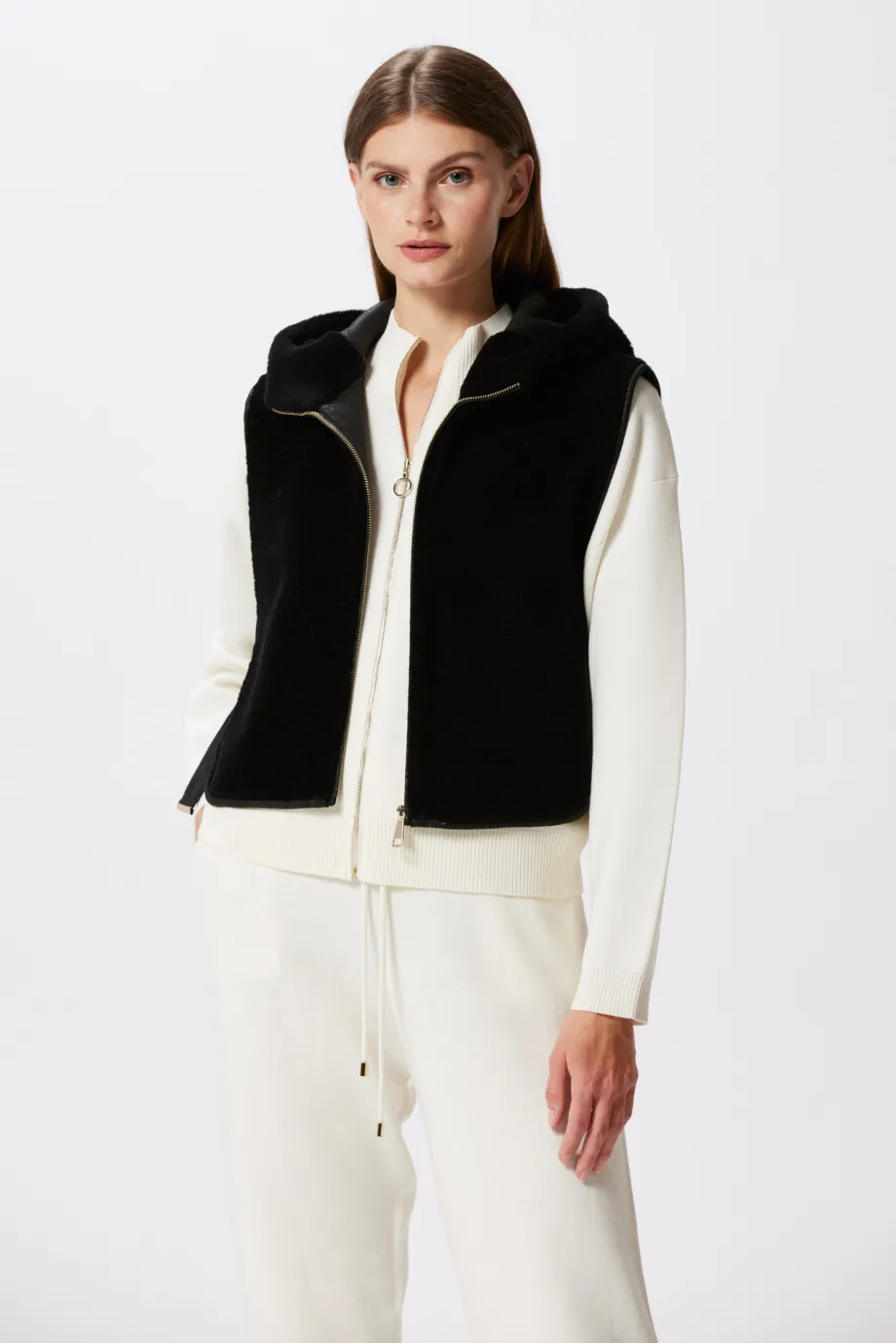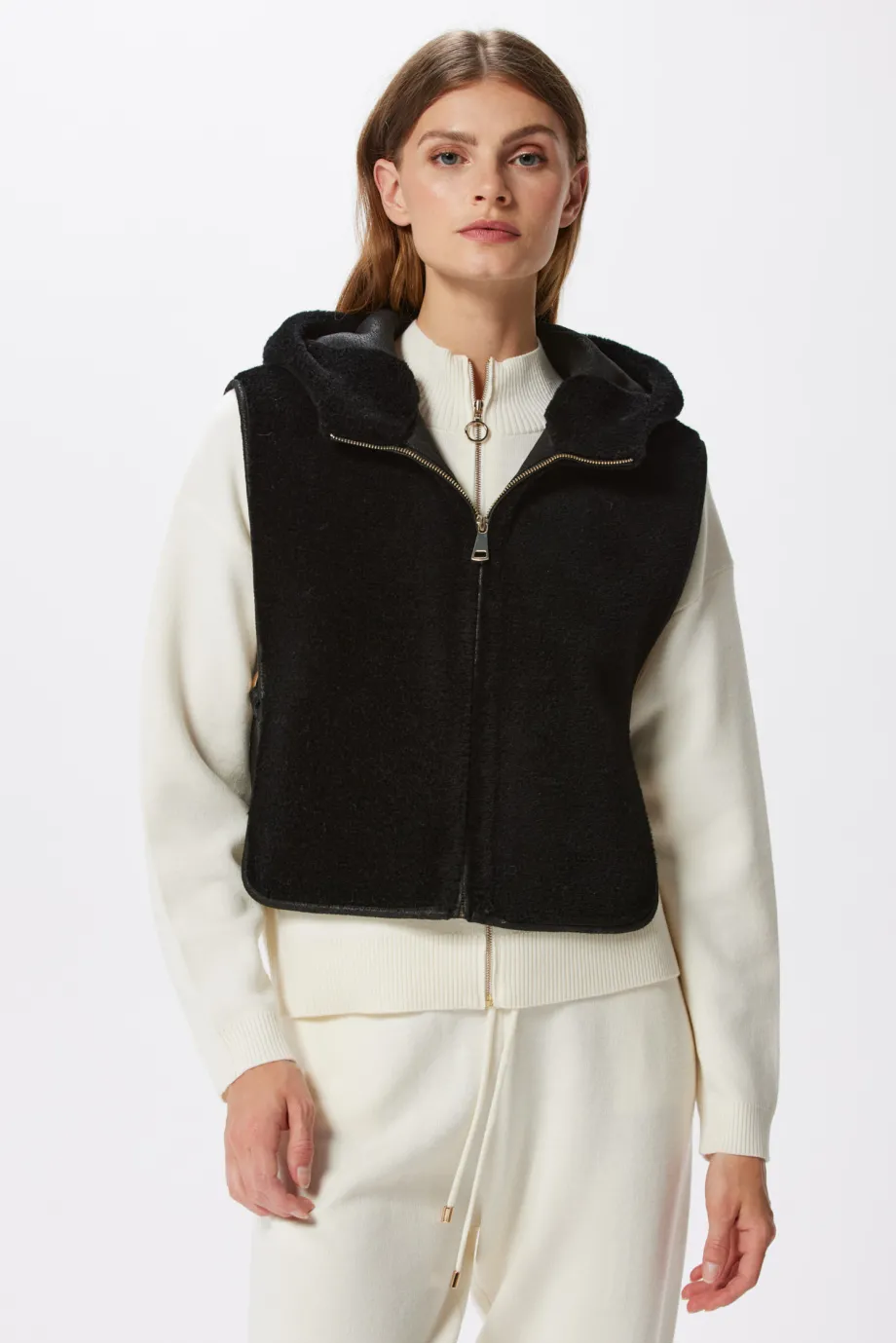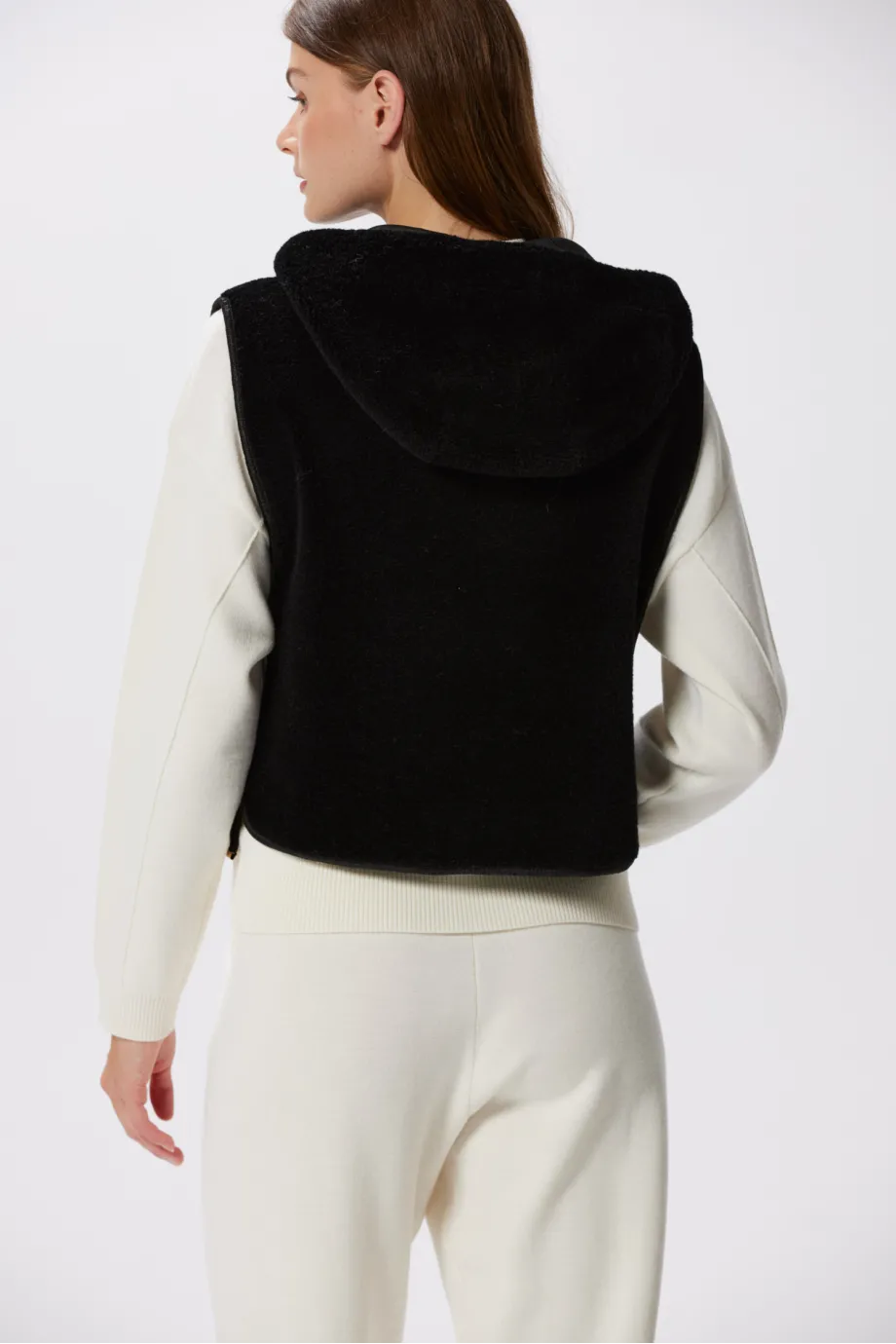Schwarze Kapuzenweste aus Teddy-Bär-Wolle