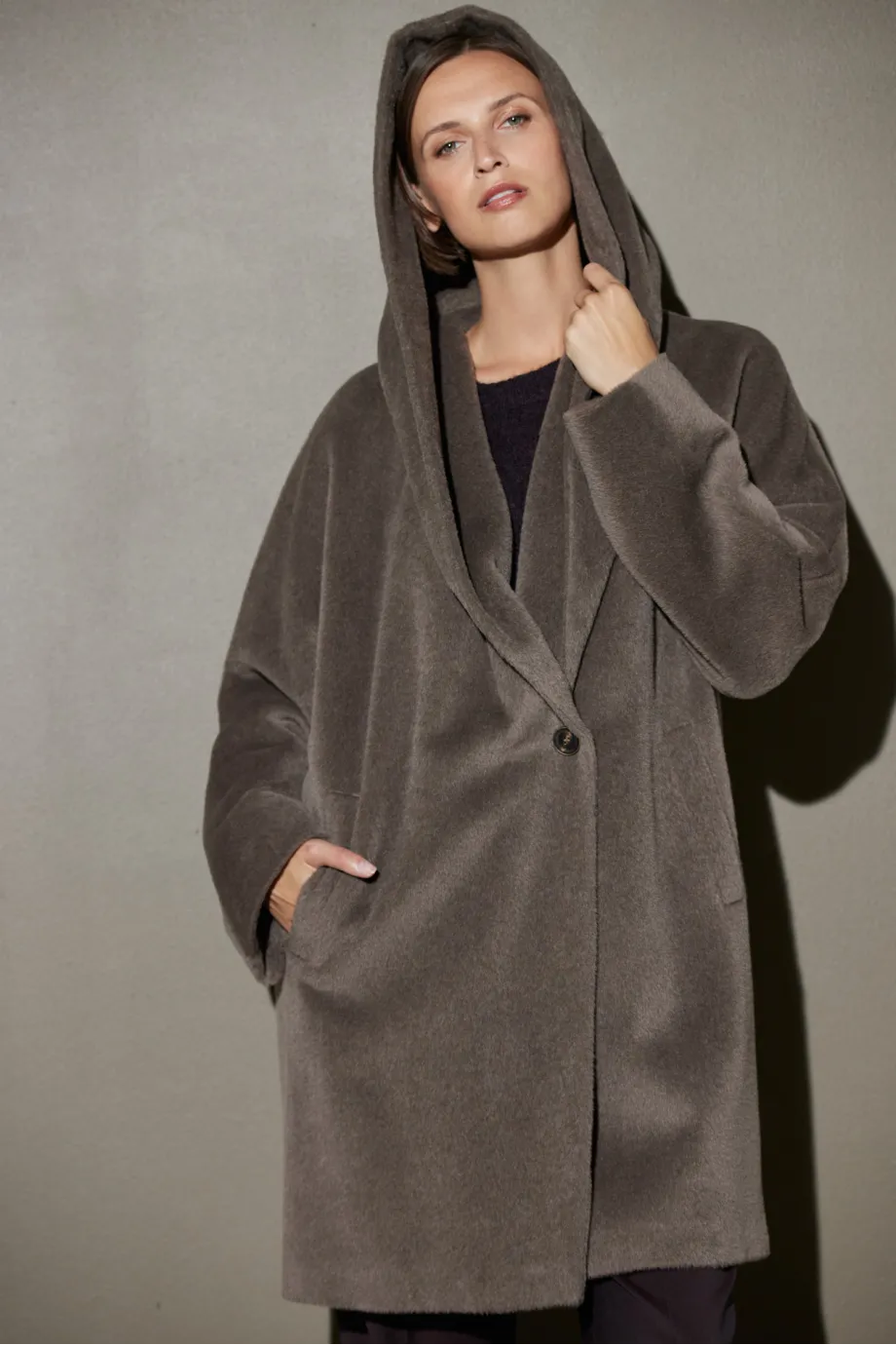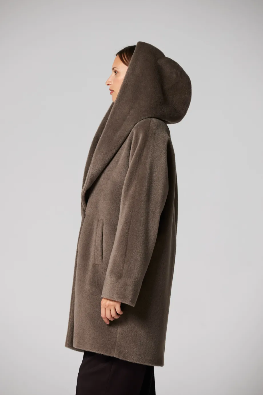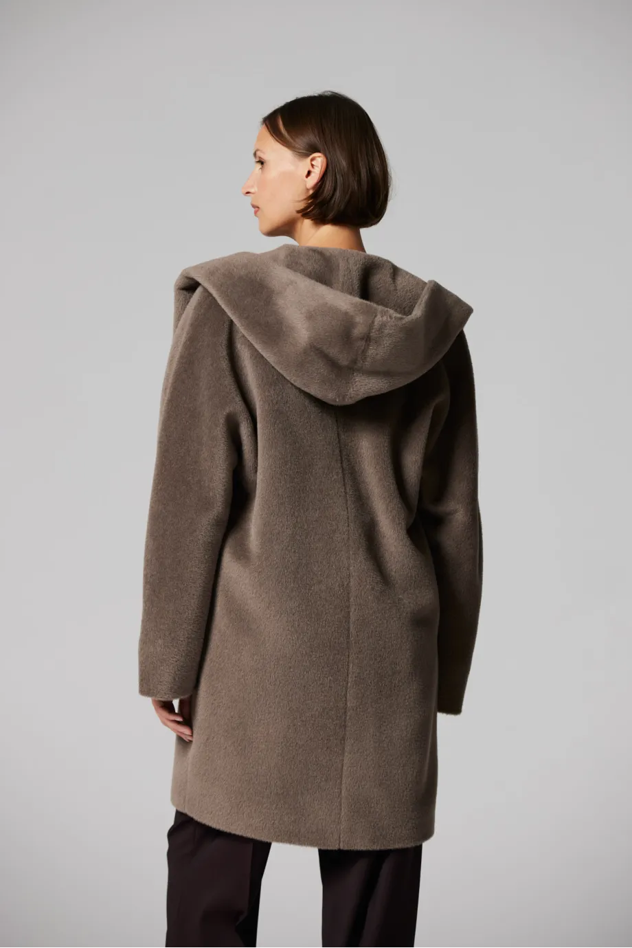 Kurzer Wollmantel mit Kapuze aus Suri-Alpakawolle