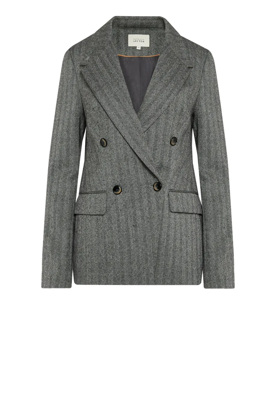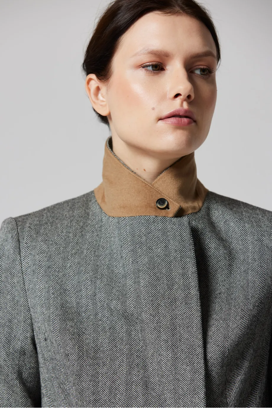 Fischgrätgewebter Stoff, unter dem Kragen Stoff in Kamel-Farbe
