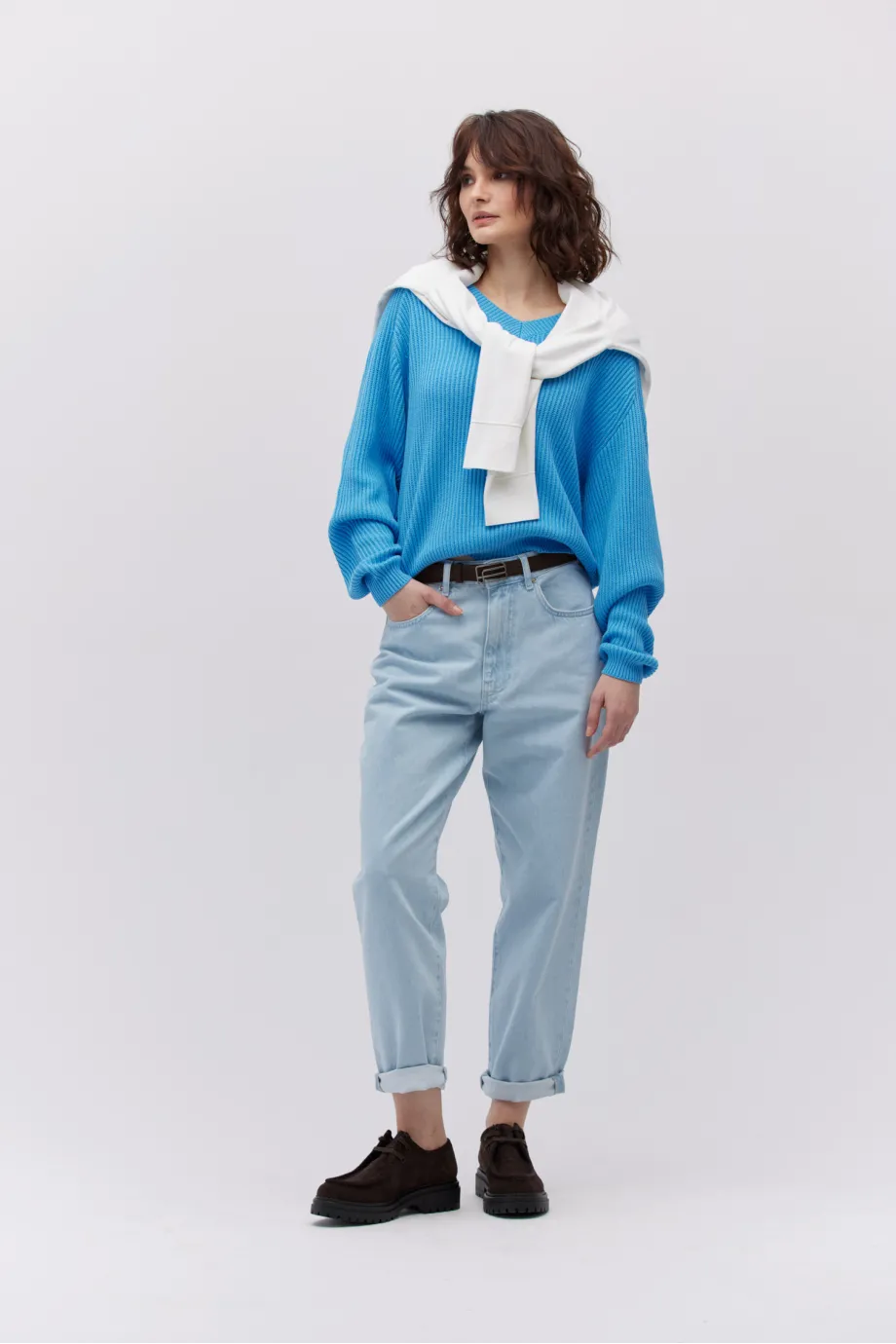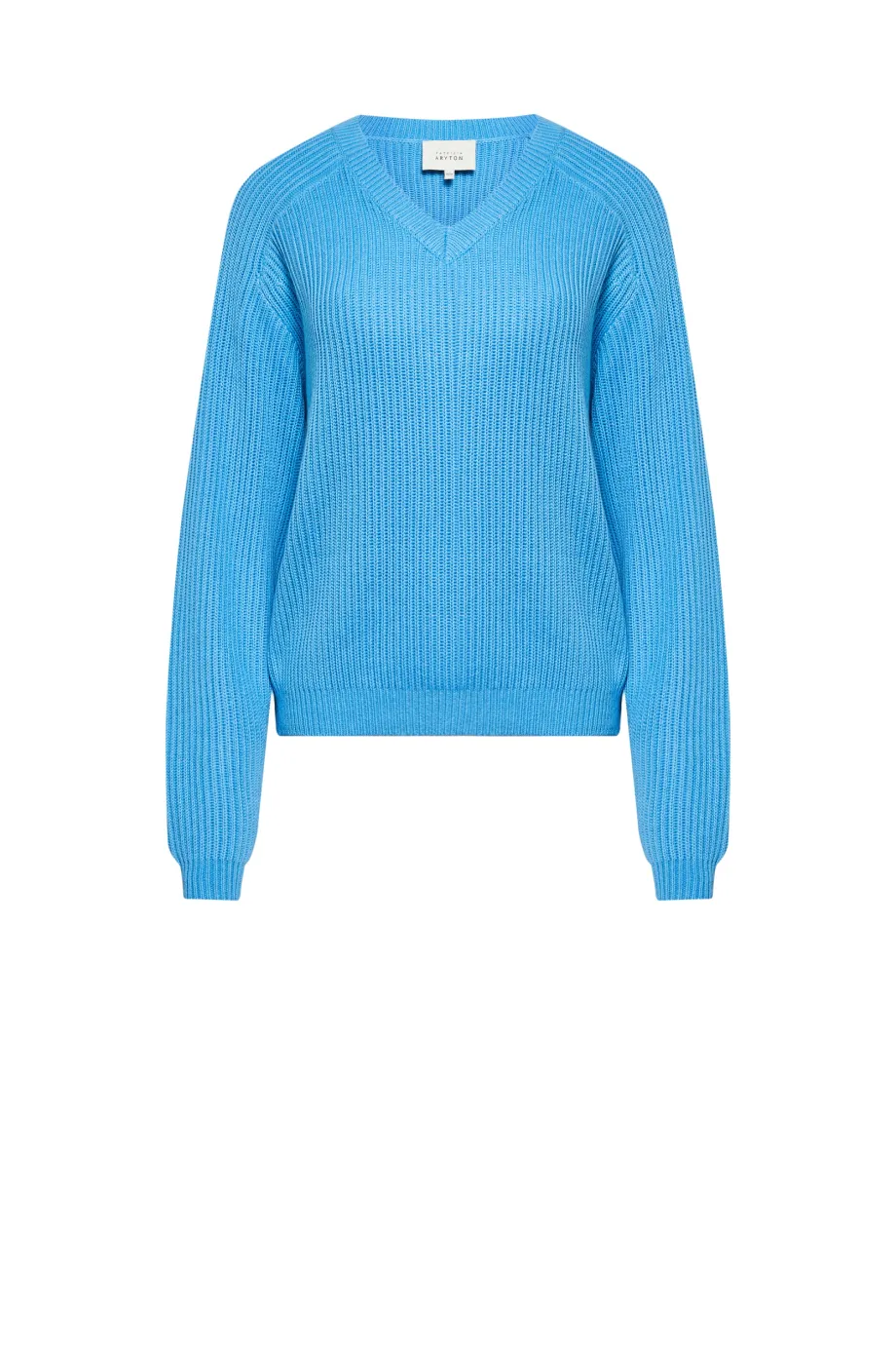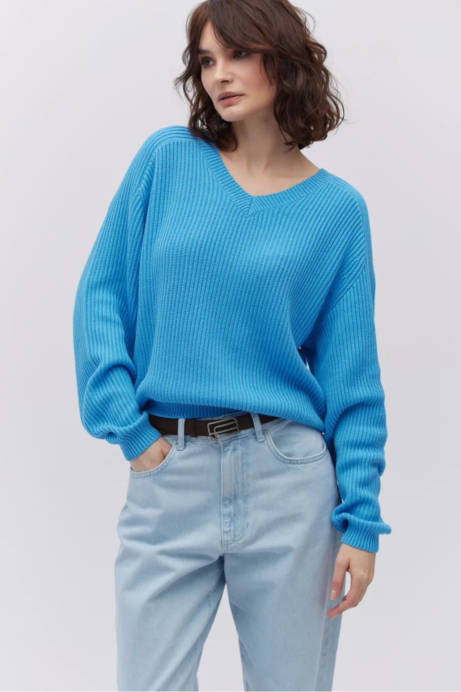 Locker geschnitten, V-Ausschnitt, lange Ärmel.