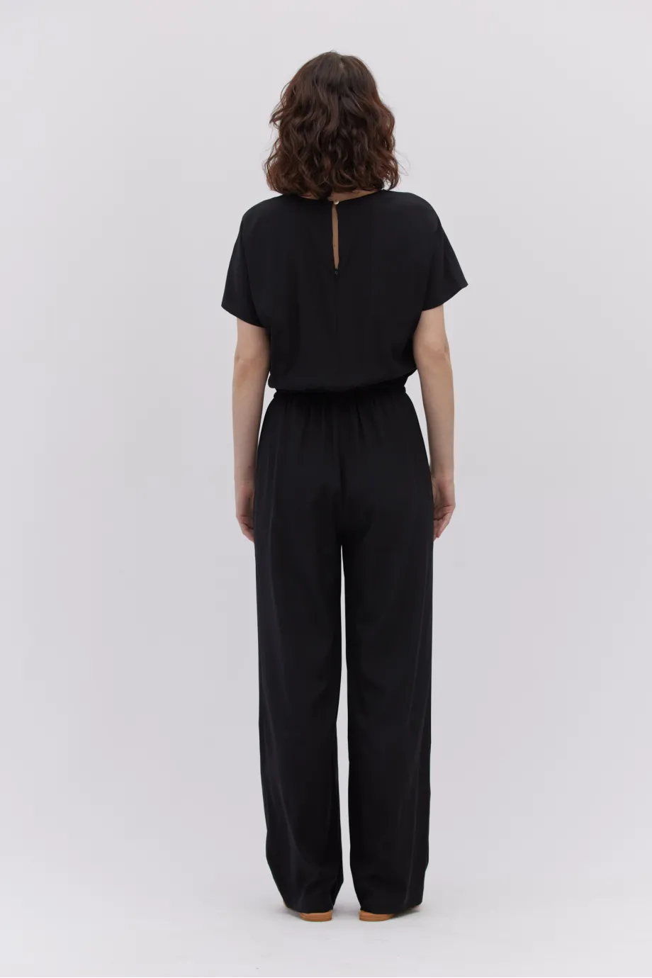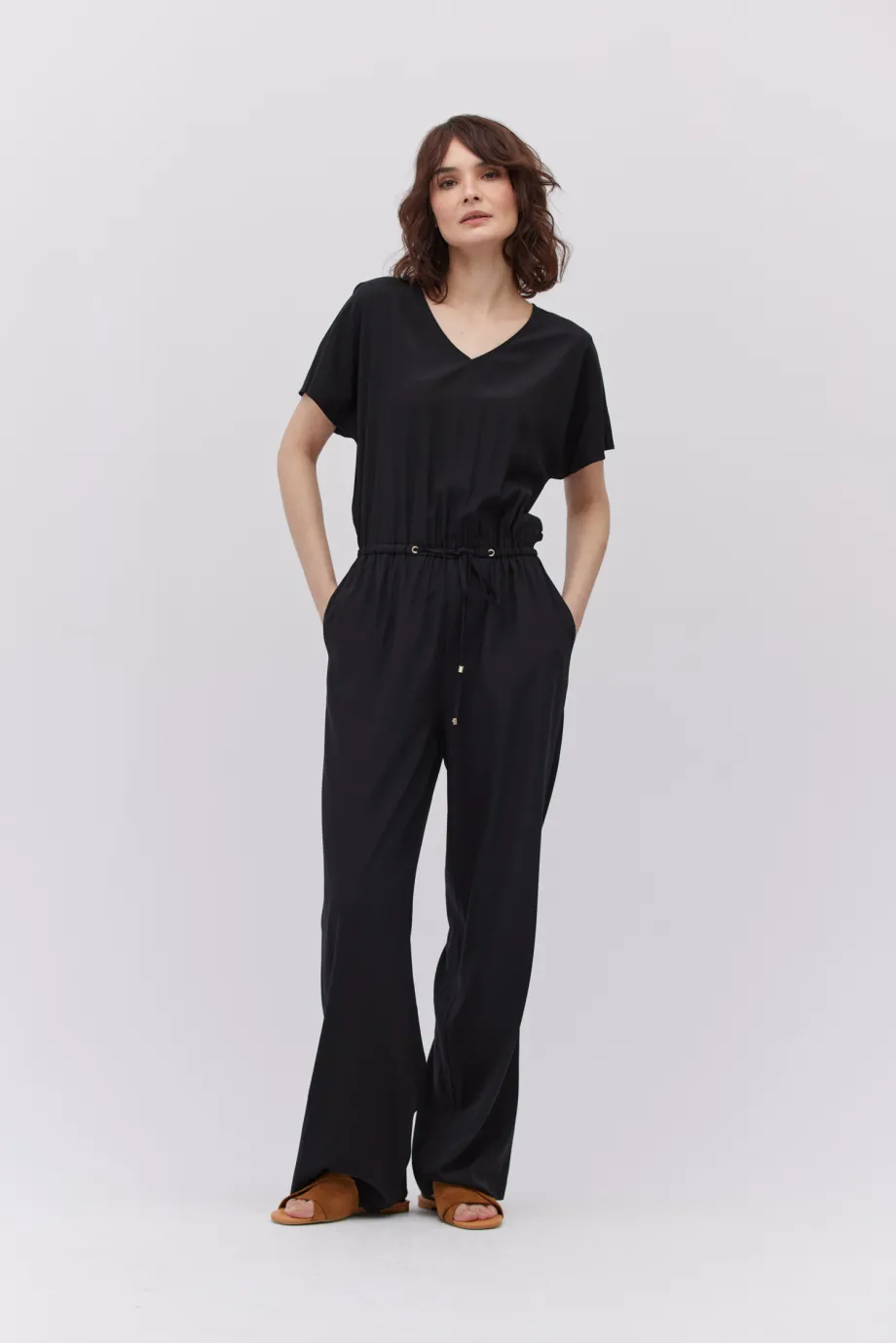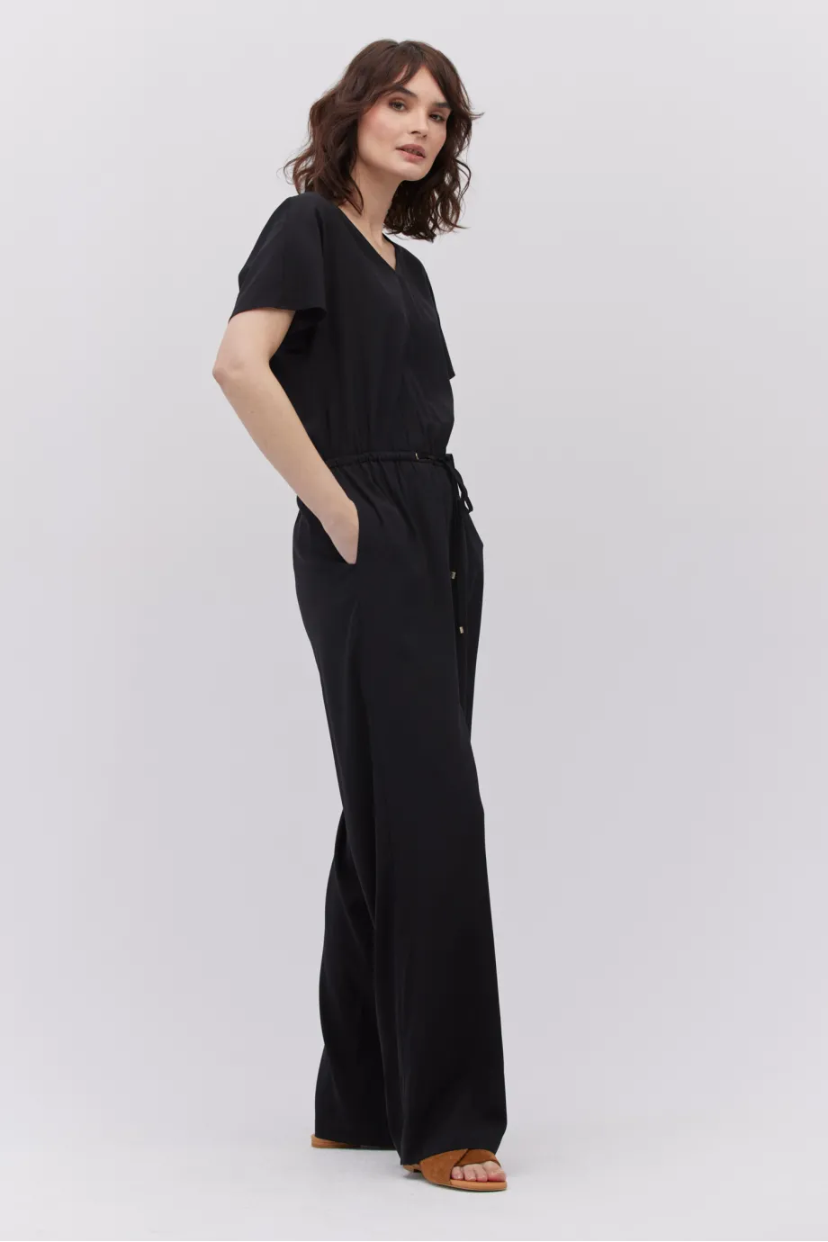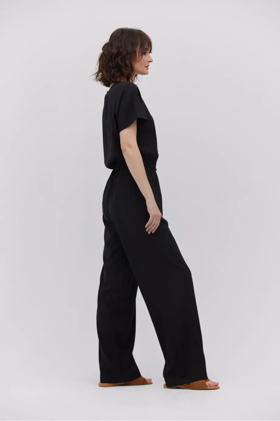 Betonte Taille, weiter Beinverlauf, Knopfverschluss hinten.