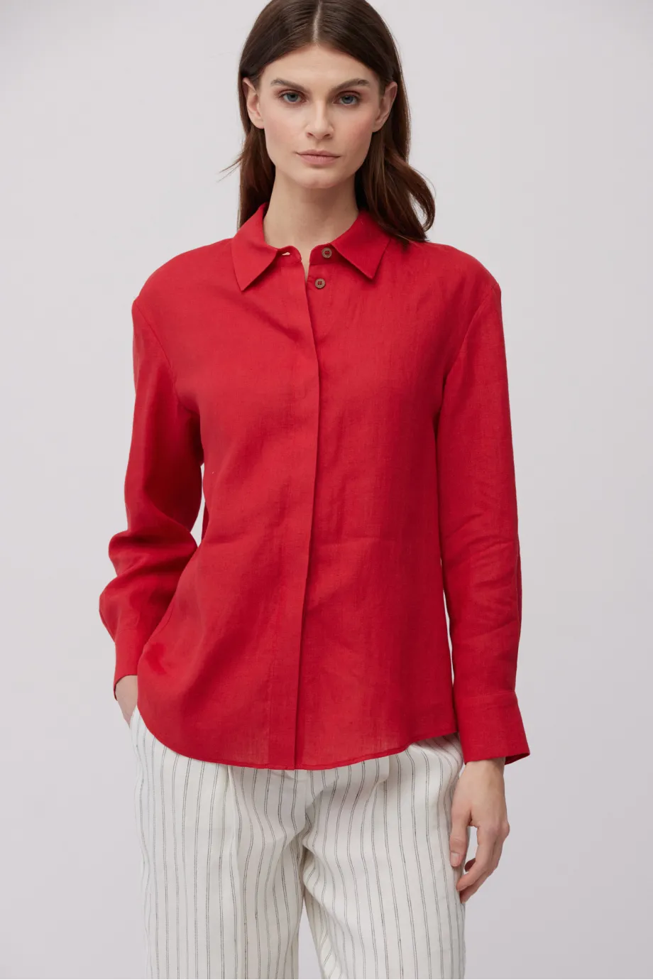 - Rotes Leinenhemd. Lockere Passform, lange Ärmel, klassischer Kragen