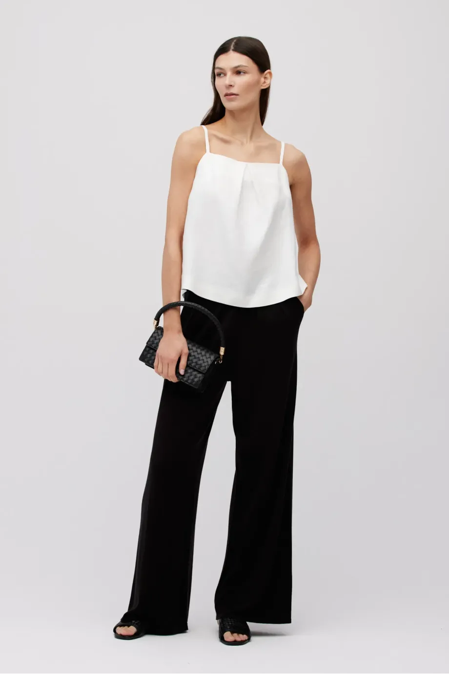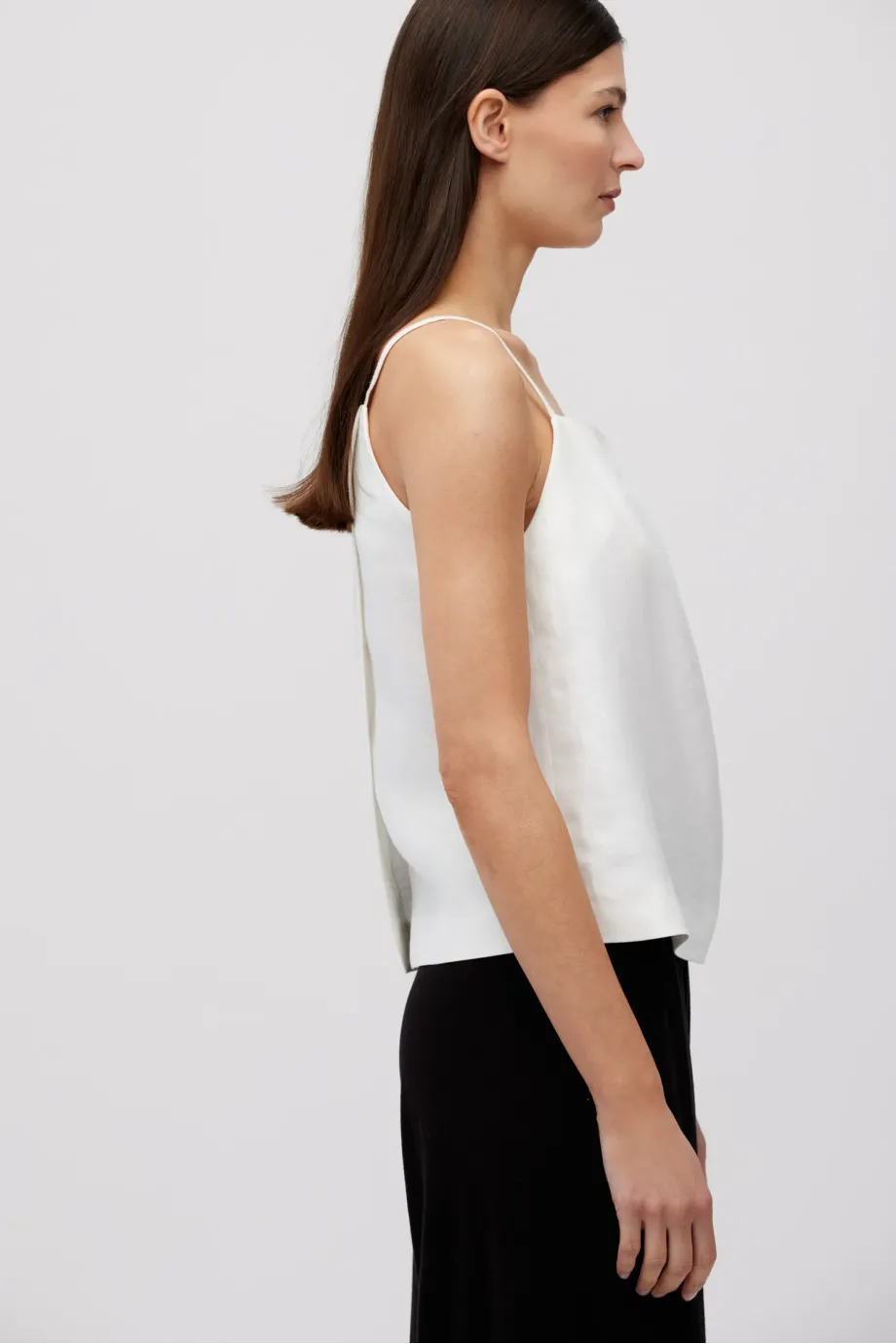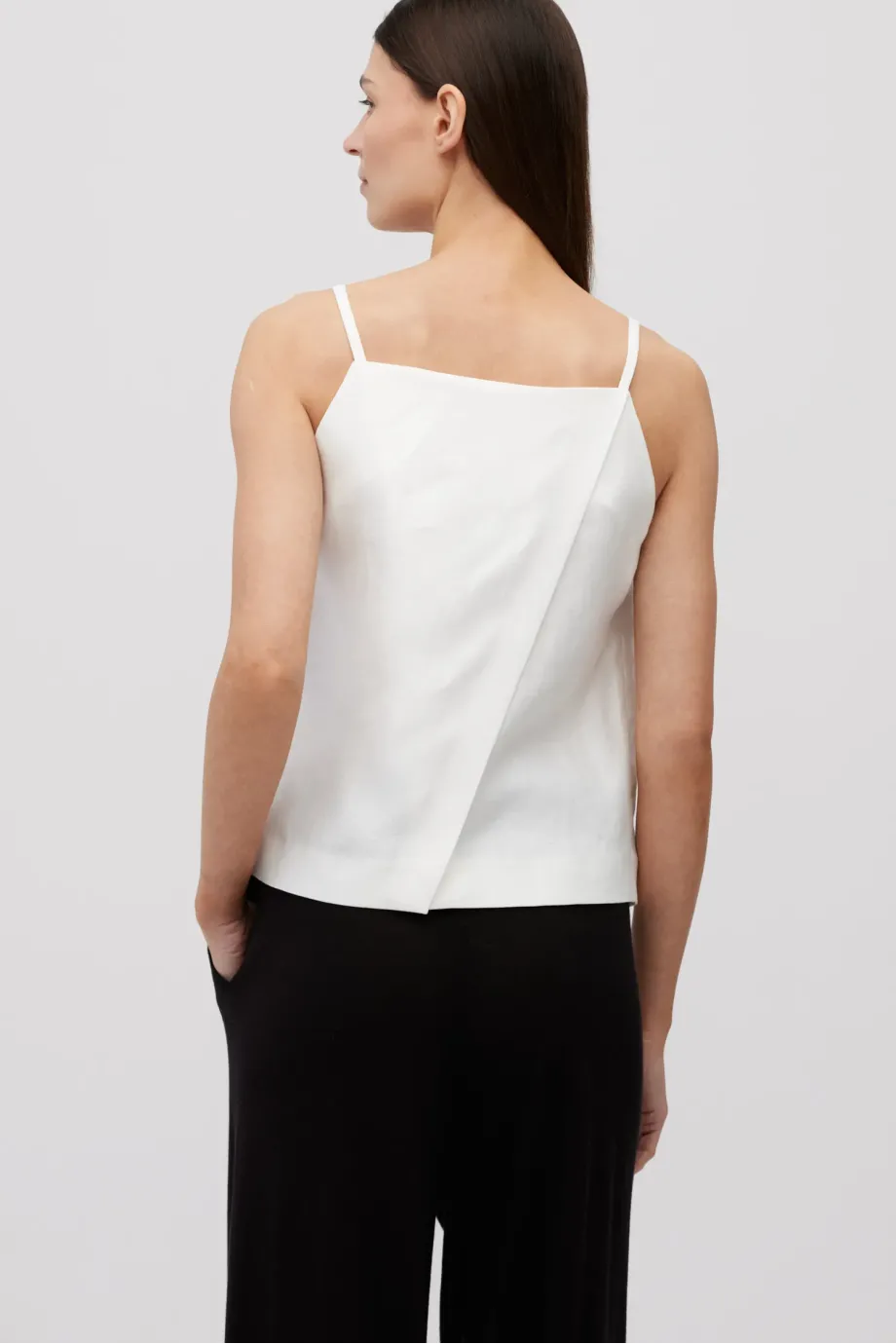 Weißes Leinen-Top. Lockerer, trapezförmiger Schnitt. Vorderseite mit Falte, Rückseite mit Wickel-Optik. Dünne Träger.