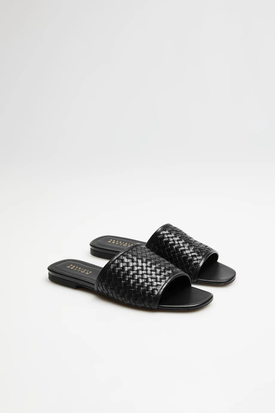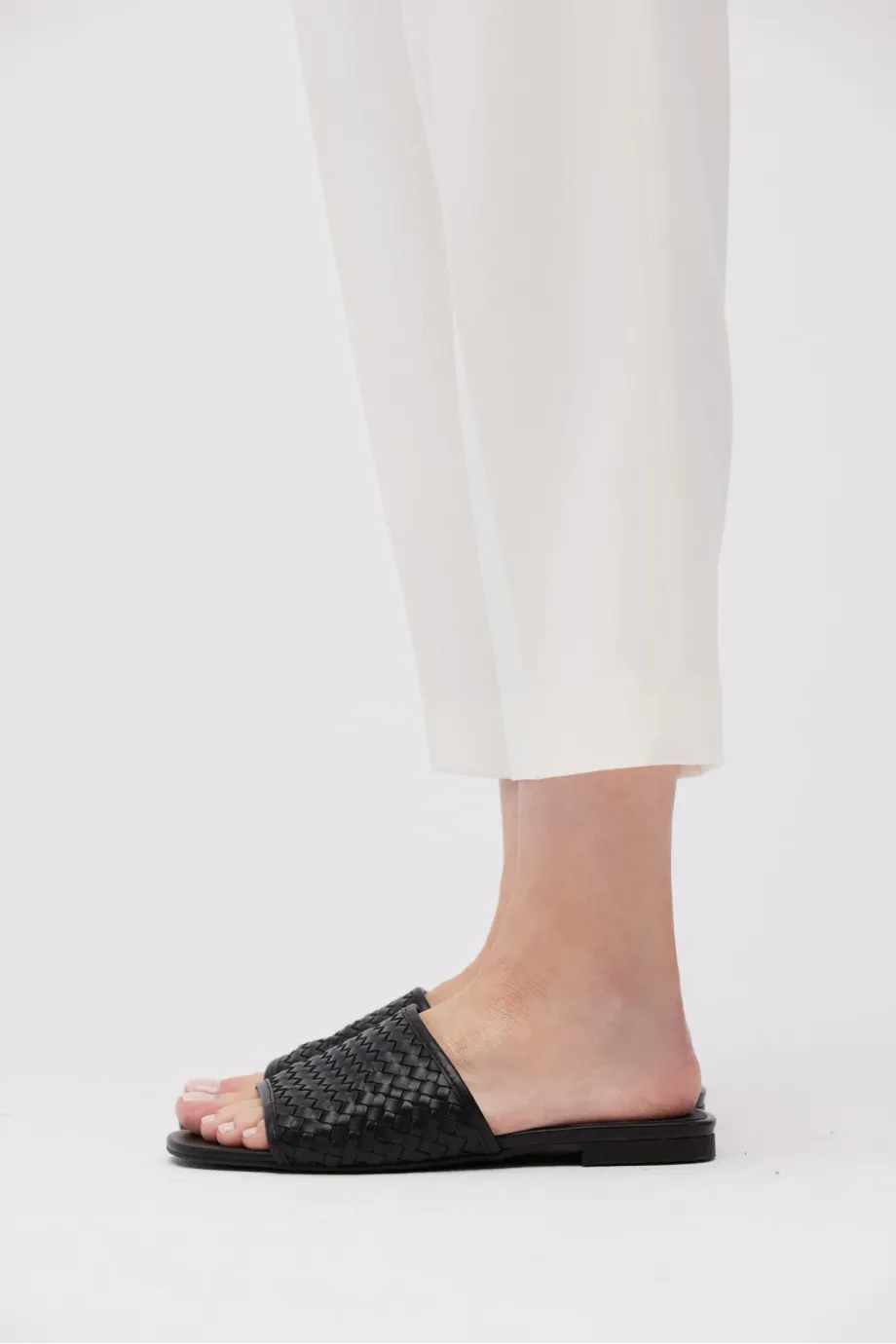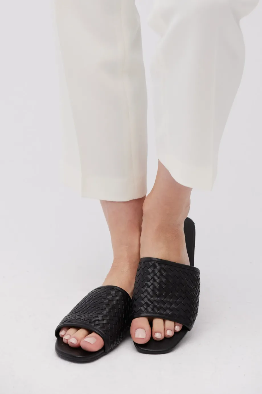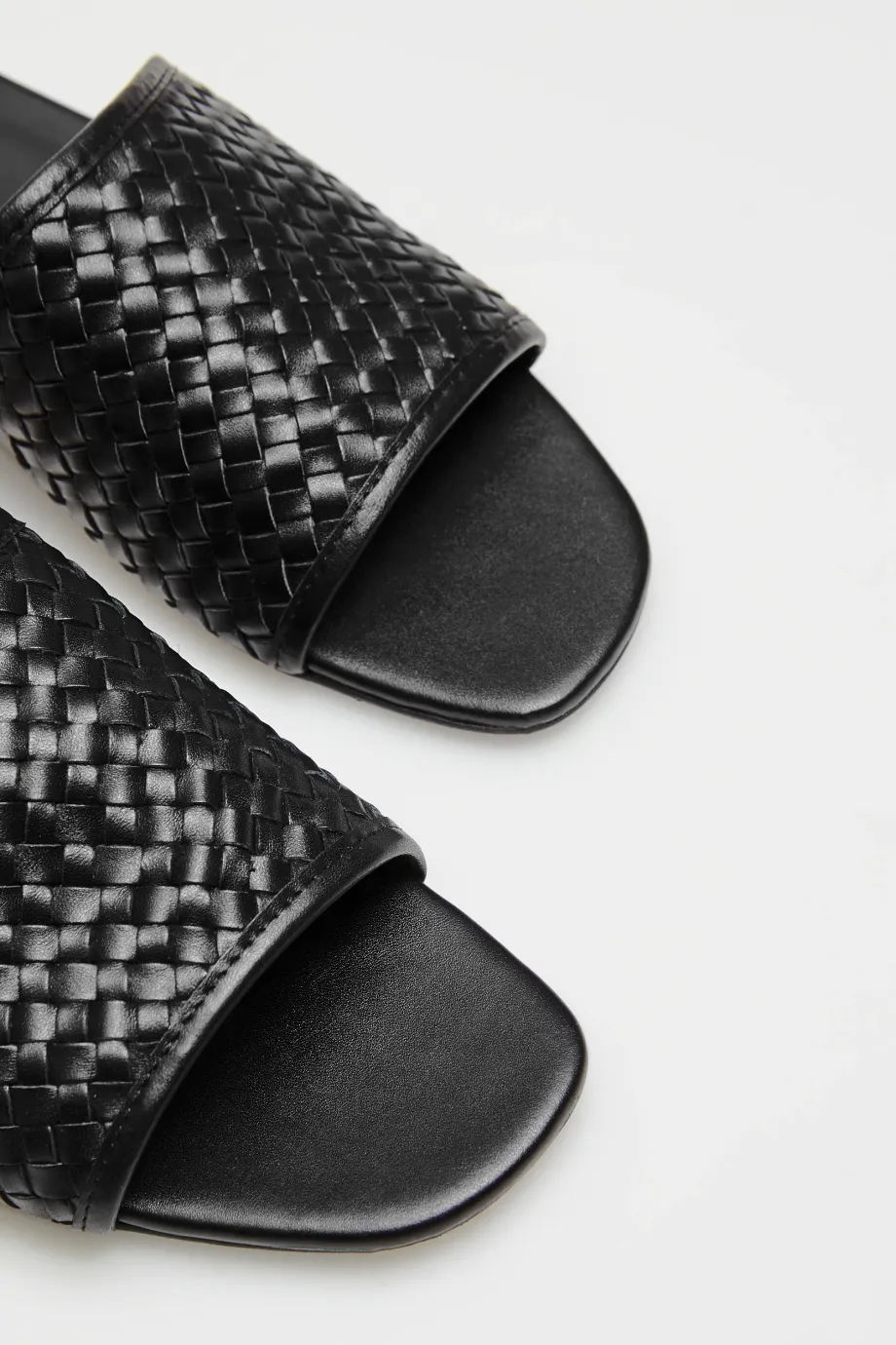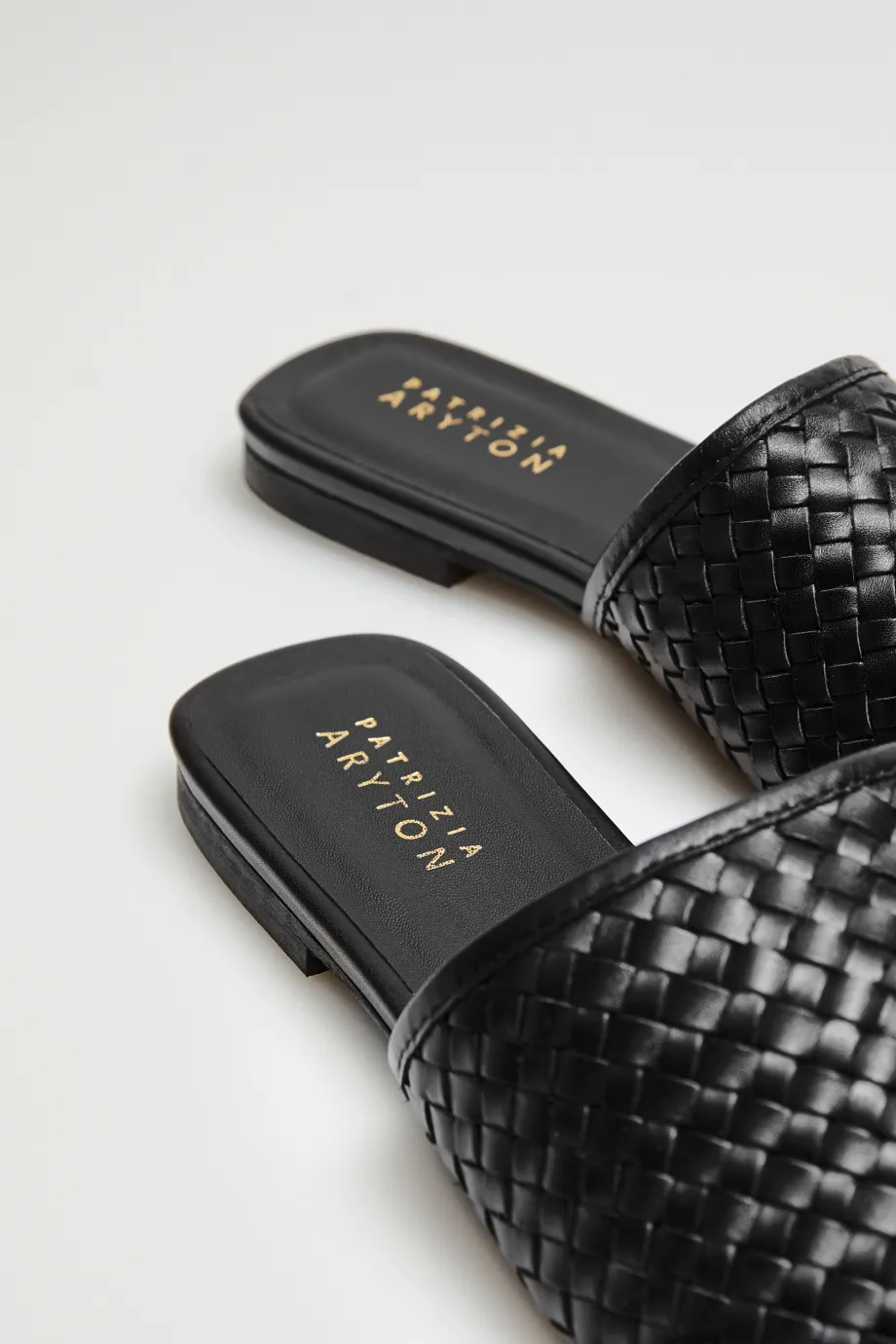 Schwarze Lederpantoletten aus geflochtenem Leder