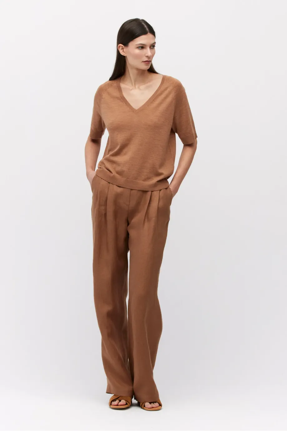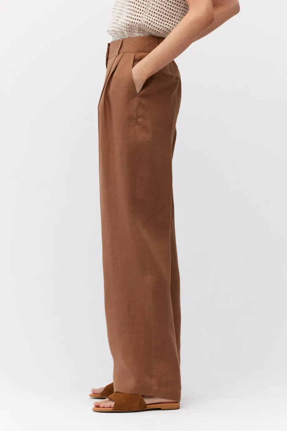 - Weite braune Leinenhose mit Bundfalten