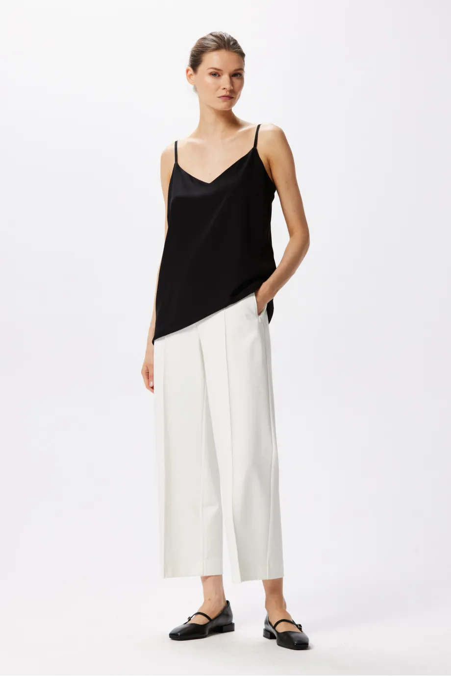 Die Seidenbluse mit Trägern ist unser Aushängeschild, das jede Saison in einer anderen Farbe erscheint. Diesmal gewinnt das kultige Top mit V-Ausschnitt einen tiefschwarzen Farbton. Es gibt keine Komposition, zu der es nicht passt, unabhängig vom bevorzugten Kleidungsstil. Das schwarze Seidentop mit Trägern ist ein unverzichtbares Basic im Kleiderschrank jeder Liebhaberin des Quiet Luxury-Trends.
