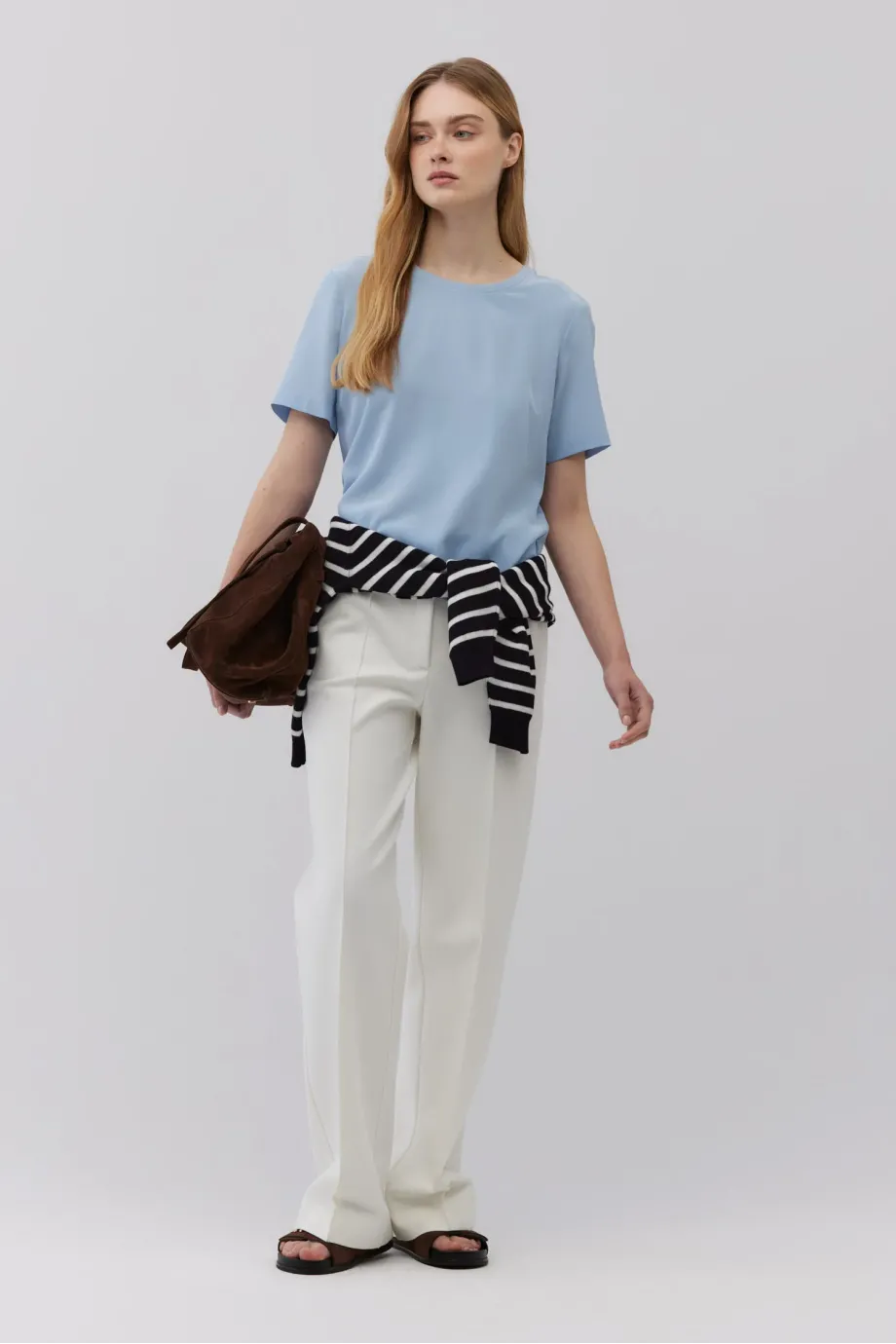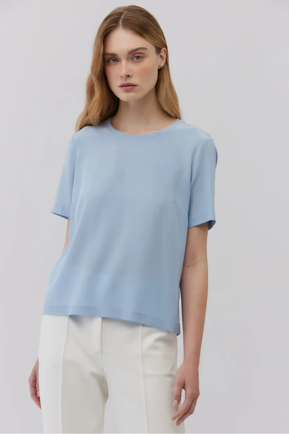 Bluse mit einer Vorderseite aus Seide und einem Rückenteil aus Strick. Gerader, leicht kastiger Schnitt. Rundhalsausschnitt. Kurze Ärmel.