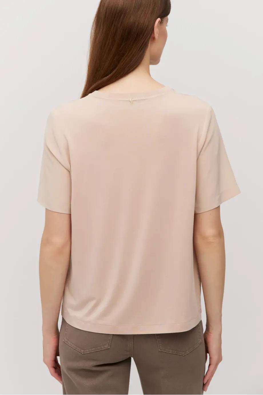 Bluse mit seidenfront und gestricktem Rücken. Gerader, leicht kastiger Schnitt. Rundhalsausschnitt. Kurze Ärmel.