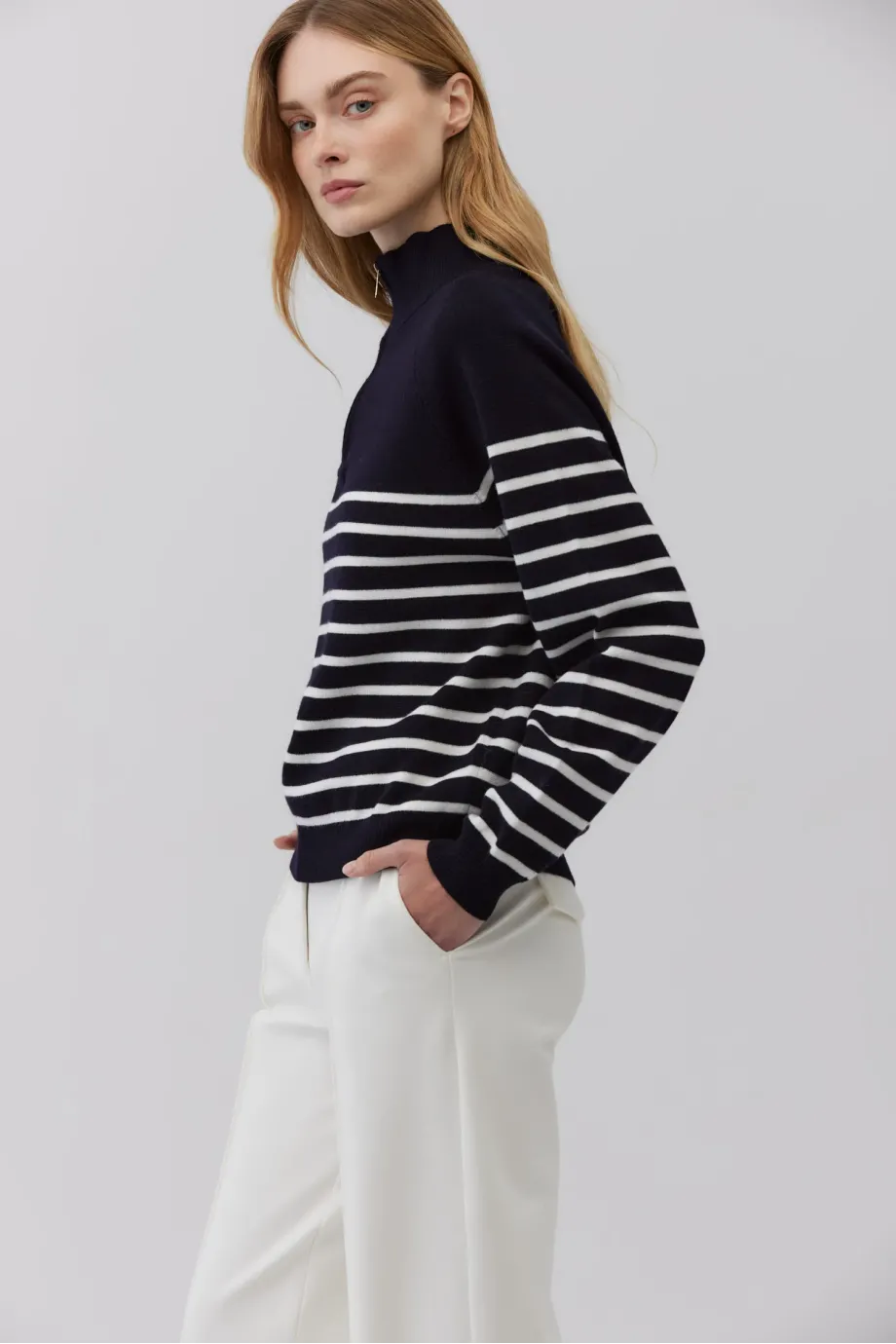 Marineblauer-weißer Pullover aus Merinowolle. Dichtes Gestrick mit tuck stitch Muster. Lockerer Schnitt mit hohem Stehkragen und Reißverschluss am Hals. Lange Ärmel mit Bündchen abgeschlossen.