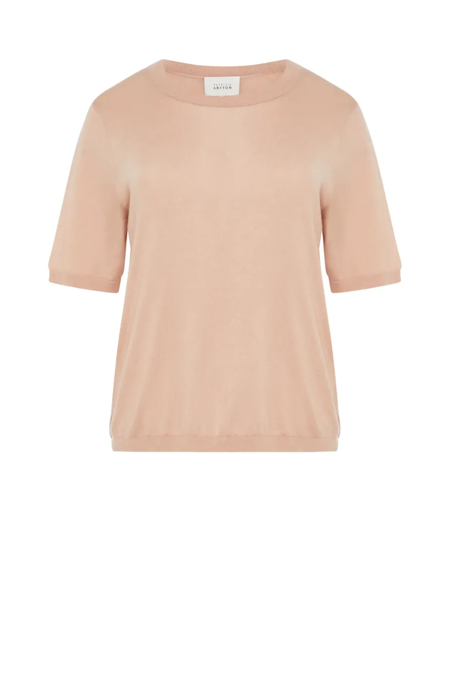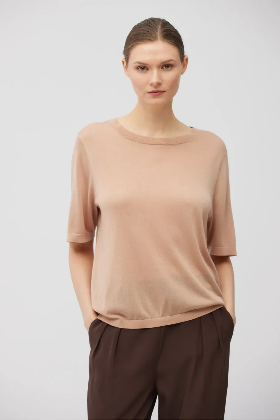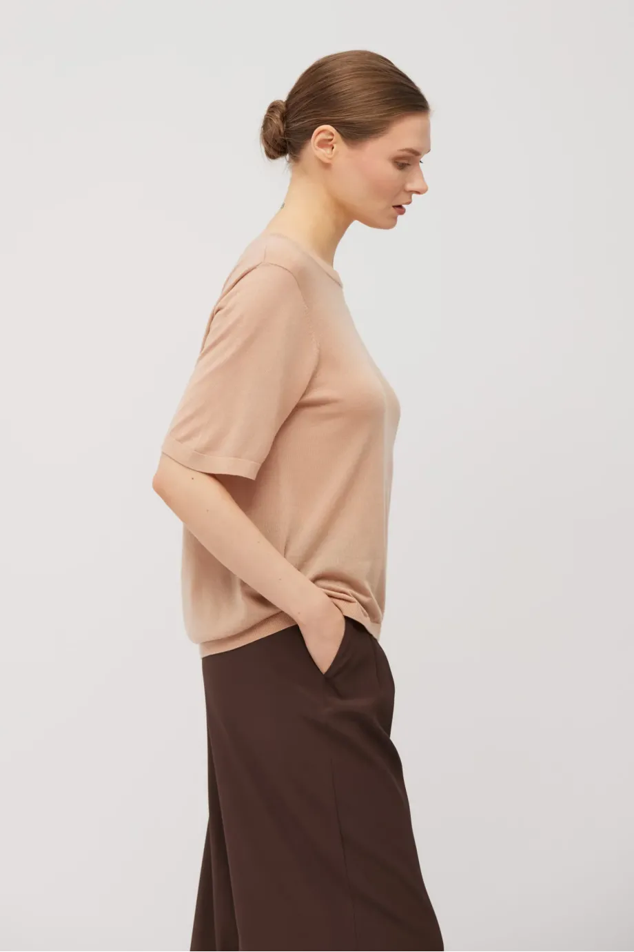 Strick-T-Shirt in puderrosa. Feine Mischung aus Kaschmir und Lyocell. Weicher und atmungsaktiver Stoff mit sehr feinem Single-Jersey-Gestrick, gefertigt auf einer Maschine mit 16 GG. Kurzer Ärmel, rundhals, klassische Form.