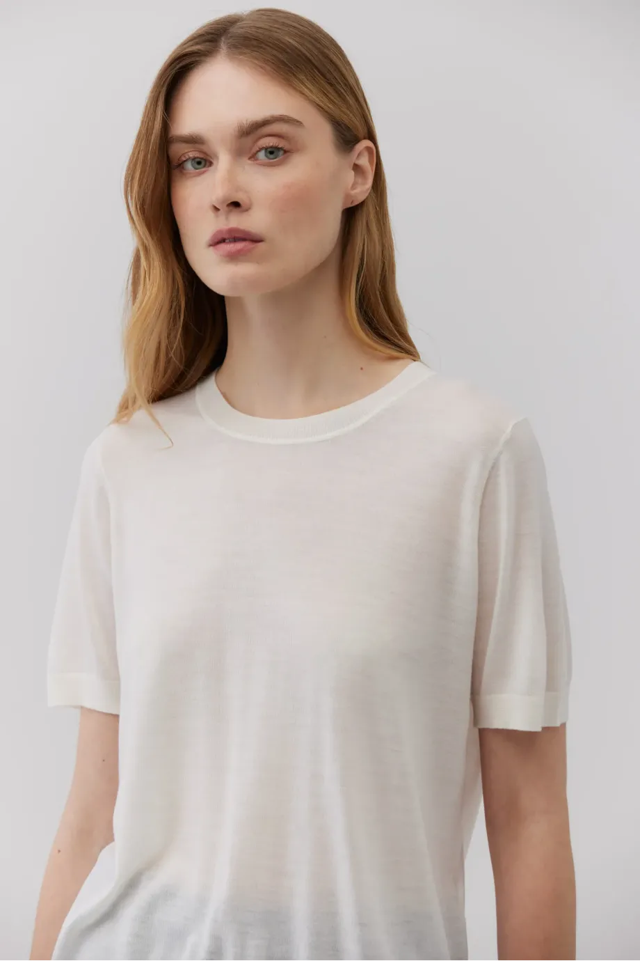Weißes T-Shirt aus Merinowolle. Rundhalsausschnitt. Kurze Ärmel. Weiches, leicht transparentes Gestrick. Feiner und dichter Jersey-Strick. Schlichte, klassische Passform. Erhältlich in 2 Farben.