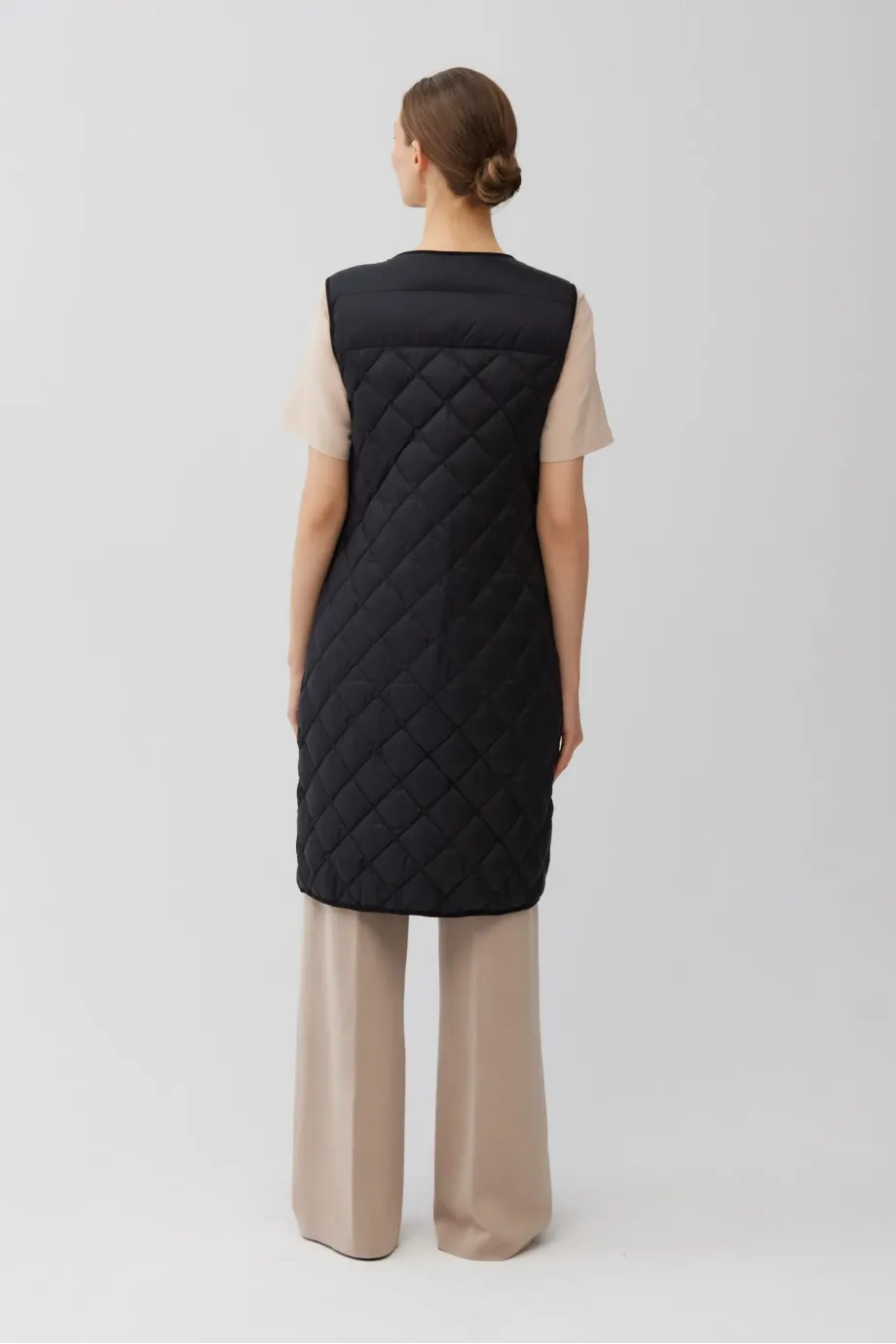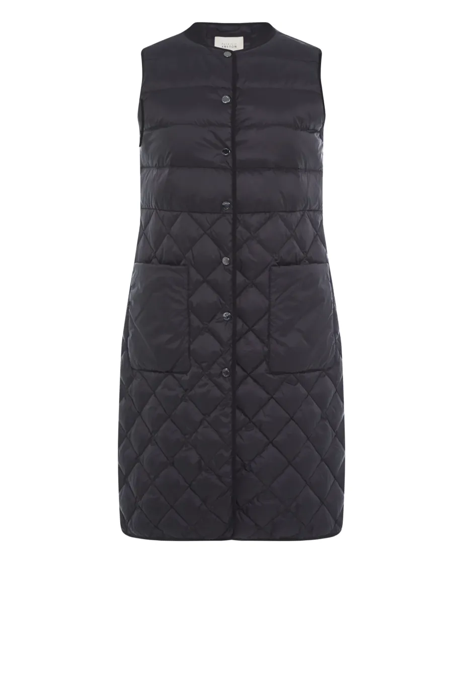 Leichte Weste mit natürlicher, daunenartiger Füllung. Mit Druckknöpfen zu schließen. Aufgesetzte Taschen vorne. Schlichte Passform – zum Alleintragen oder als Wärmeschicht unter dem Mantel. Farbe: Schwarz.