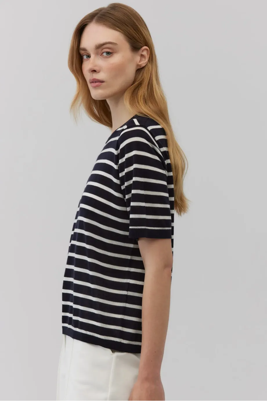 Klassisches T-Shirt mit Kaschmir. Schlichte, leicht lockere Passform. Kurze Ärmel. Rundhalsausschnitt. Horizontale Streifen – weiß auf dunkelmarineblau. Maritimer Stil. Weiche Maschenware mit feinem, dichtem Single-Jersey-Gestrick.