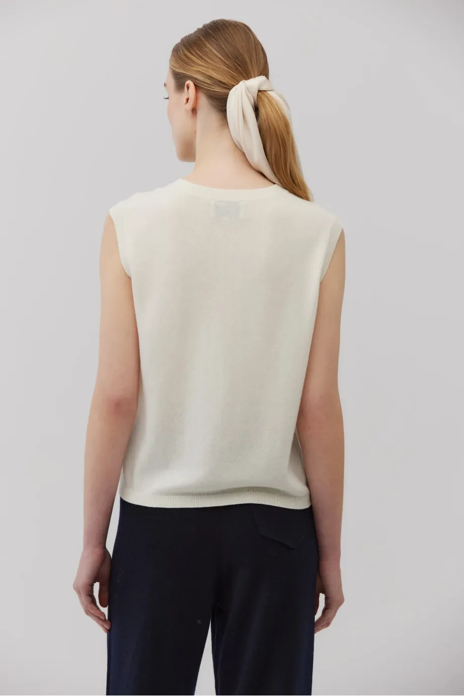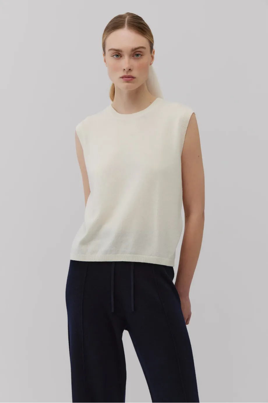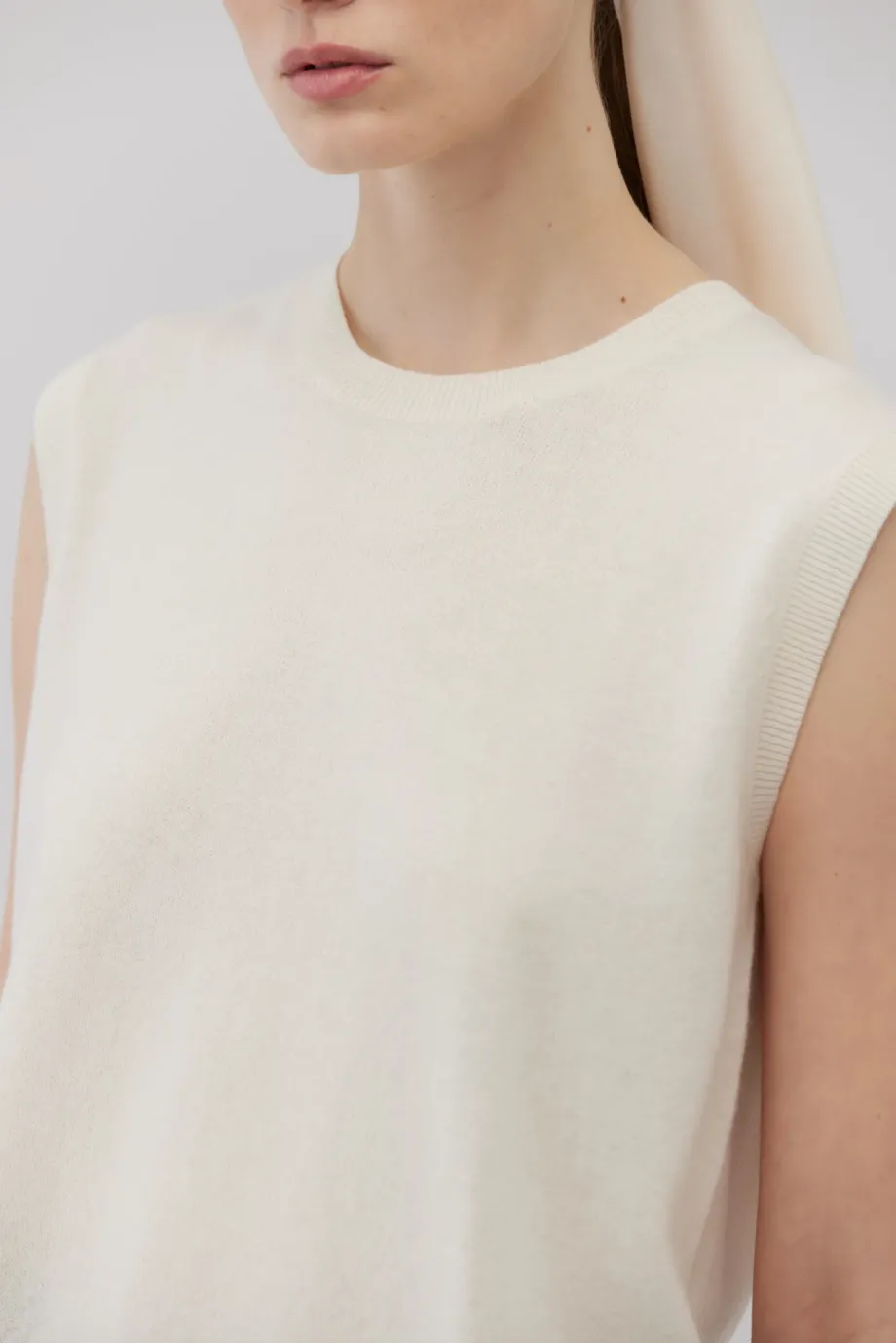 Weiches Top ohne Ärmel mit Rundhalsausschnitt. Gerade, leicht taillierte Passform. Hergestellt aus Strick mit Kaschmiranteil. Single Jersey-Geflecht. Farbe: Weiß.