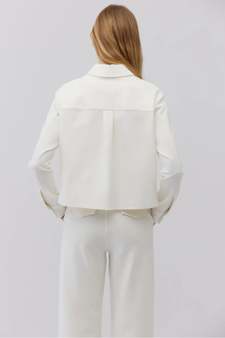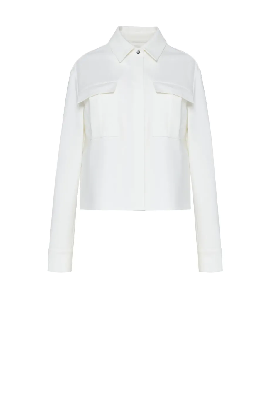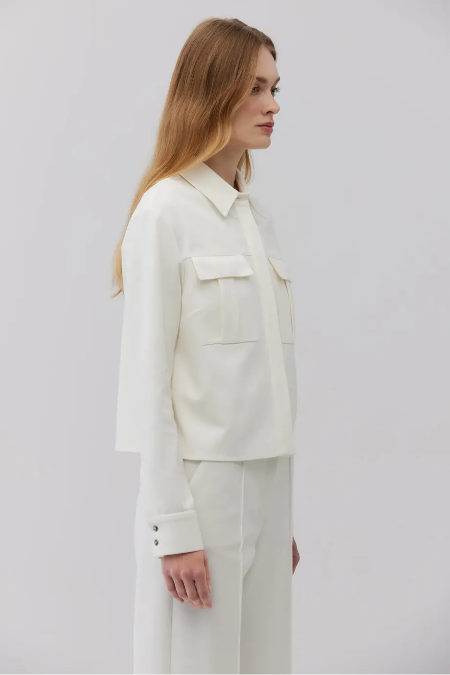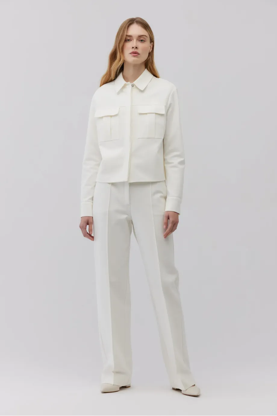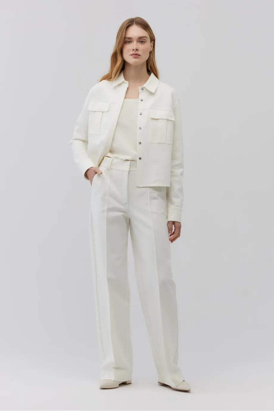 Weißer Blazer im Hemdenstil. Schlichte, leicht kastige Passform. Taschen mit Klappen. Druckknopfverschluss. Passend dazu Hose.