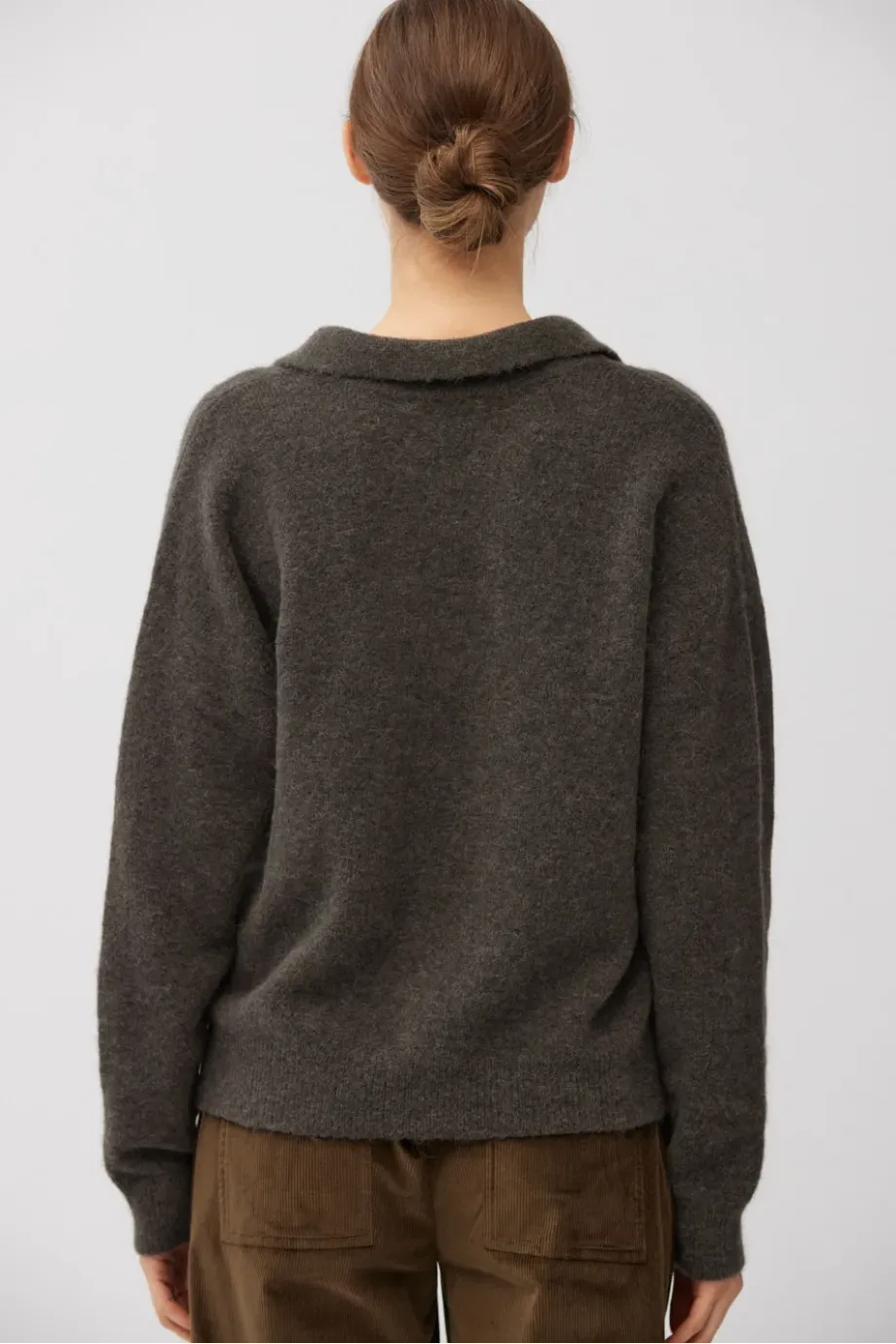 Kurze Form mit langen Ärmeln und V-Ausschnitt. Hergestellt in single jersey-Strickart an einer Maschine mit einer Maschenweite von 7 GG. Weiche Strickware mit Alpakawolle. Farbe: gedämpftes Braun.