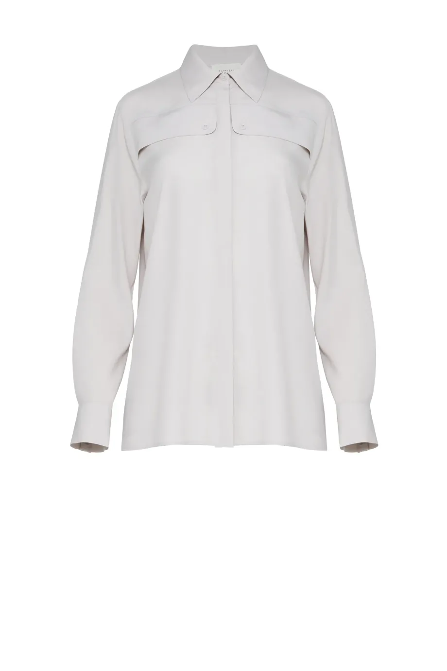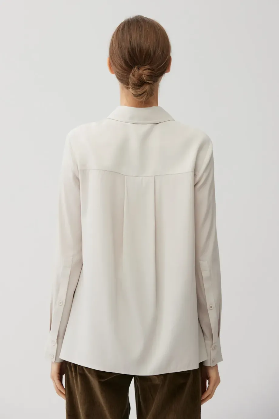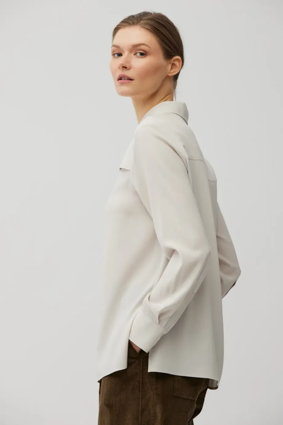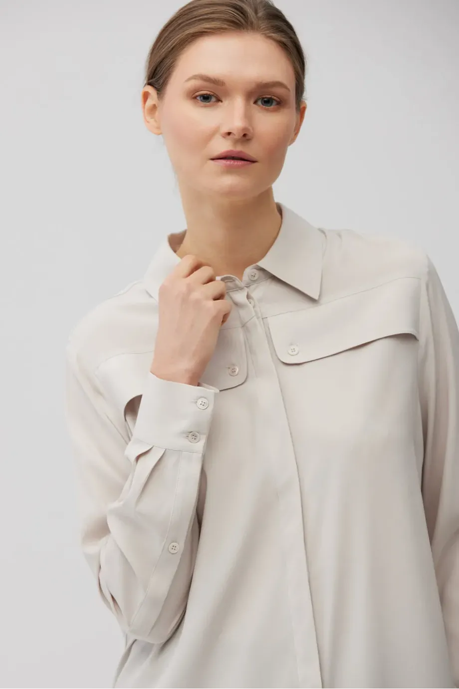 Seidenhemd. Lockerer Schnitt. Klassischer Kragen. Lange Ärmel mit Manschetten. Mit Knöpfen verschließbar. Beige Farbe.