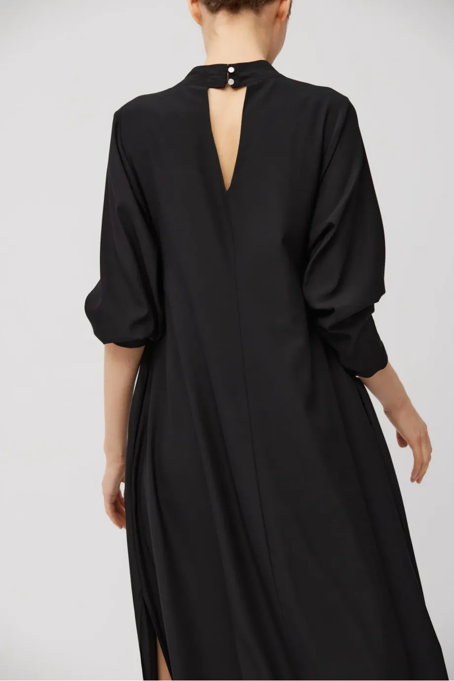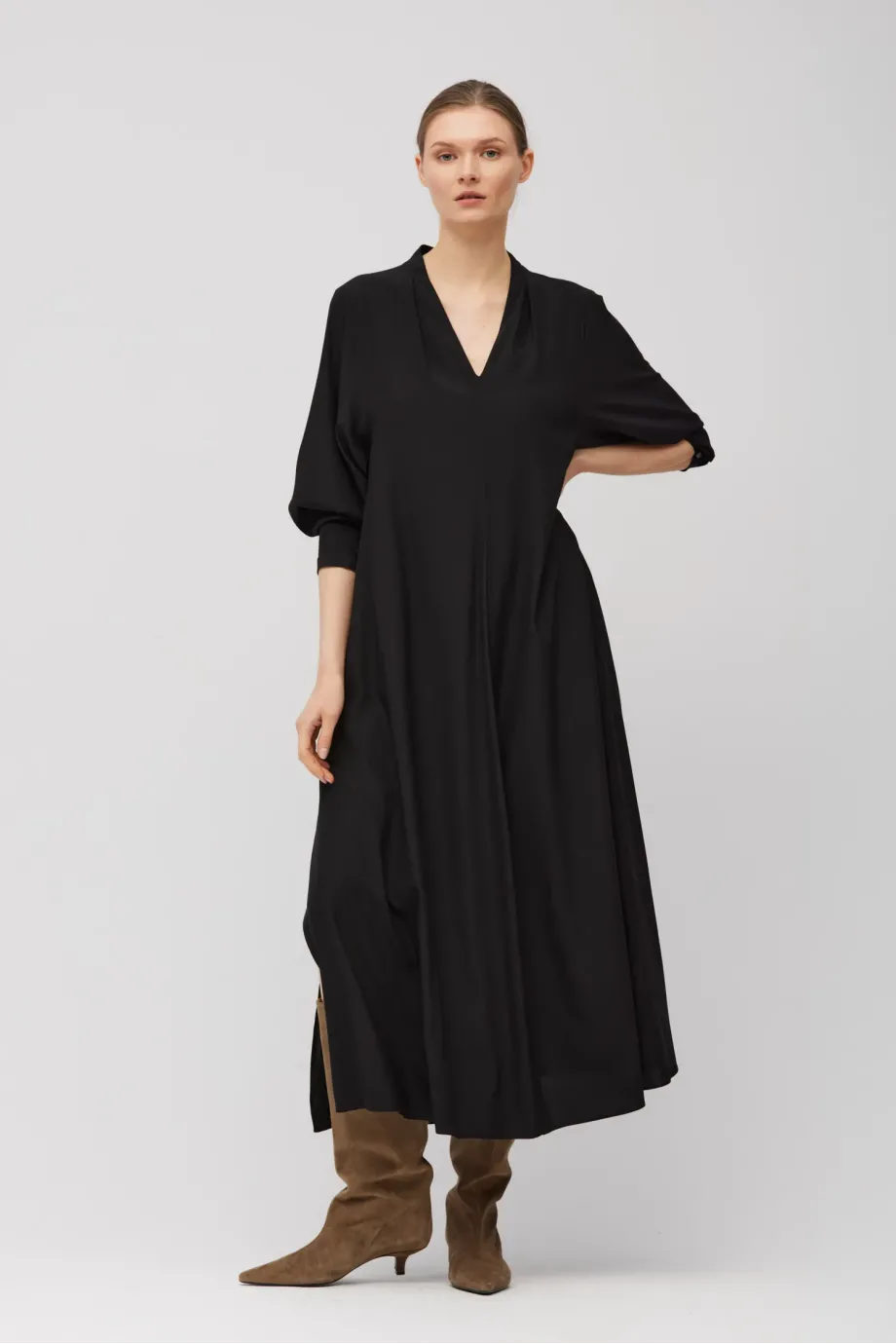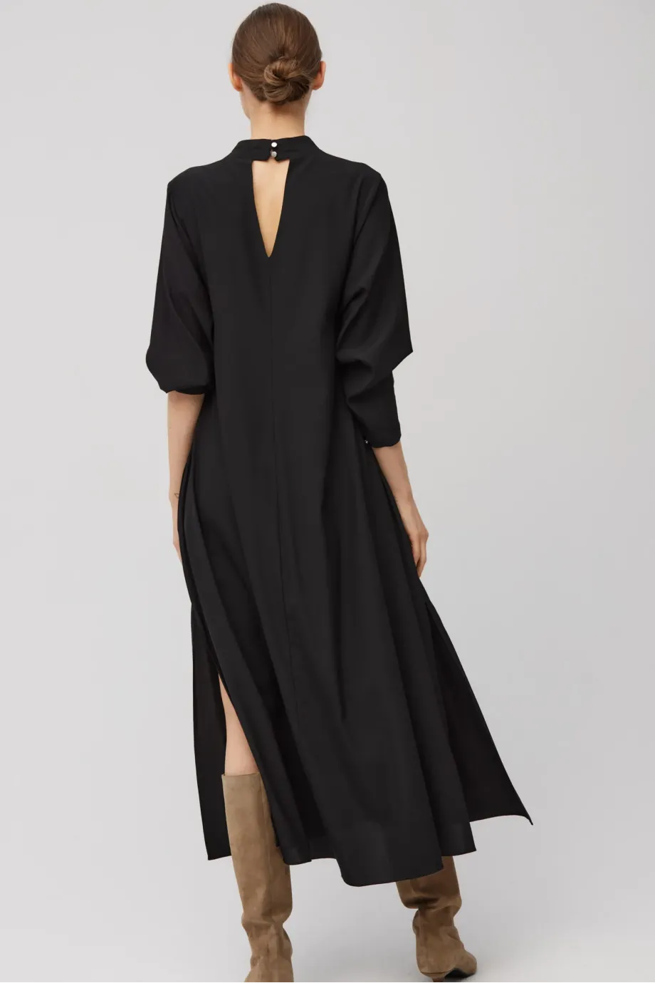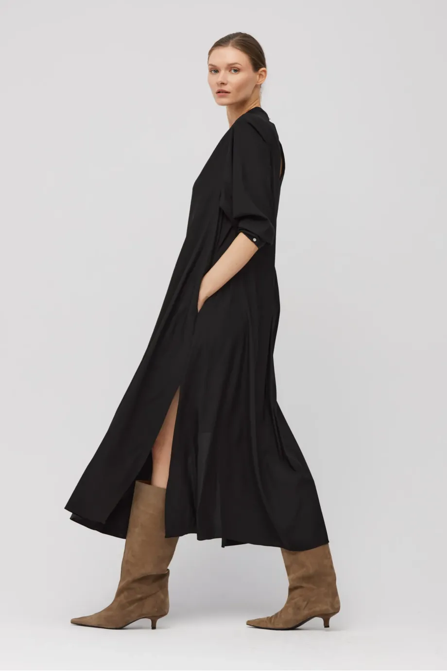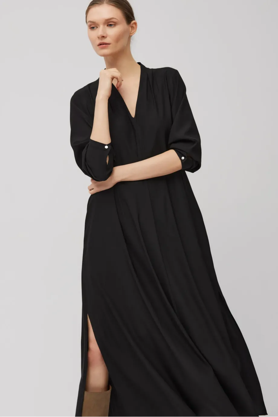 Schwarzes Midikleid aus Seide. Leicht ausgestellter Schnitt mit V-Ausschnitt. 3/4-Ärmel mit Knopfverschluss. Tiefe Seitenschlitze. Rücken mit Knopfverschluss. Taschen in den Seitennähten.