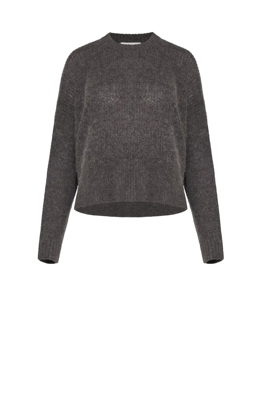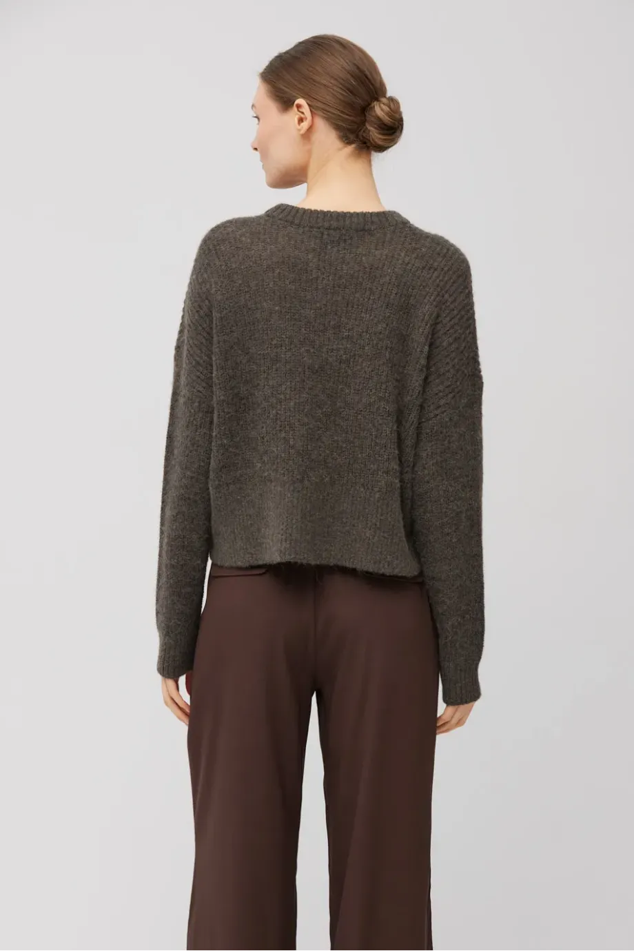 Schnitt mit rundem Ausschnitt und langen Ärmeln. Aus plain knit Masche gefertigt an einer 3 GG Maschine. Strickware mit Alpaka-Wolle – warm und flauschig. Farbe: gedämpftes Braun.