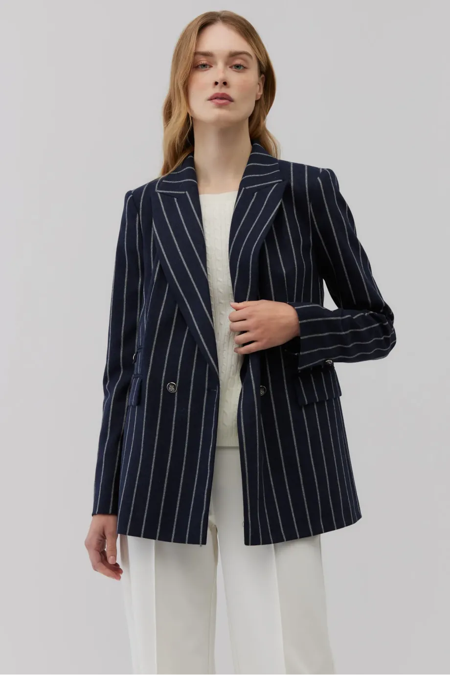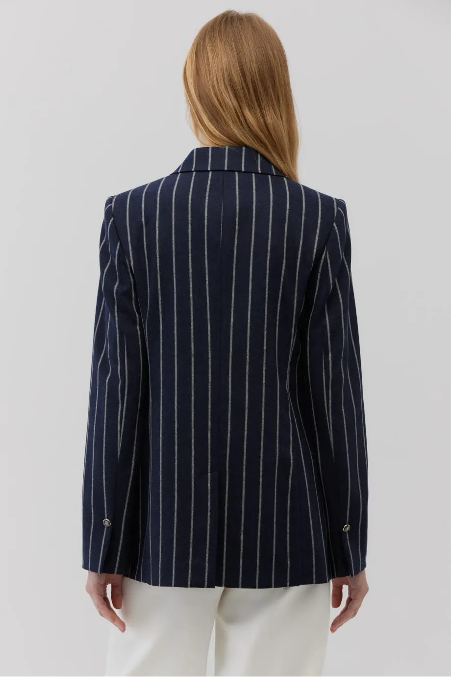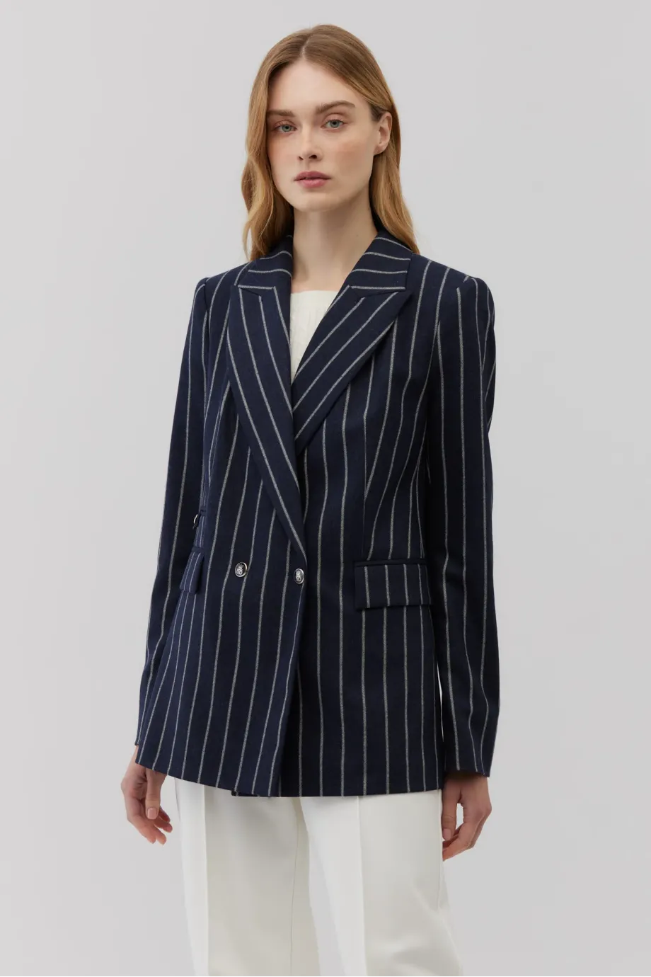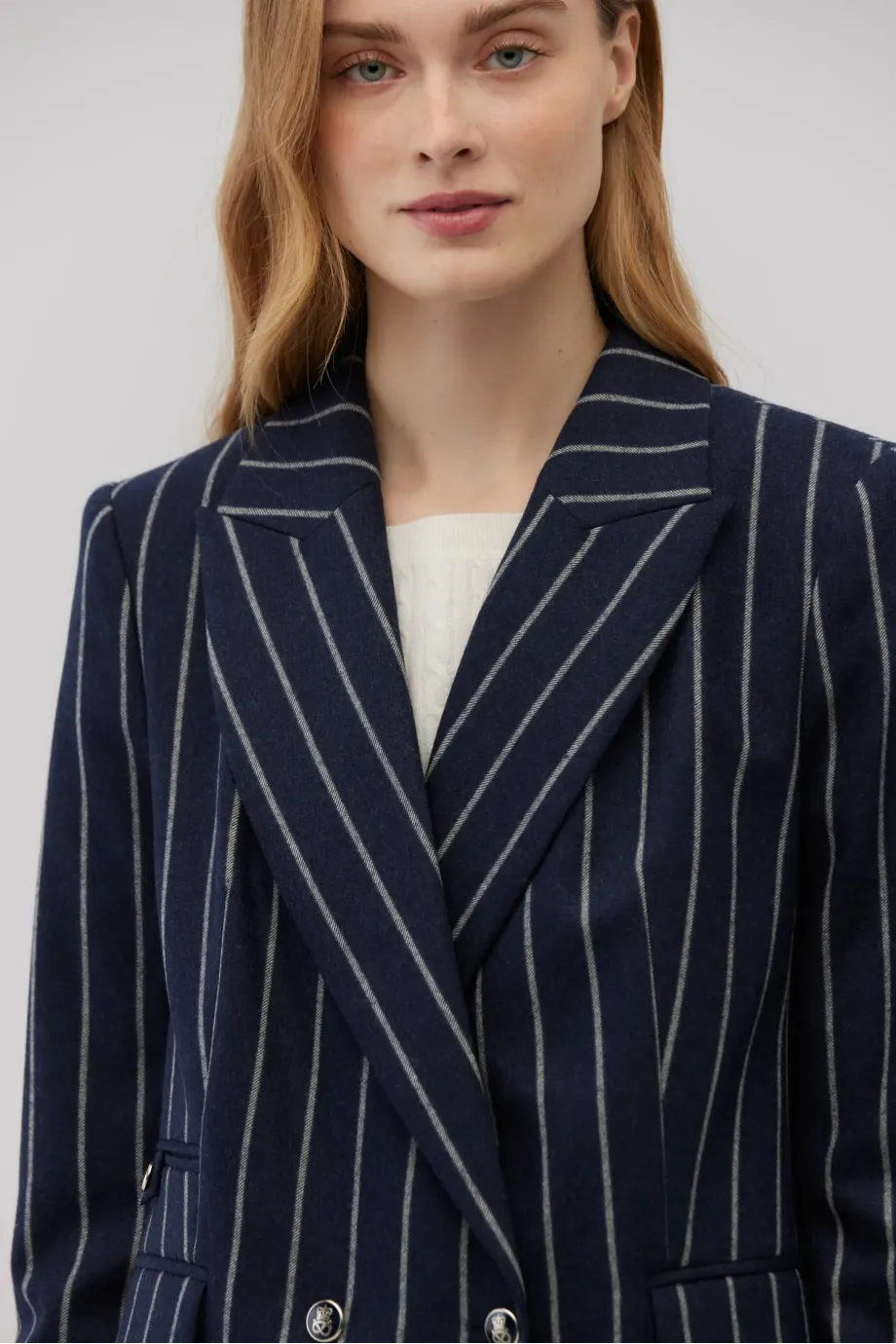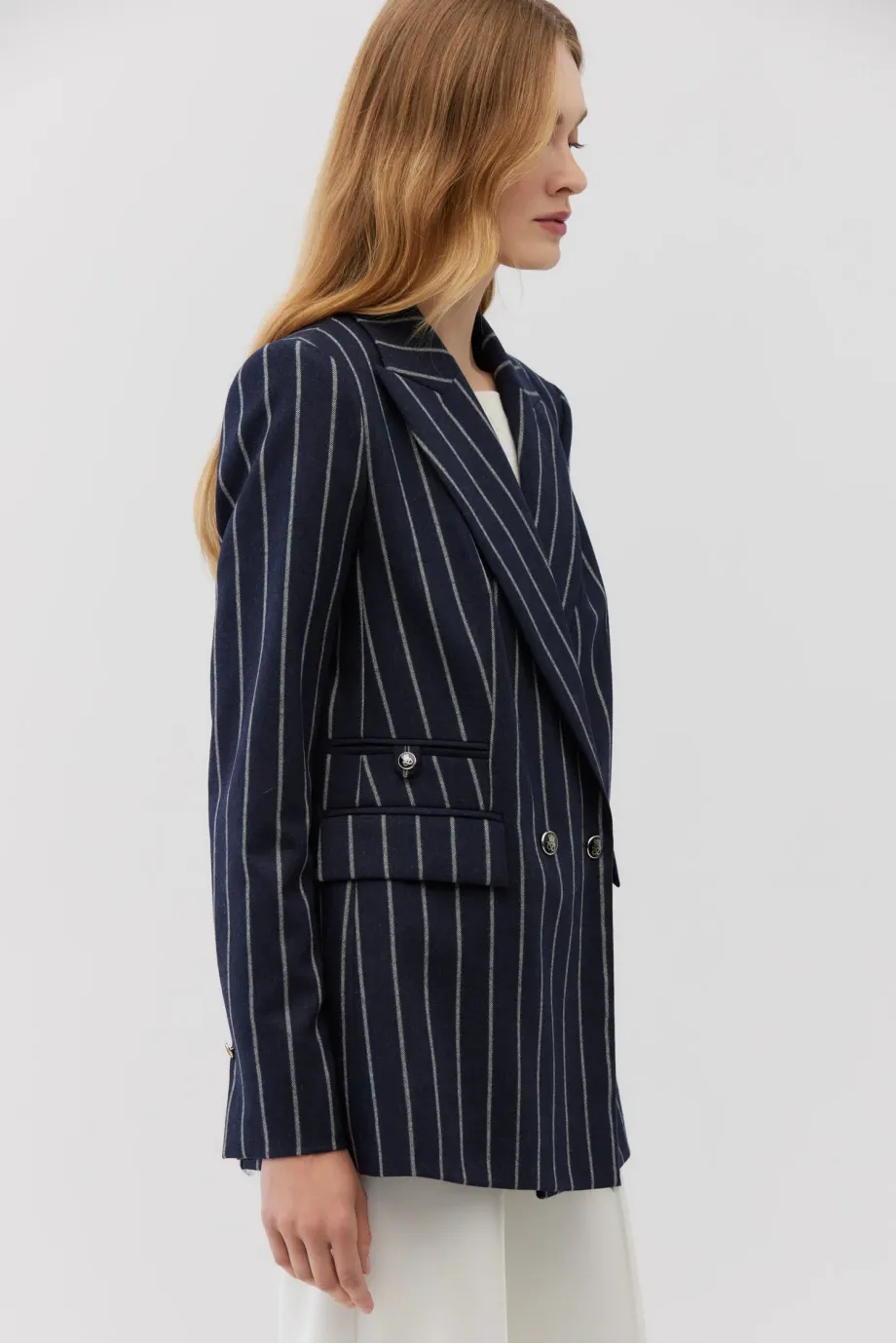 Marineblau gestreifte Jacke. Leicht tailliert. Zweireihig. Lange Ärmel, Taschen. Aus Wolle mit Kaschmiranteil gefertigt. Halbgefüttert. Innen mit Paspel und Kantenverarbeitung.