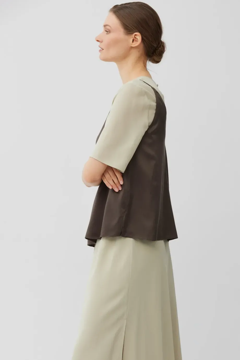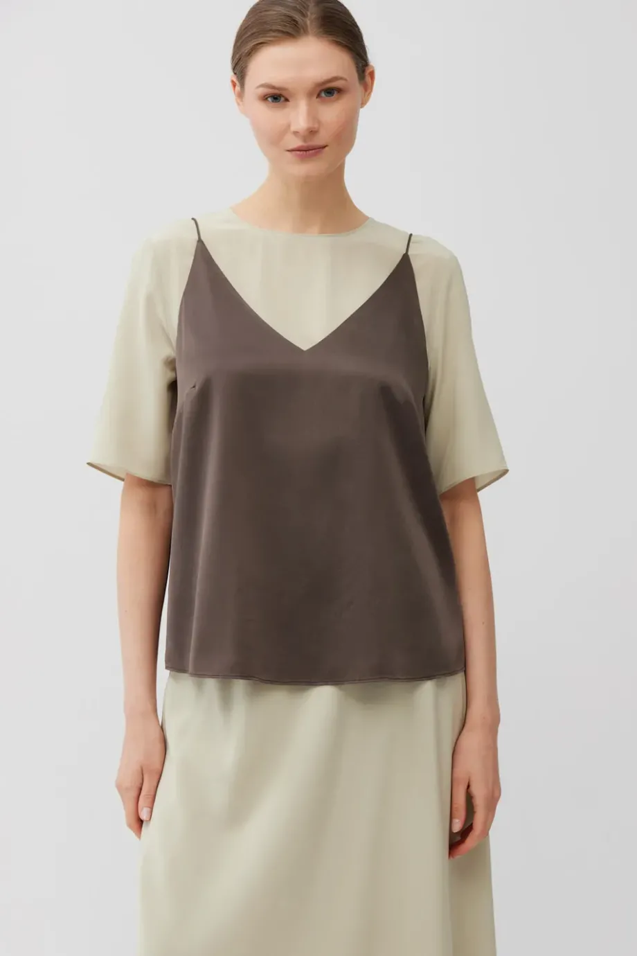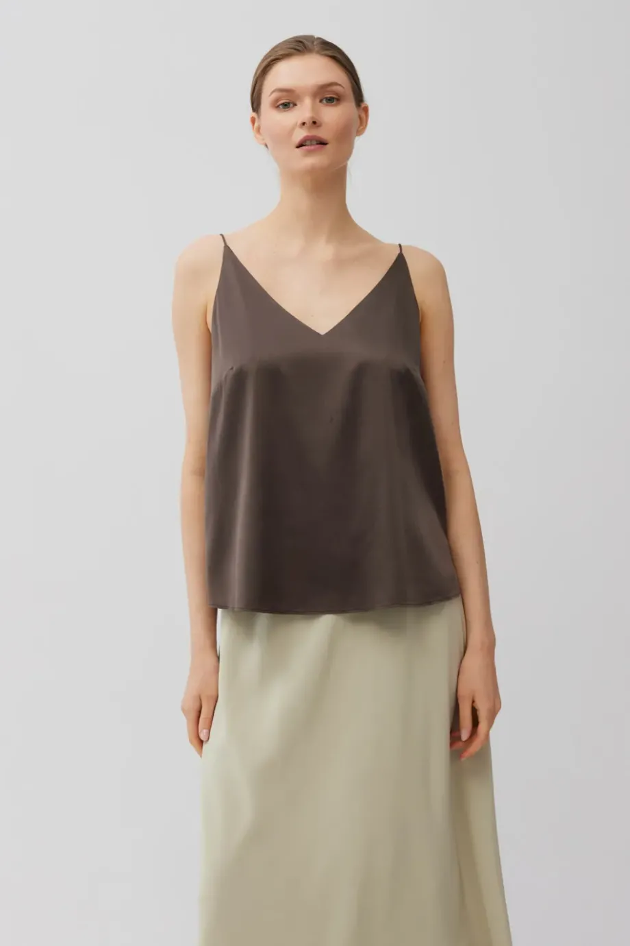 Seidentop. Lockere Form. V-Ausschnitt. Dünne Träger. Farbe braun.