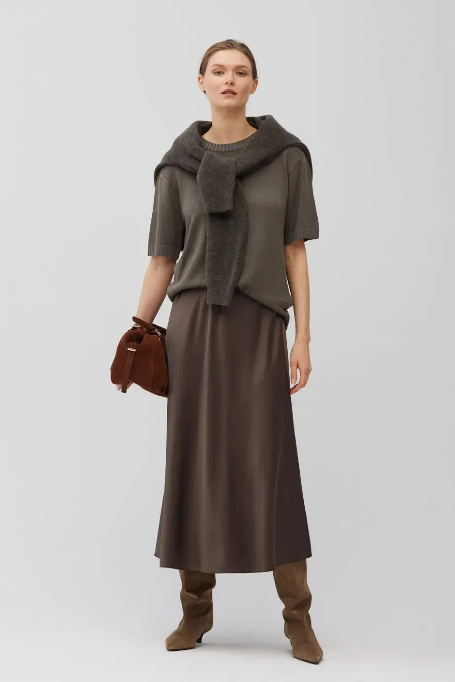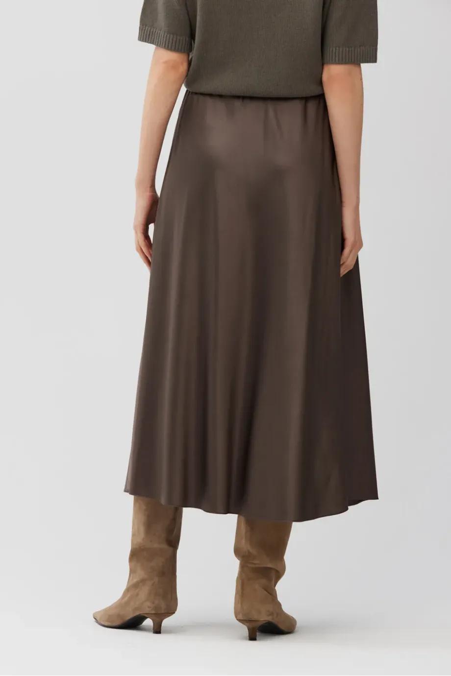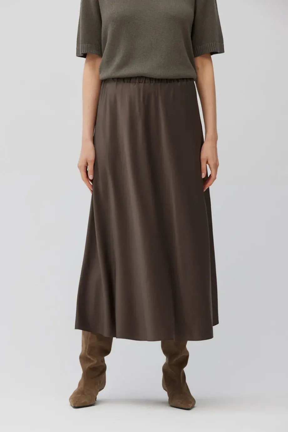 Seidenrock in Braun. Luftig, locker geschnitten mit elastischem Bund. Midi-Länge. Ohne Futter.