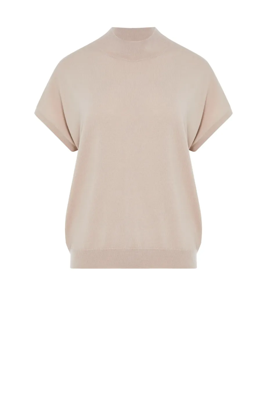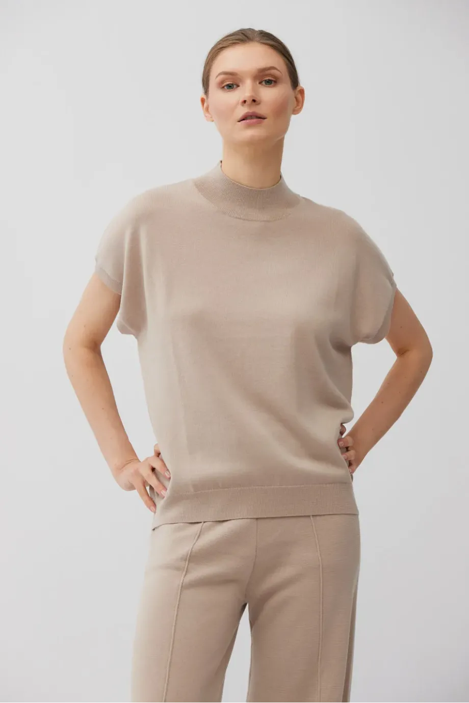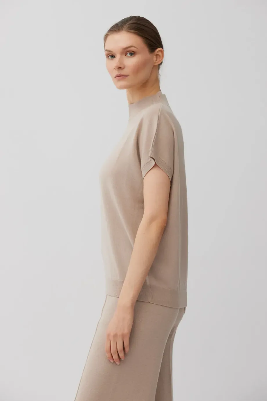 Bluse aus gekämmter Merinowolle, im Single-Jersey-Gewebe, Maschendichte 14 GG. Kurze Ärmel, Rundhalsausschnitt, lockere Passform. Farbe kühles Beige. Zum Ergänzen des Sets Hose aus dem gleichen Stoff.