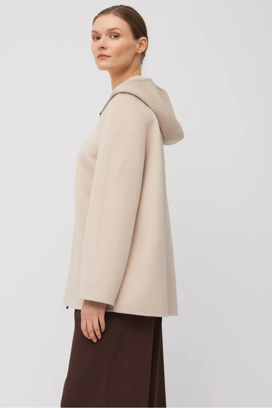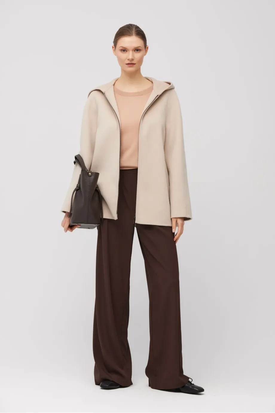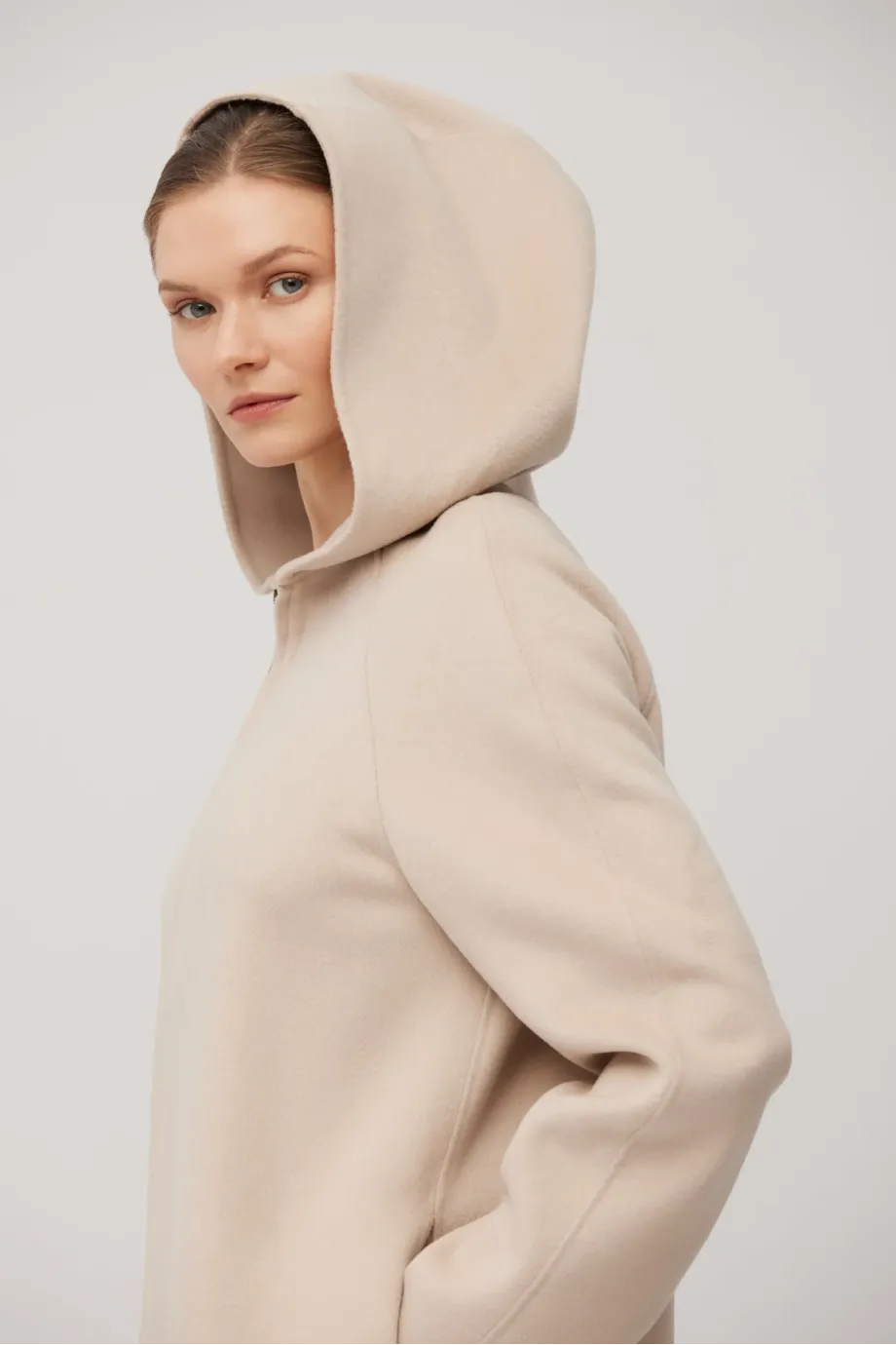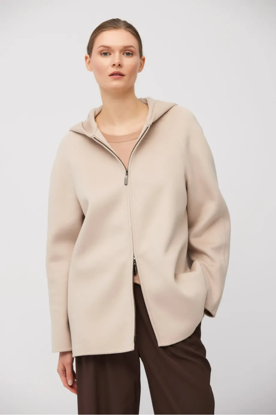 Leichte, ungefütterte Jacke mit einfacher, lockerer Form. Doubleface-Stoff – Mischung aus Wolle und Seide. Modell mit Kapuze und zweipoligem Metallreißverschluss. Farbe Beige.