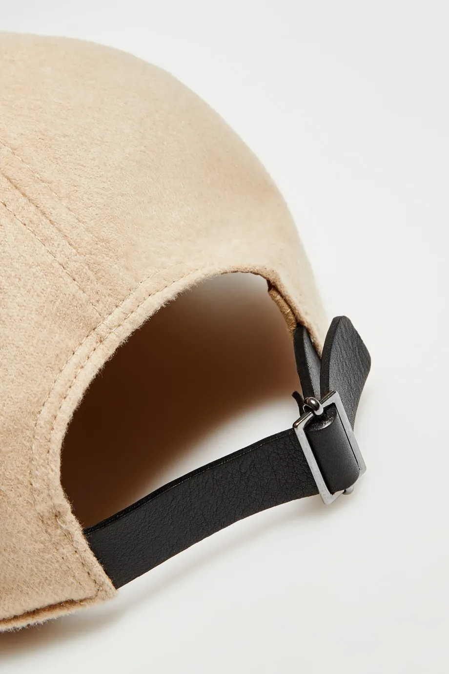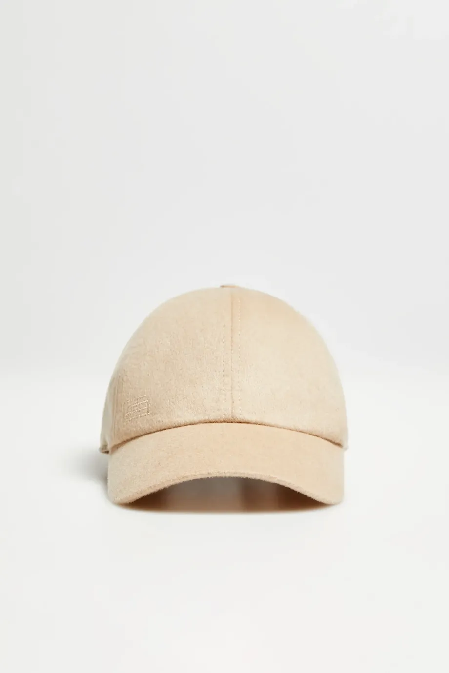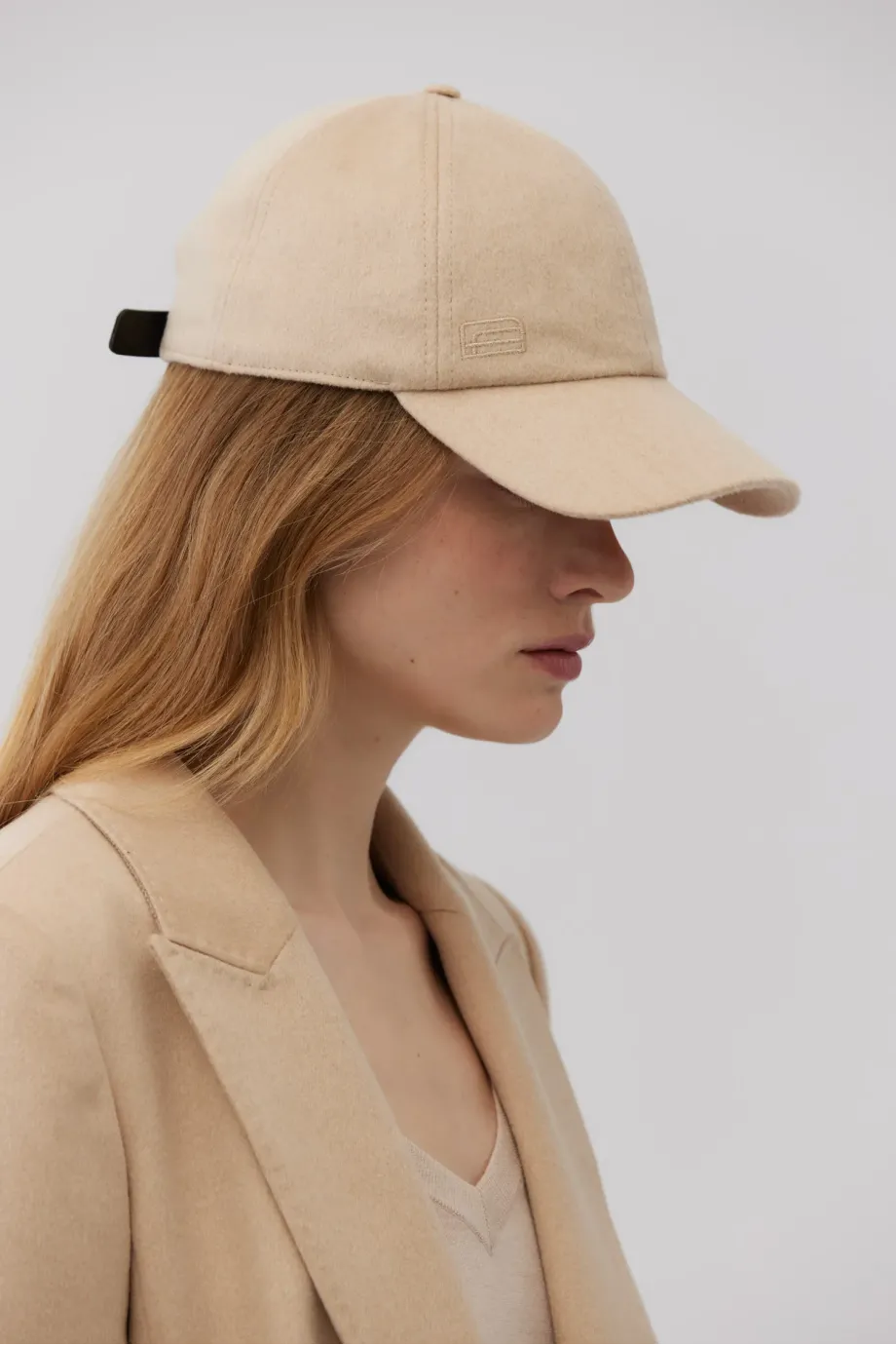 Eine Baseballkappe aus Albino-Kamelwolle in natürlichem Beigeton. Besticktes Logo. Verstellbarer Verschluss aus echtem Leder auf der Rückseite.