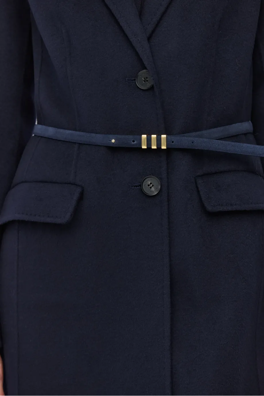 Dunkelblauer, dünner Gürtel aus natürlichem Veloursleder mit Schnalle in Goldfarbe. Handgefertigt in einer polnischen Manufaktur.