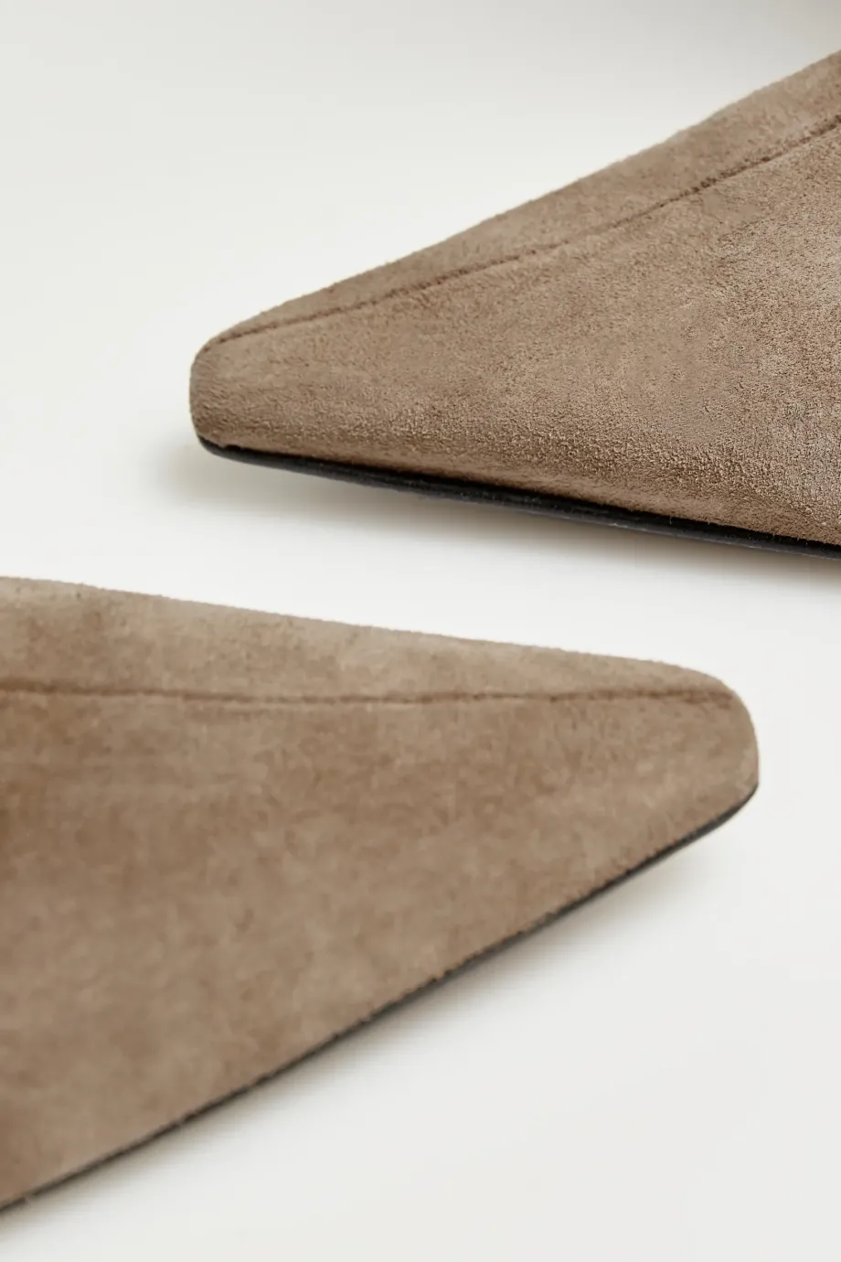 Herausziehbare Stiefel aus natürlichem Wildleder in Grünton. Schlanke, spitze Schuhspitze. Mittelhoher Kitten-Heel-Absatz. Minimalistisch. Handgefertigt in einer spanischen Manufaktur.