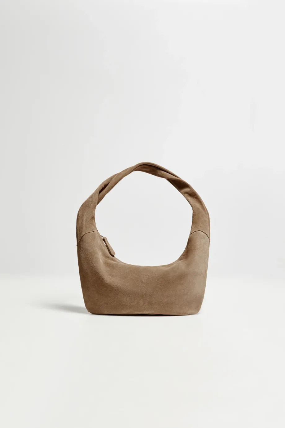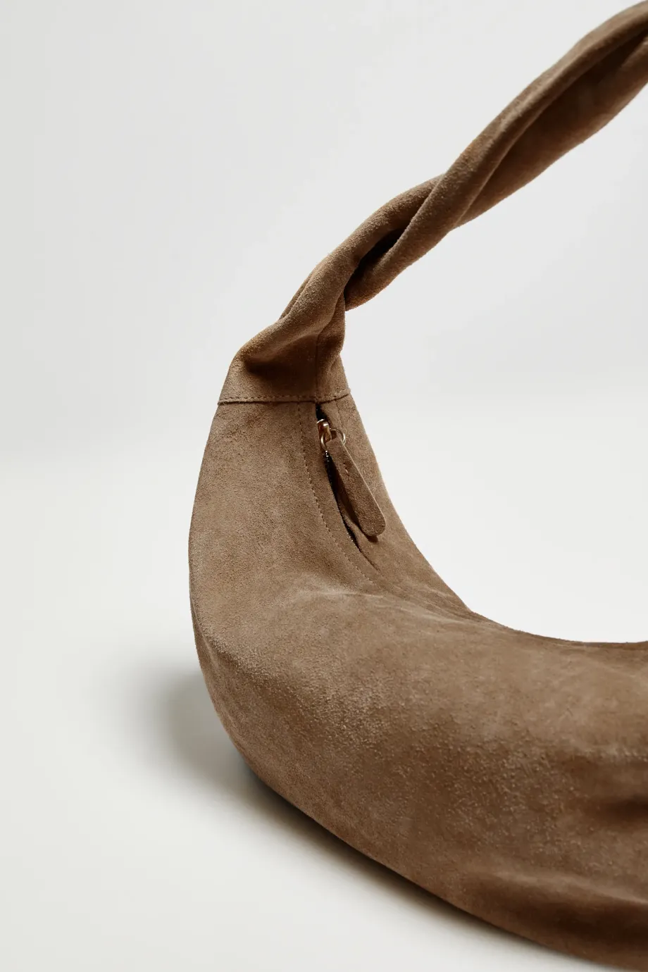 Halbrund geformte Tasche aus weichem, natürlichem Wildleder in Beige. Mit Reißverschluss, einem breiten, bequemen Tragegurt – zum Tragen über der Schulter oder in der Hand. Leicht und weich in der Form, mit Futter und einer kleinen Reißverschlusstasche im Inneren. Handgefertigt in einer italienischen Manufaktur.