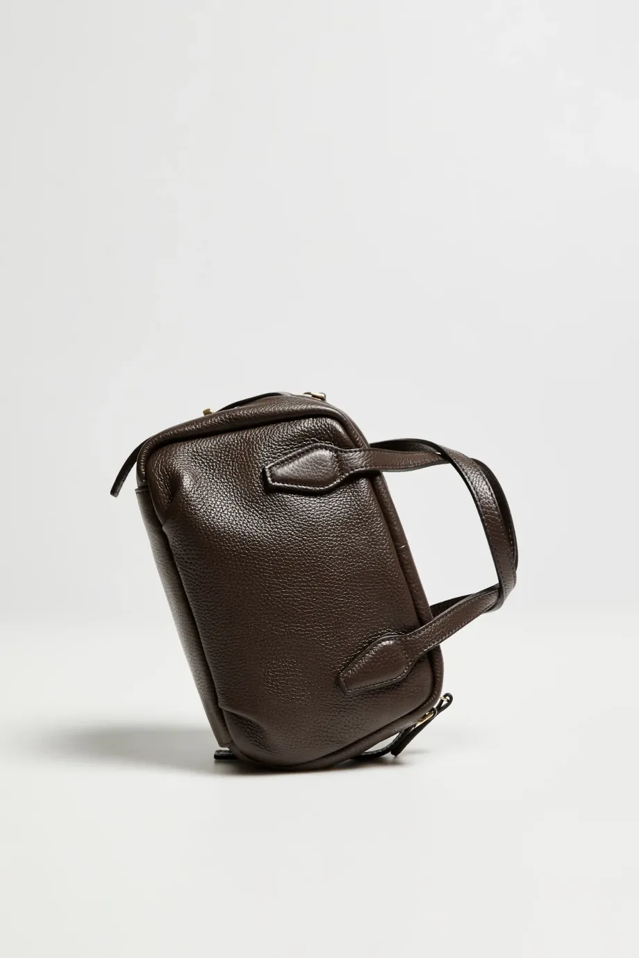 Handtasche aus hochwertigem, kratzfestem Nappaleder. Kompakte Form mit kurzen Griffen und langem, verstellbarem, abnehmbarem Schultergurt. Verschluss mit goldenem Reißverschluss. Innen Futter sowie eine Reißverschlusstasche. Handgenäht in einer italienischen Manufaktur. Farbe: Braun.