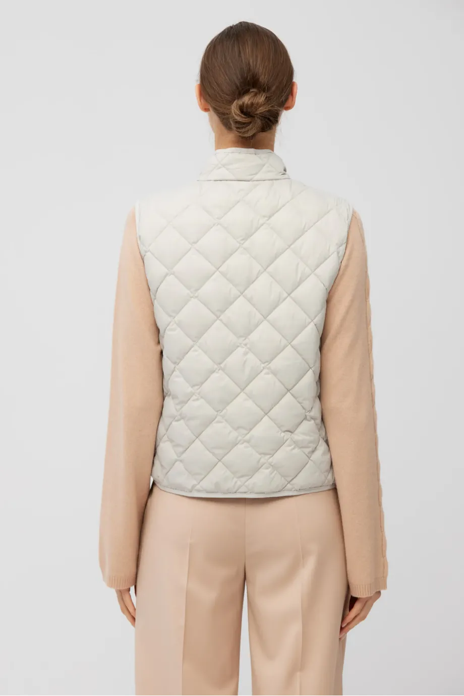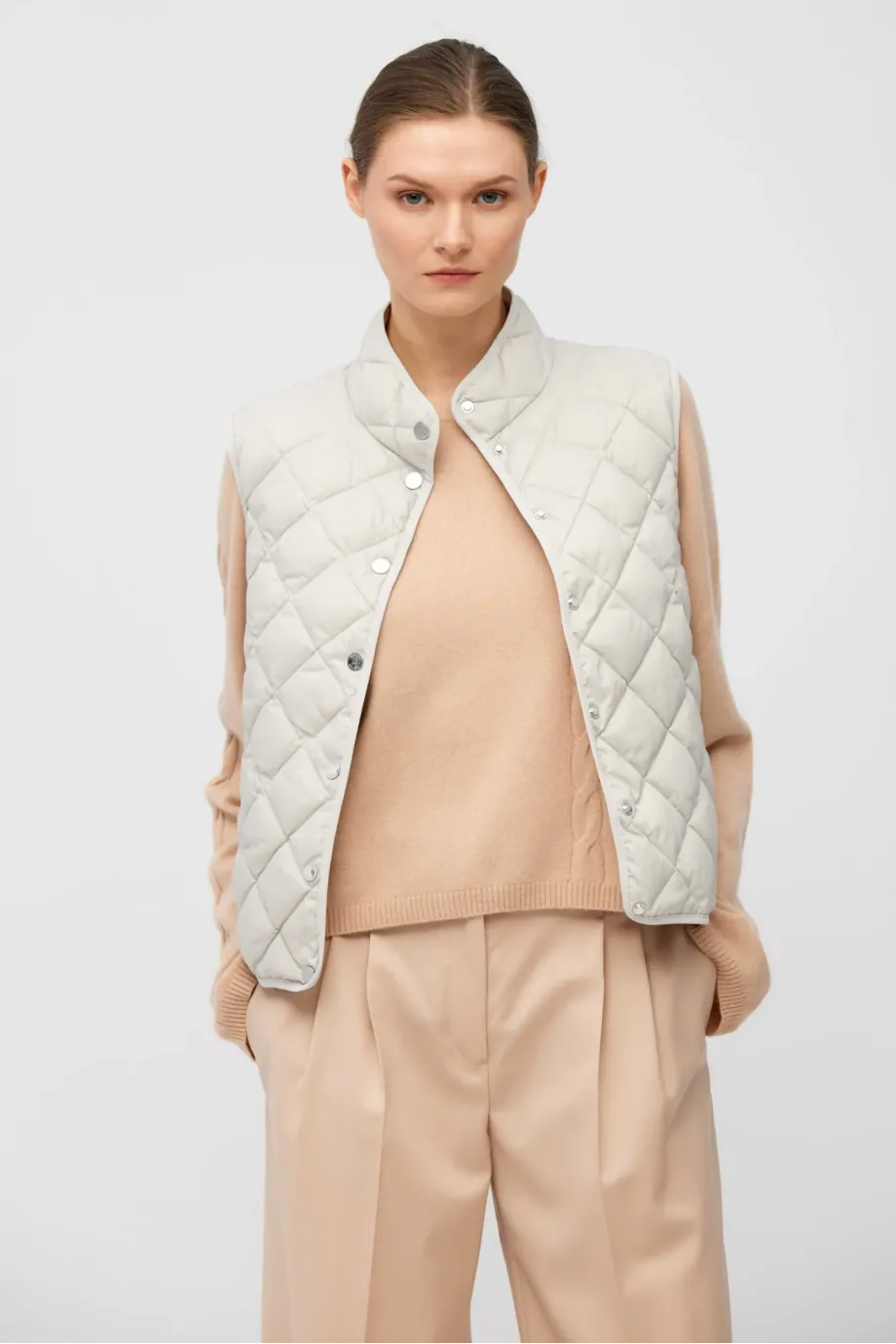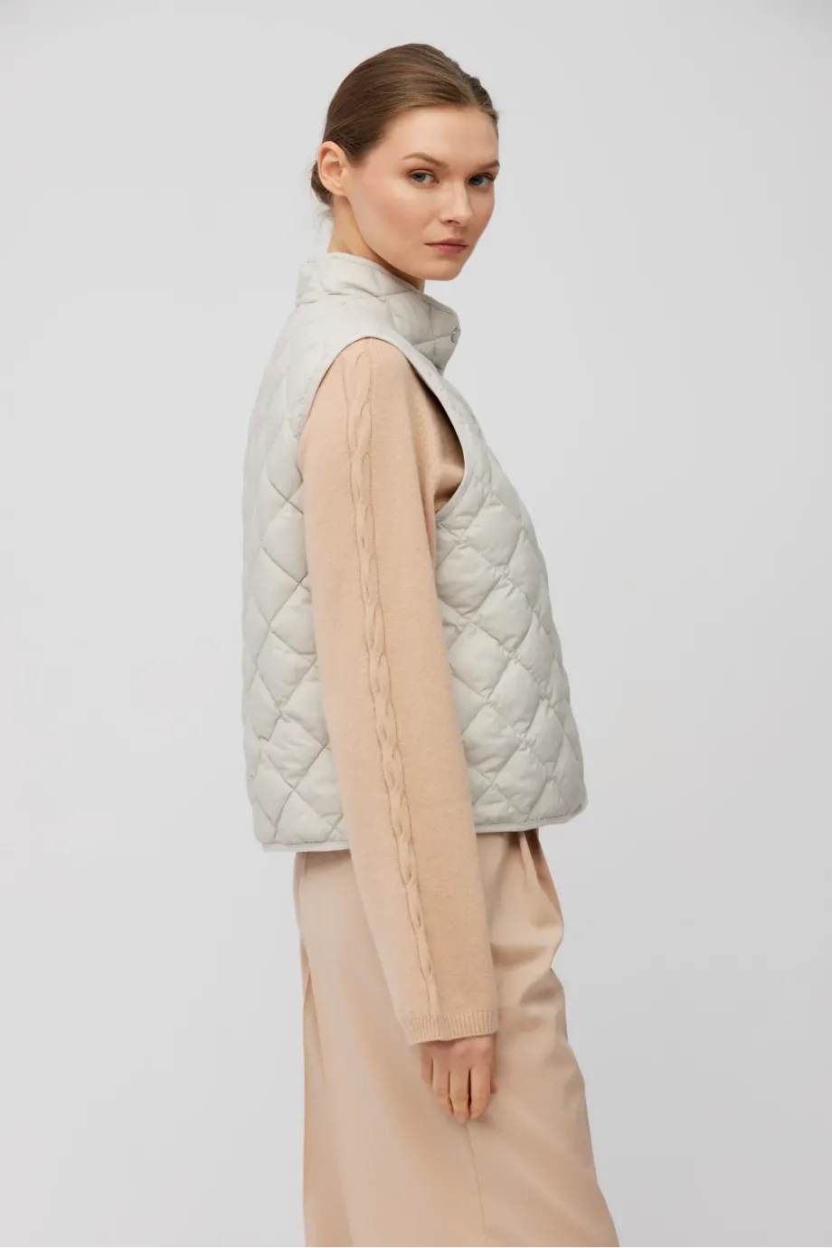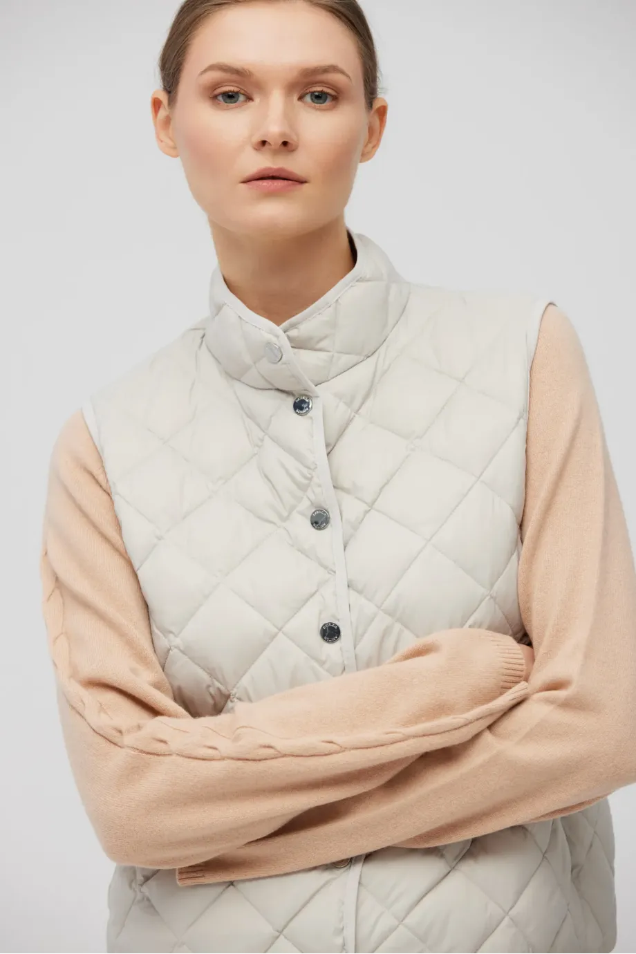 Weste mit natürlicher, dauniger Füllung. Gerader, kurzer Schnitt mit Druckknöpfen. Beige Farbe. Zum eigenständigen Tragen oder als wärmende Schicht unter einem Mantel.