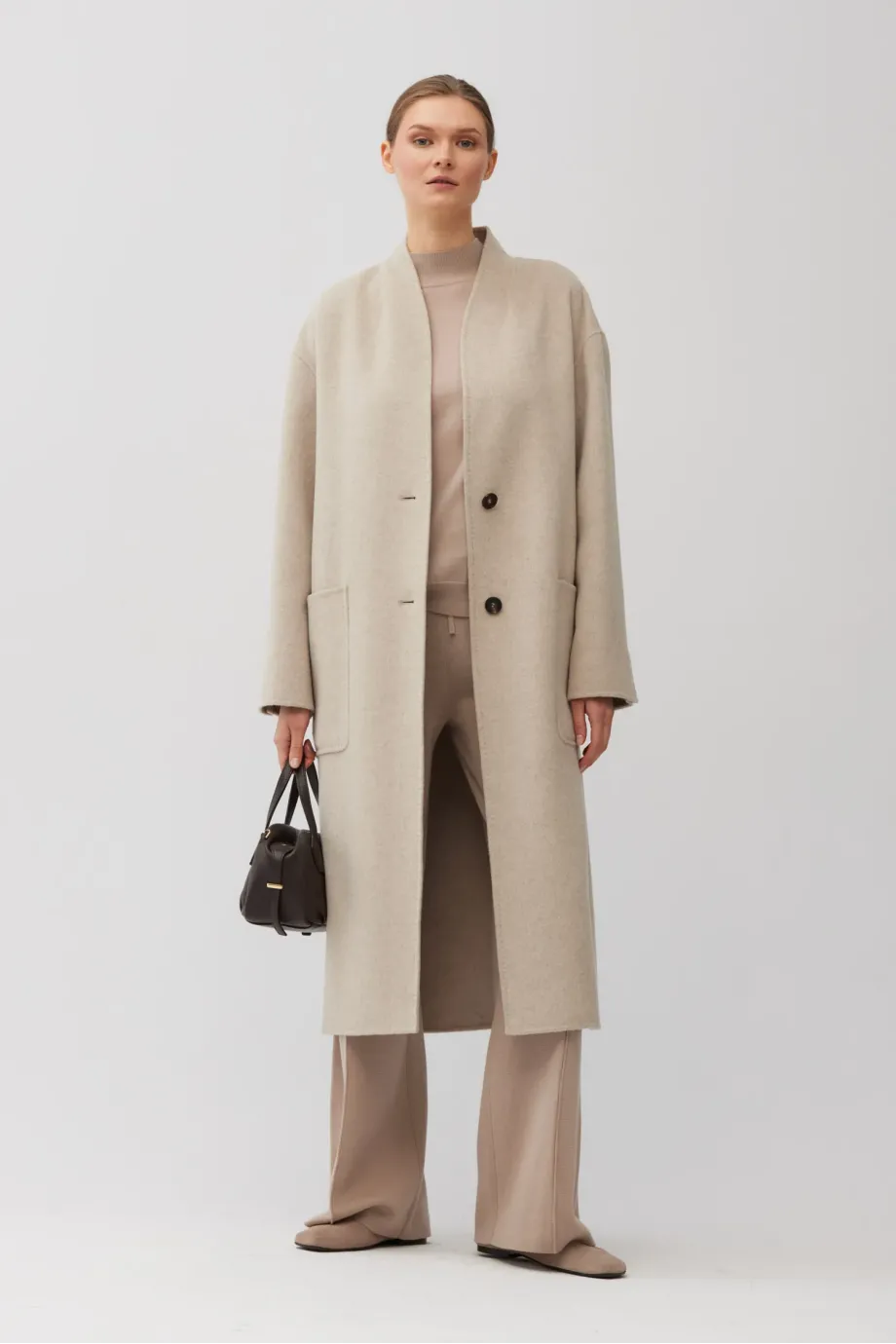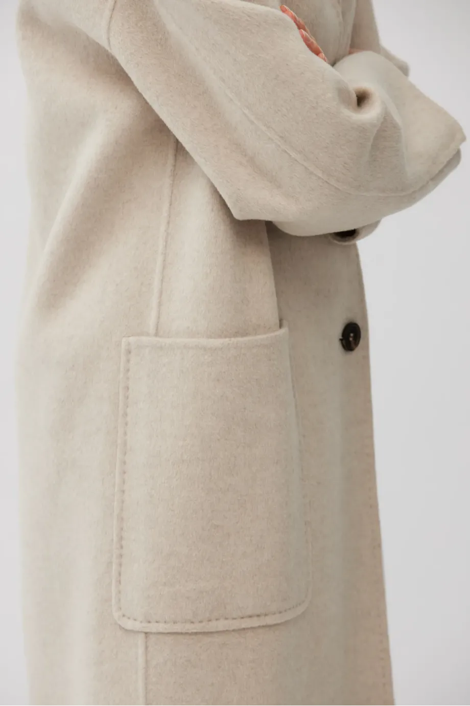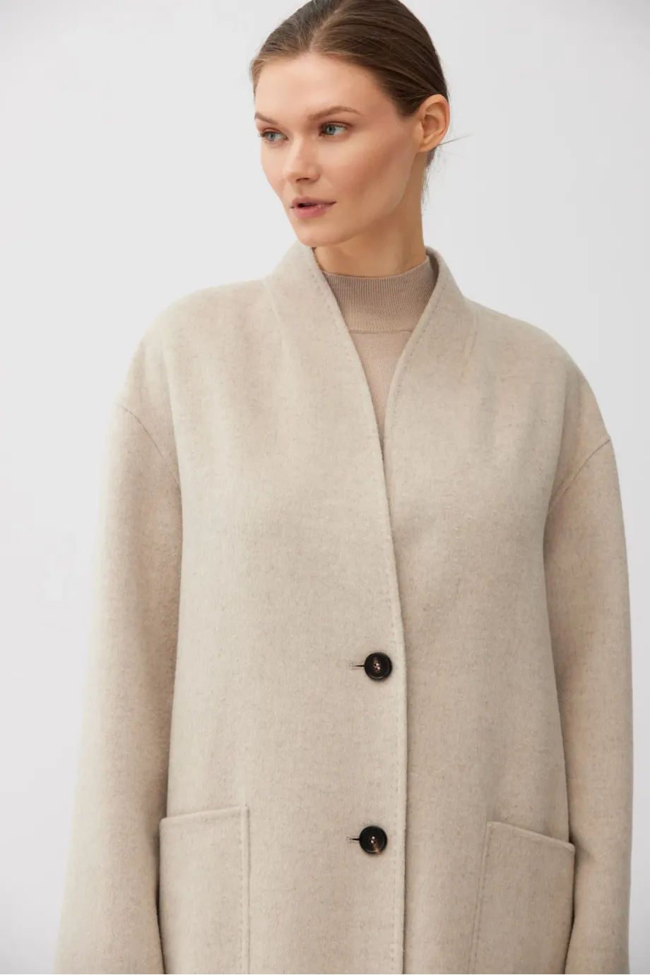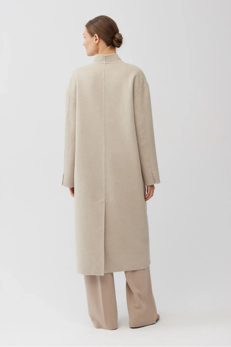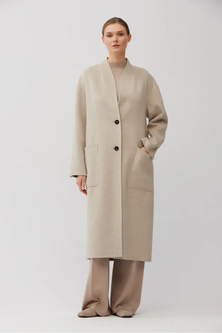 Einknopf-Mantel mit einfachem Schnitt, aus Doubleface-Stoff – einer Mischung aus Wolle und Seide. Midi-Länge. Stehkragen, aufgesetzte Taschen, Schlitz hinten. Verschluss mit kontrastierenden Knöpfen. Leichtes, ungefüttertes Modell, handgefertigt verarbeitet.