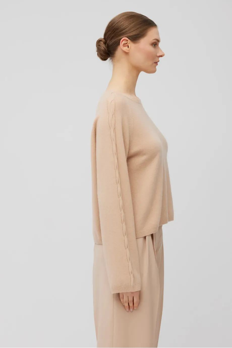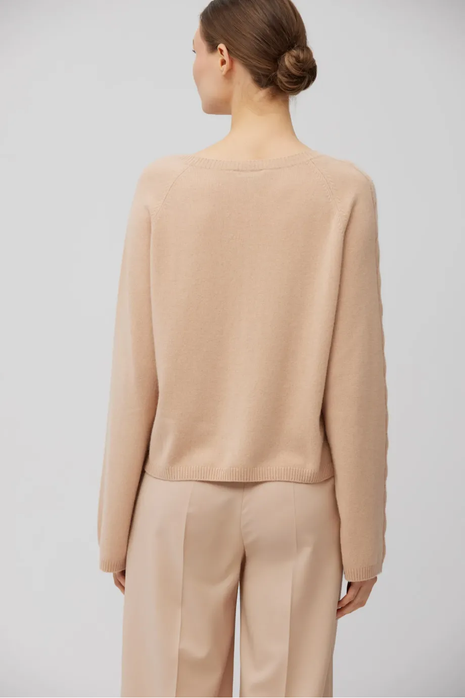 Sehr weiches Baby-Kaschmir-Gewebe. Lockerer Schnitt mit langen Ärmeln, gefertigt mit einer Maschenweite von 12 GG im Jersey-Strick. Zopfstrickmuster auf Vorderseite und Ärmeln. Farbe pudriges Rosa.