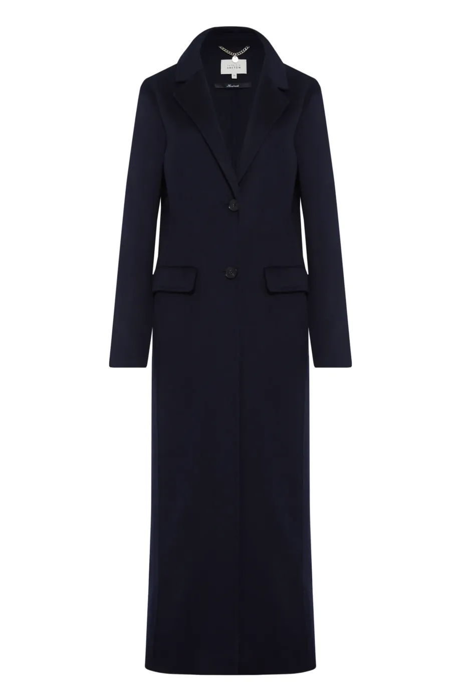 Einreihiger Mantel in schlichter Form, gefertigt aus Doubleface-Gewebe – einer Mischung aus Wolle und Seide. Maxi-Länge. Klassischer Kragen, Taschen, Schlitz hinten. Knopfverschluss. Leichtes, ungefüttertes Modell, von Hand verarbeitet.