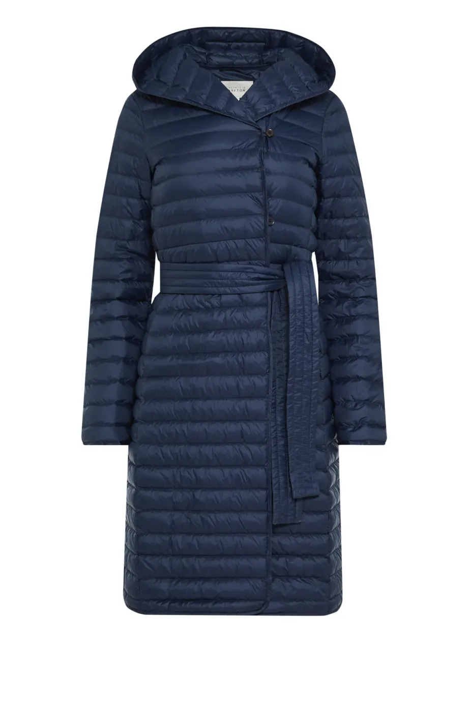 Leichte Damenjacke mit Kapuze Daunenjacke, dunkelblau Natürliches Futter Verschluss: Jacke mit Gürtel und Knöpfen Langer Mantel, Midi-Länge Zum eigenständigen Tragen oder als zusätzliche Wärmeschicht unter einem Mantel