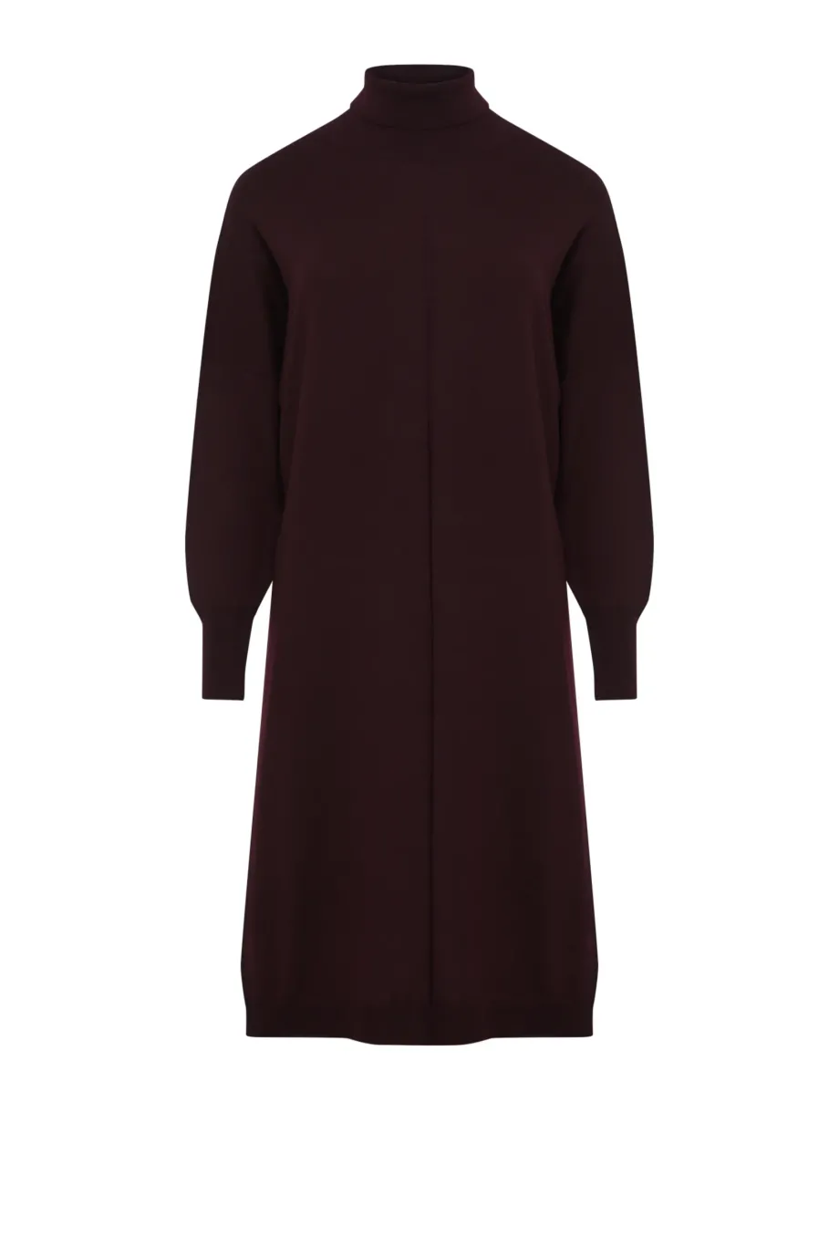 Rollkragenkleid aus Merinowolle in Auberginenfarbe. Midilänge, mit langem Ärmel und lockerem Schnitt. Gestrickt im feinen Single-Jersey auf einer Maschine mit 14 GG.