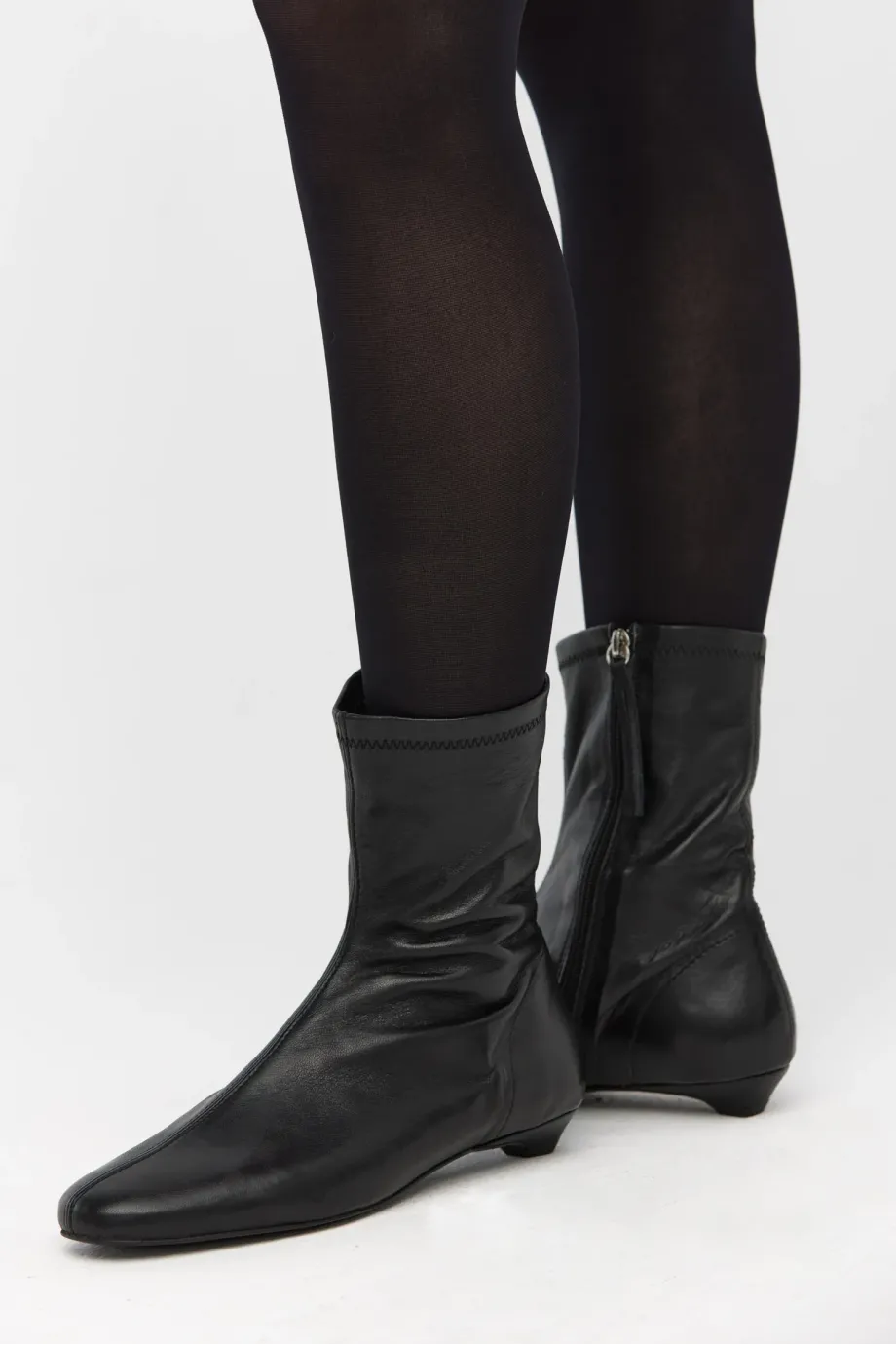 Schwarze Stiefeletten aus sehr weichem, naturbelassenem Leder, handgefertigt in einer polnischen Manufaktur. Klassisches Modell mit geradem Schaft und runder Spitze, Reißverschluss, auf niedrigem Kitten-Heel-Absatz. Minimalistisches Design.