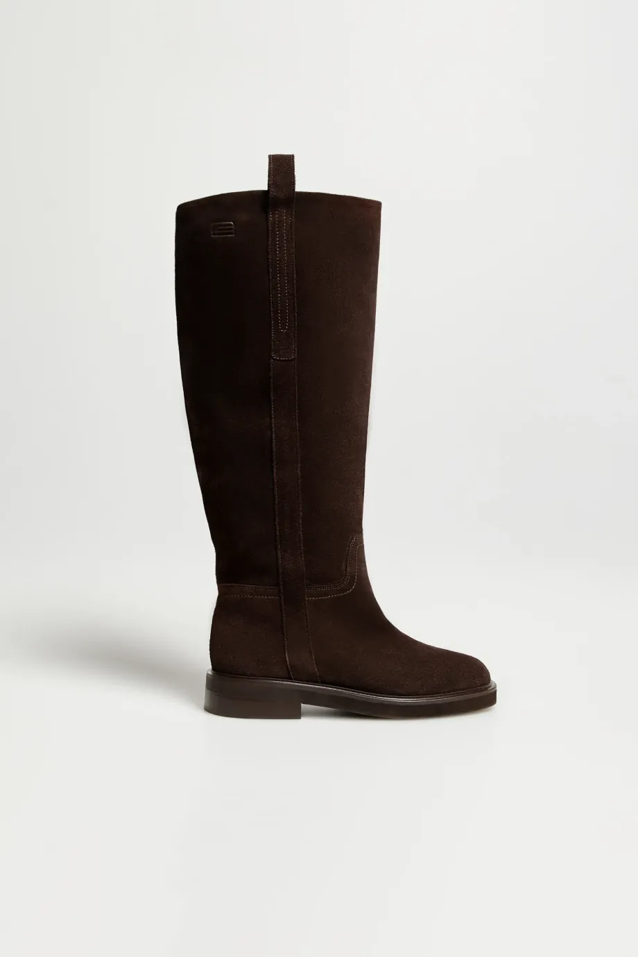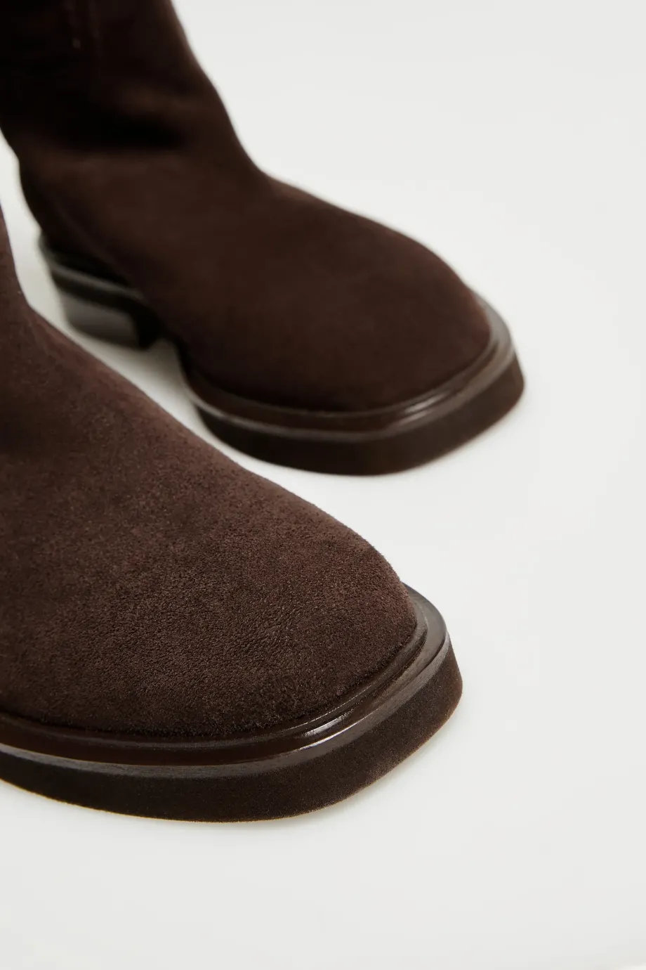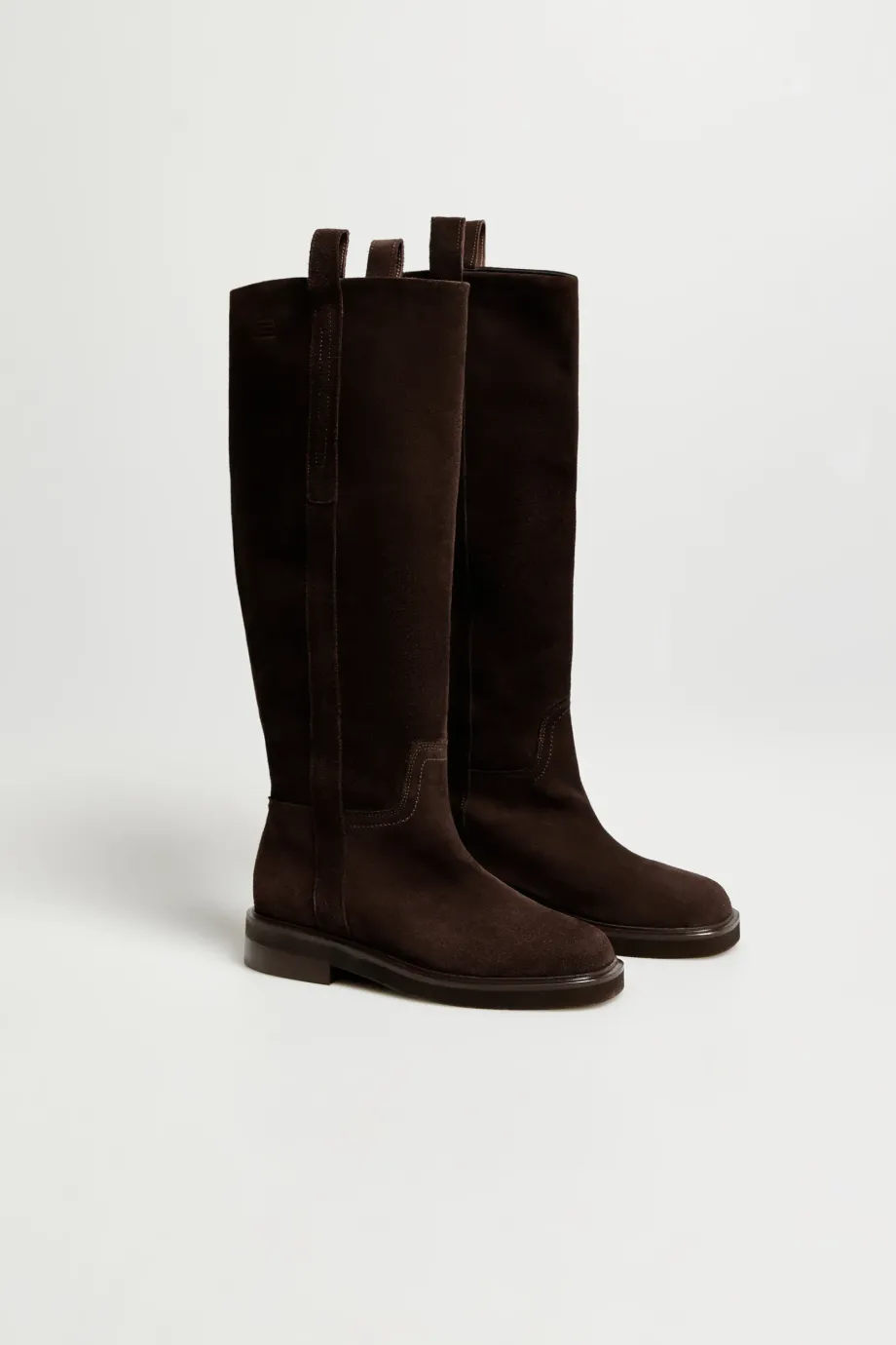 Braune Stiefel aus weichem Veloursleder. Handgefertigt in einer polnischen Manufaktur. Hoher Schaft, quadratische Spitze, dekorative vertikale Nähte.