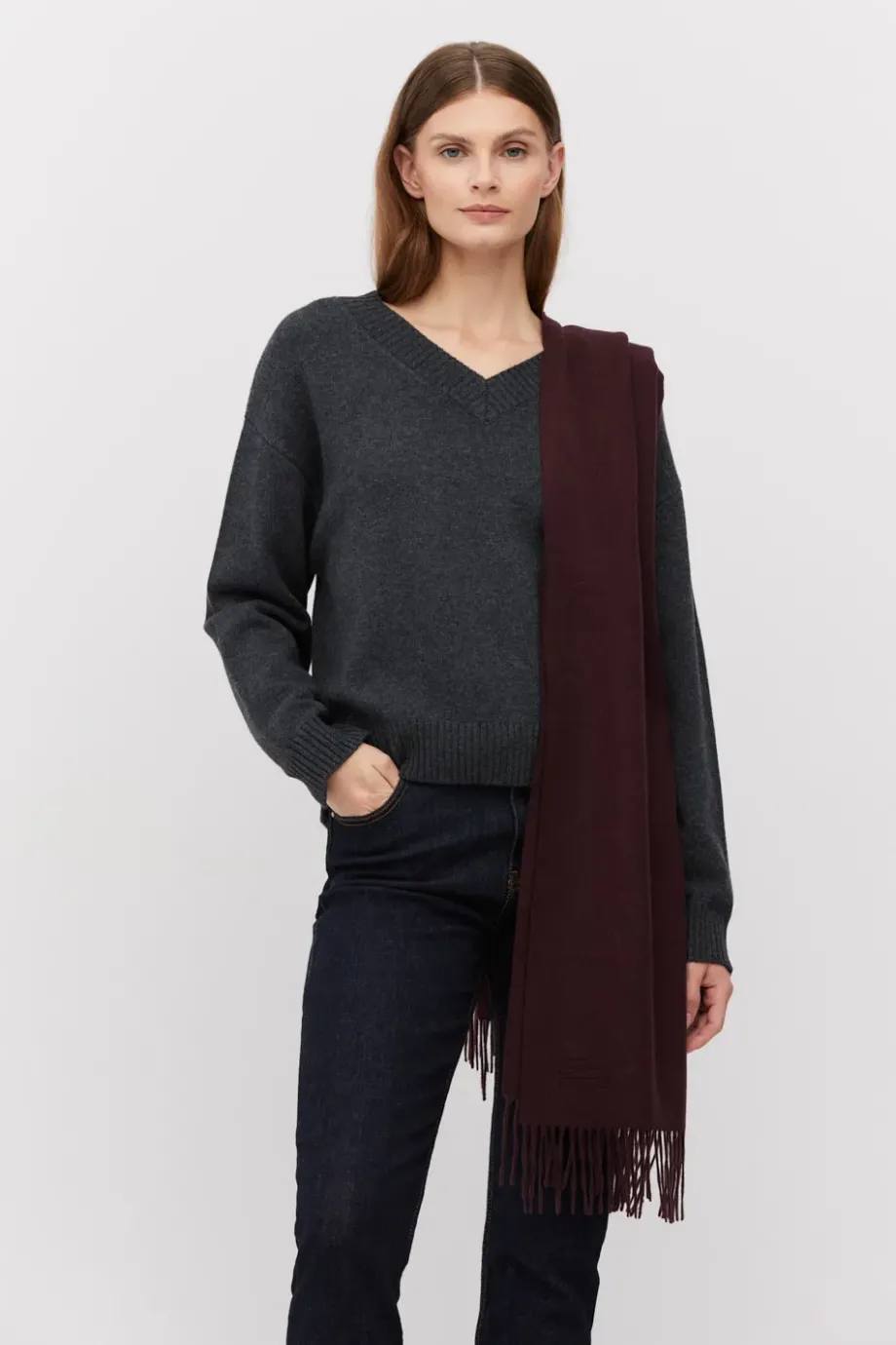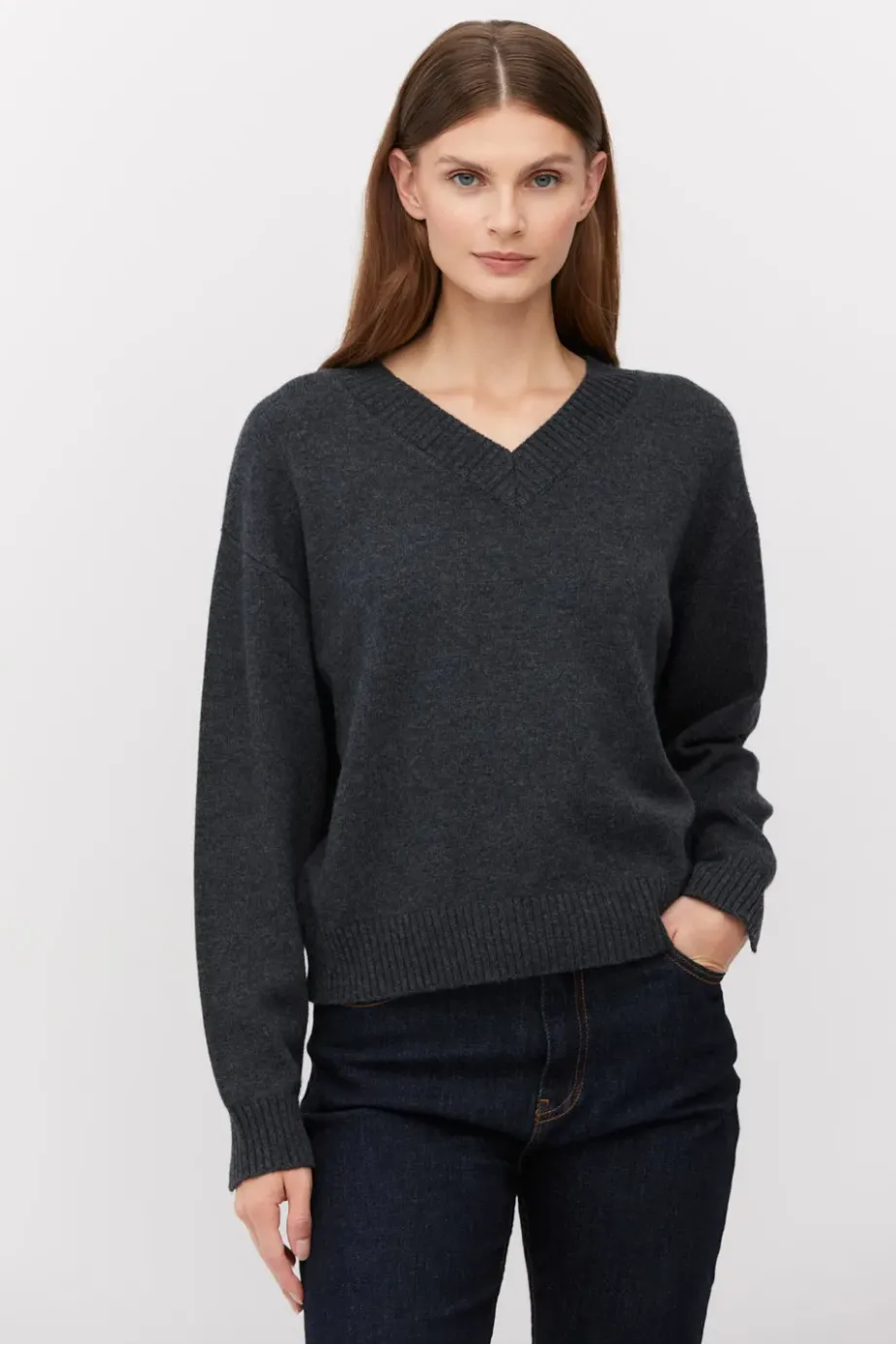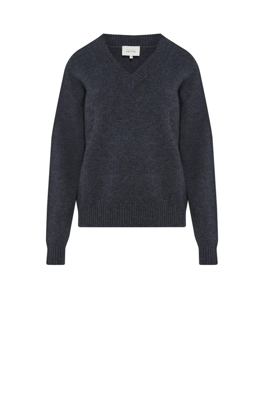 Grauer Pullover aus Kaschmir und Merinowolle, mit lockerem Schnitt und V-Ausschnitt. Gefertigt im Cable Knit-Strickmuster auf einer 7 GG-Maschine. Lange Ärmel, in zwei Farben erhältlich.