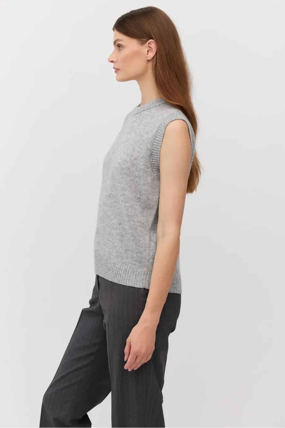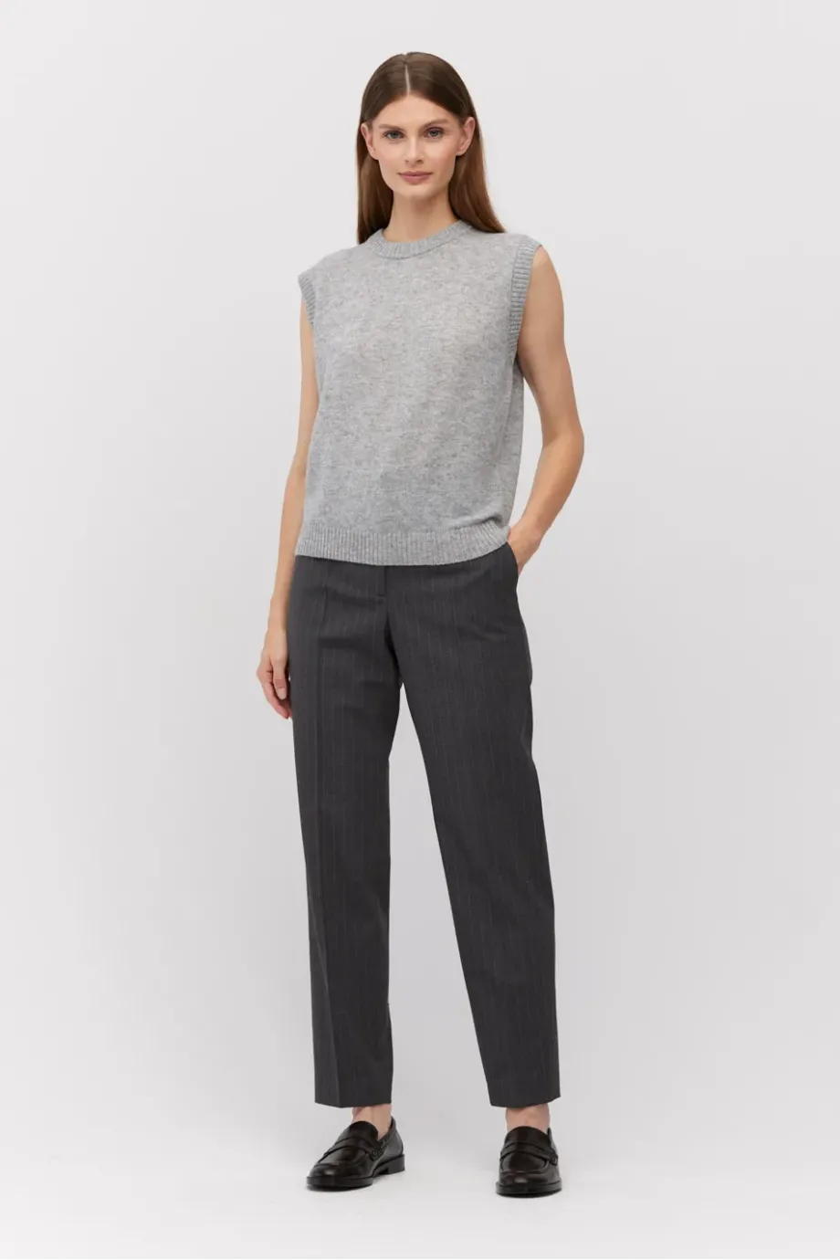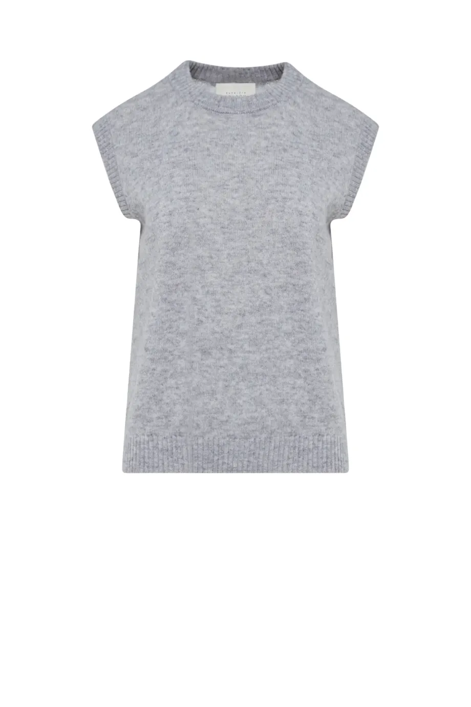 Grauer Pullover aus Merinowolle und Kaschmir, mit geradem Schnitt und lockerem Stil. Kurzer Ärmel, runder Ausschnitt, Single-Jersey-Strick mit einer Maschinendichte von 7 GG.