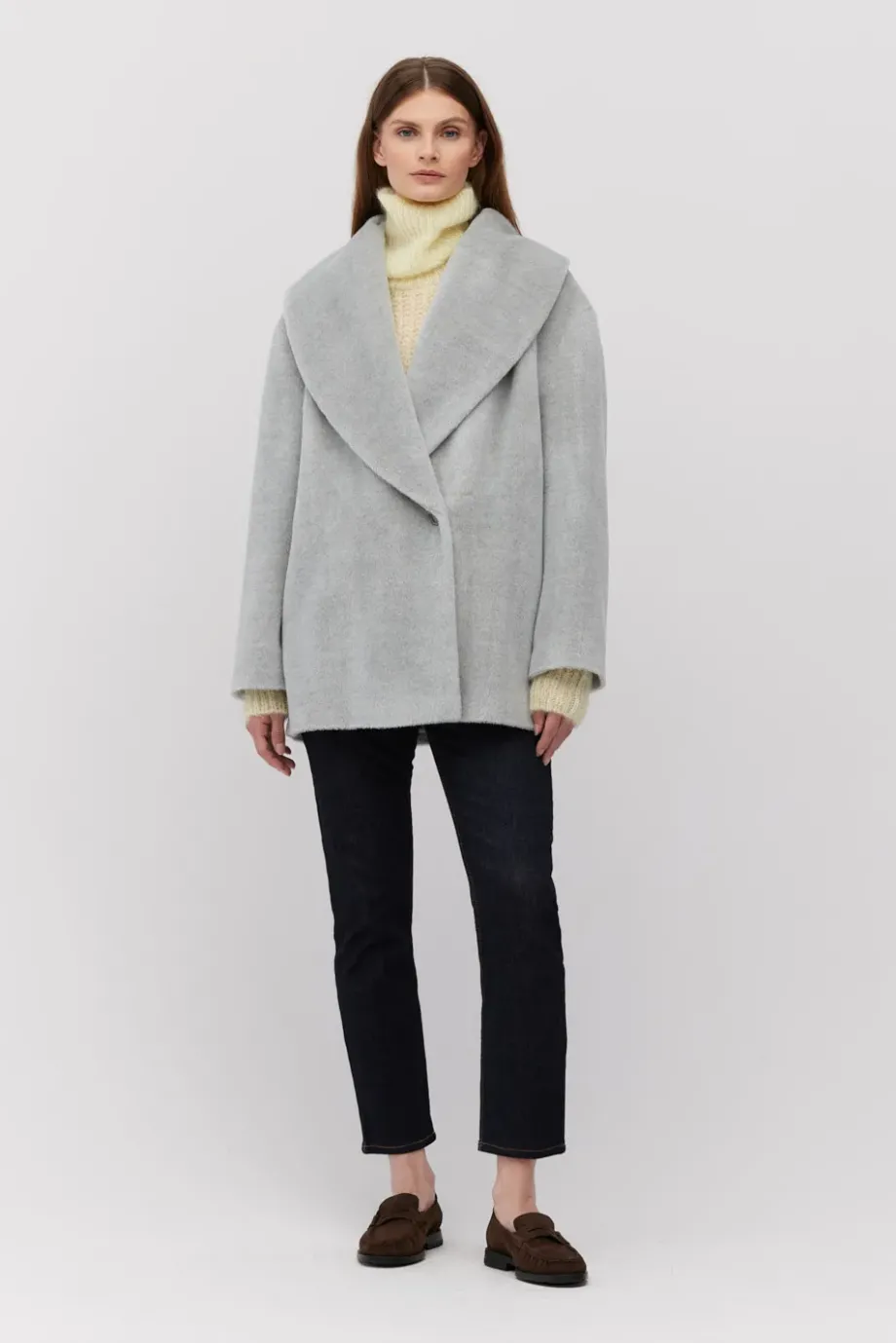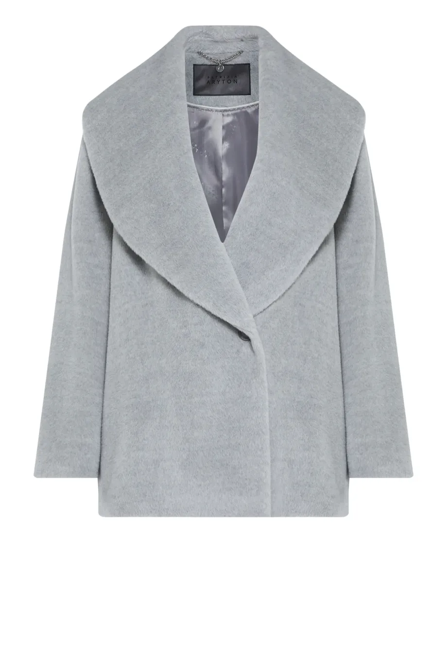 Jacke aus Baby Suri Alpaka in Grau. Lockerer Schnitt mit Schalkragen. Verschluss mit Naturknöpfen. Modell mit Futter und dekorativem Paspel.