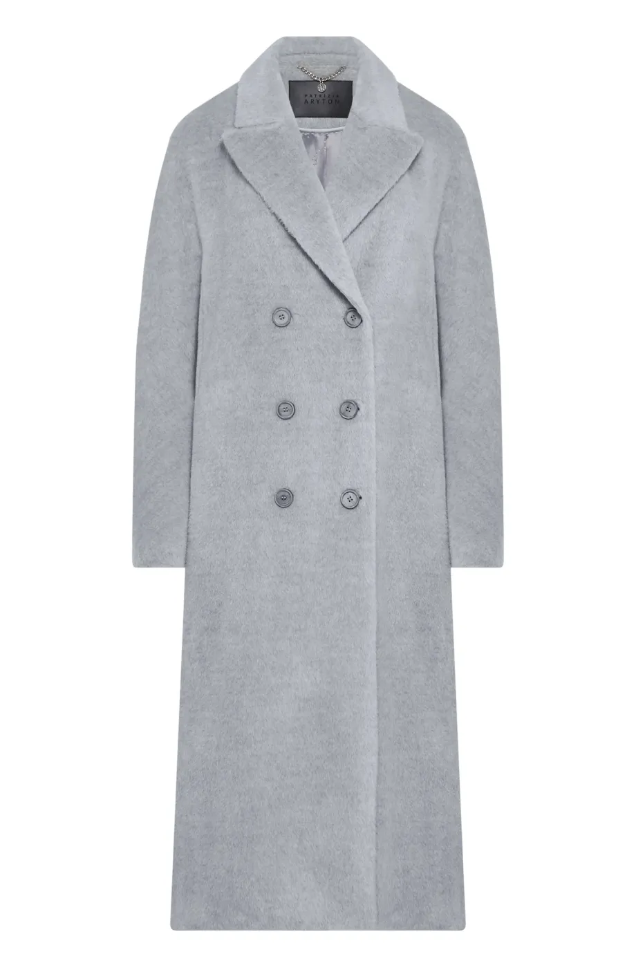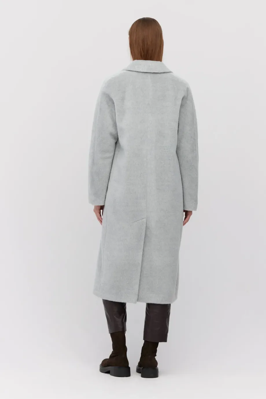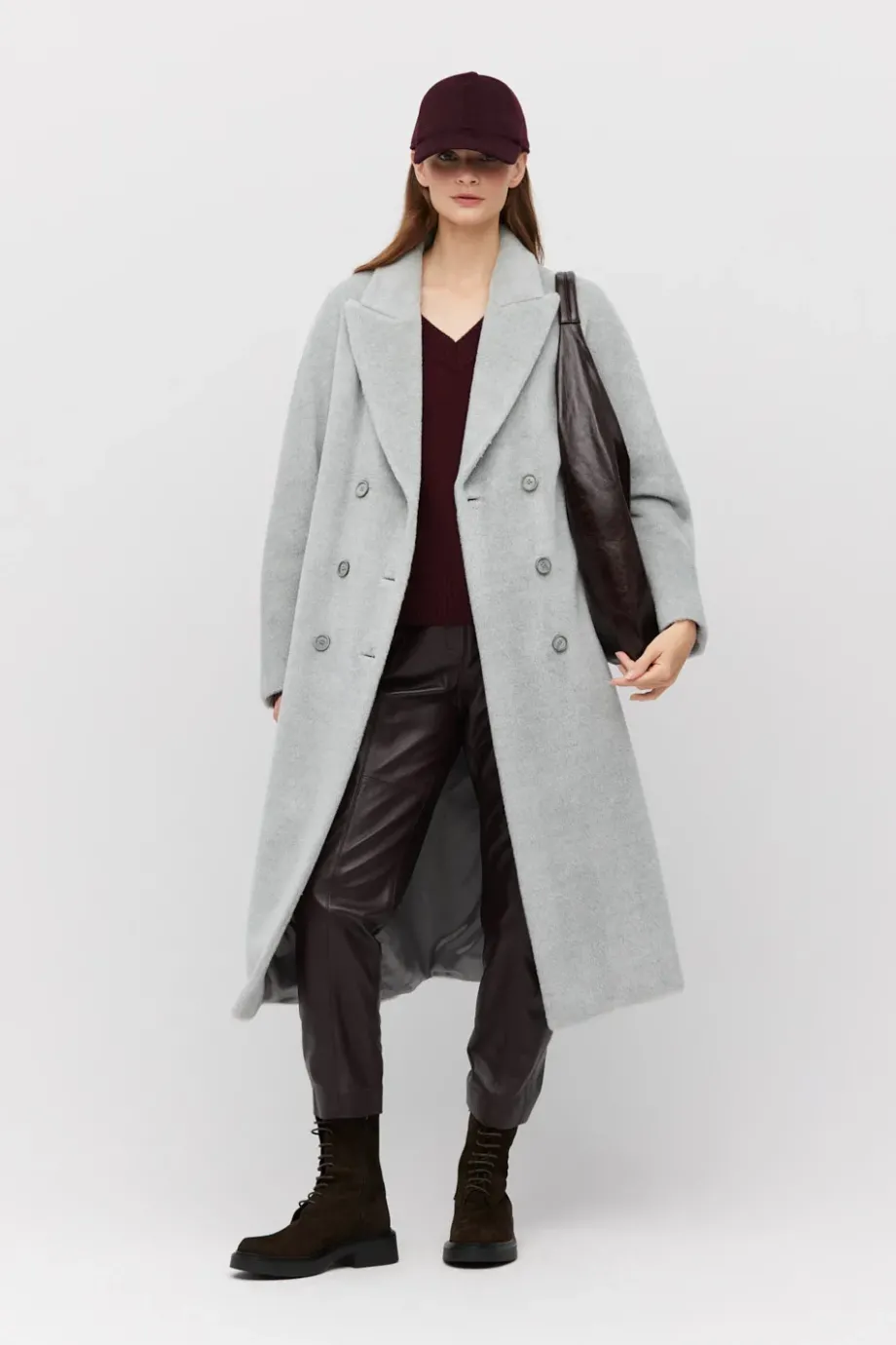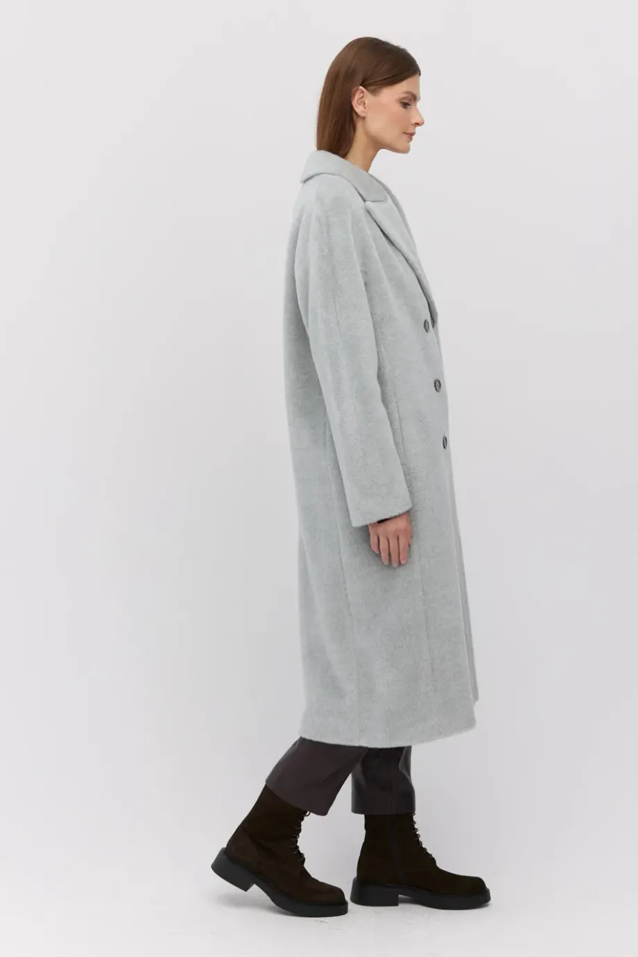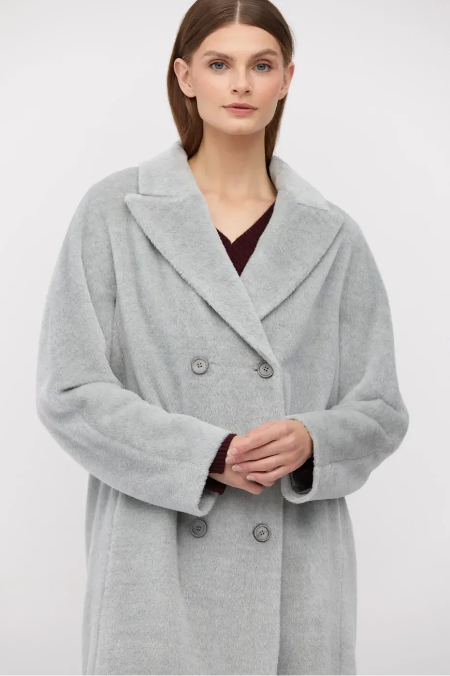 Mantel in Grautönen aus Baby Suri Alpaka. Lockerer, gerader Schnitt, doppelreihiger Verschluss mit Naturknöpfen. Kimonoärmel, hinten mit Schlitz. Modell mit Futter und dekorativem Paspel.
