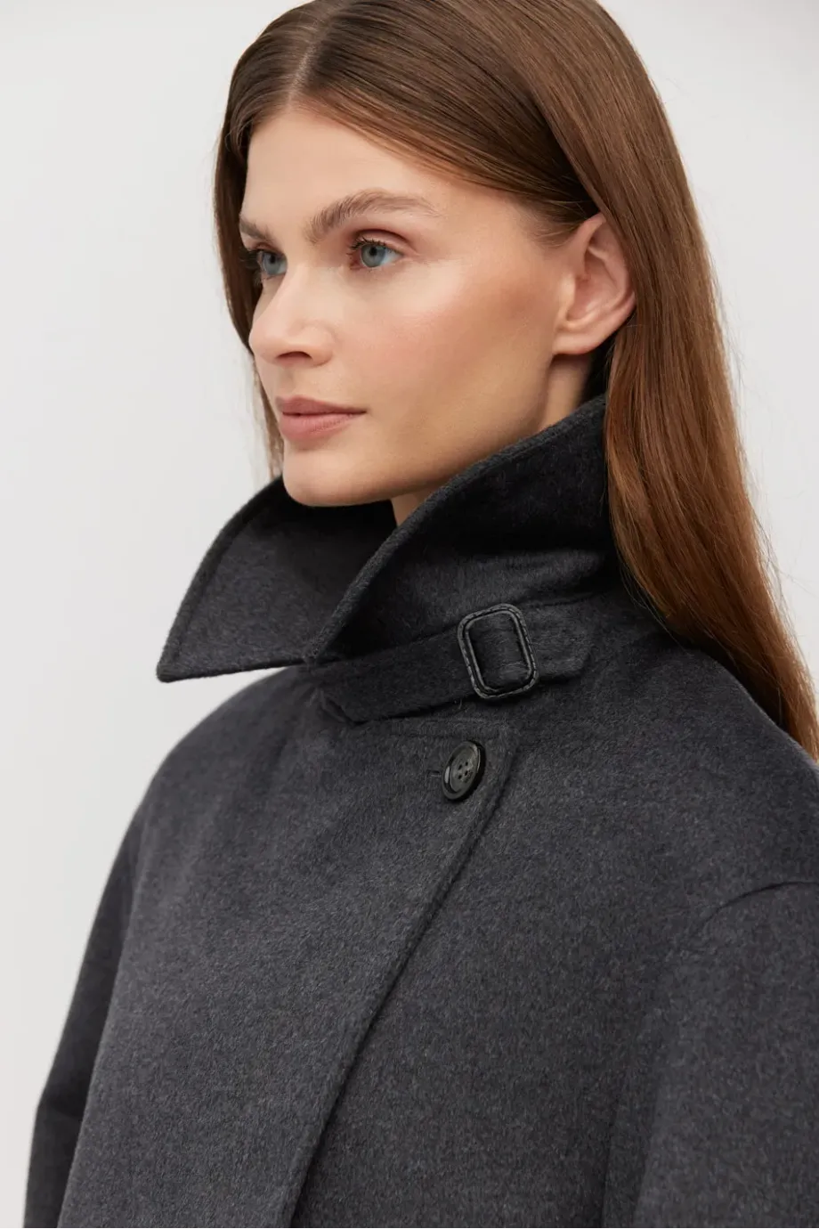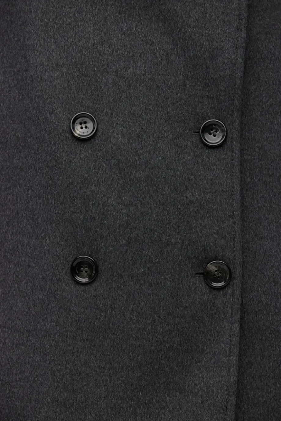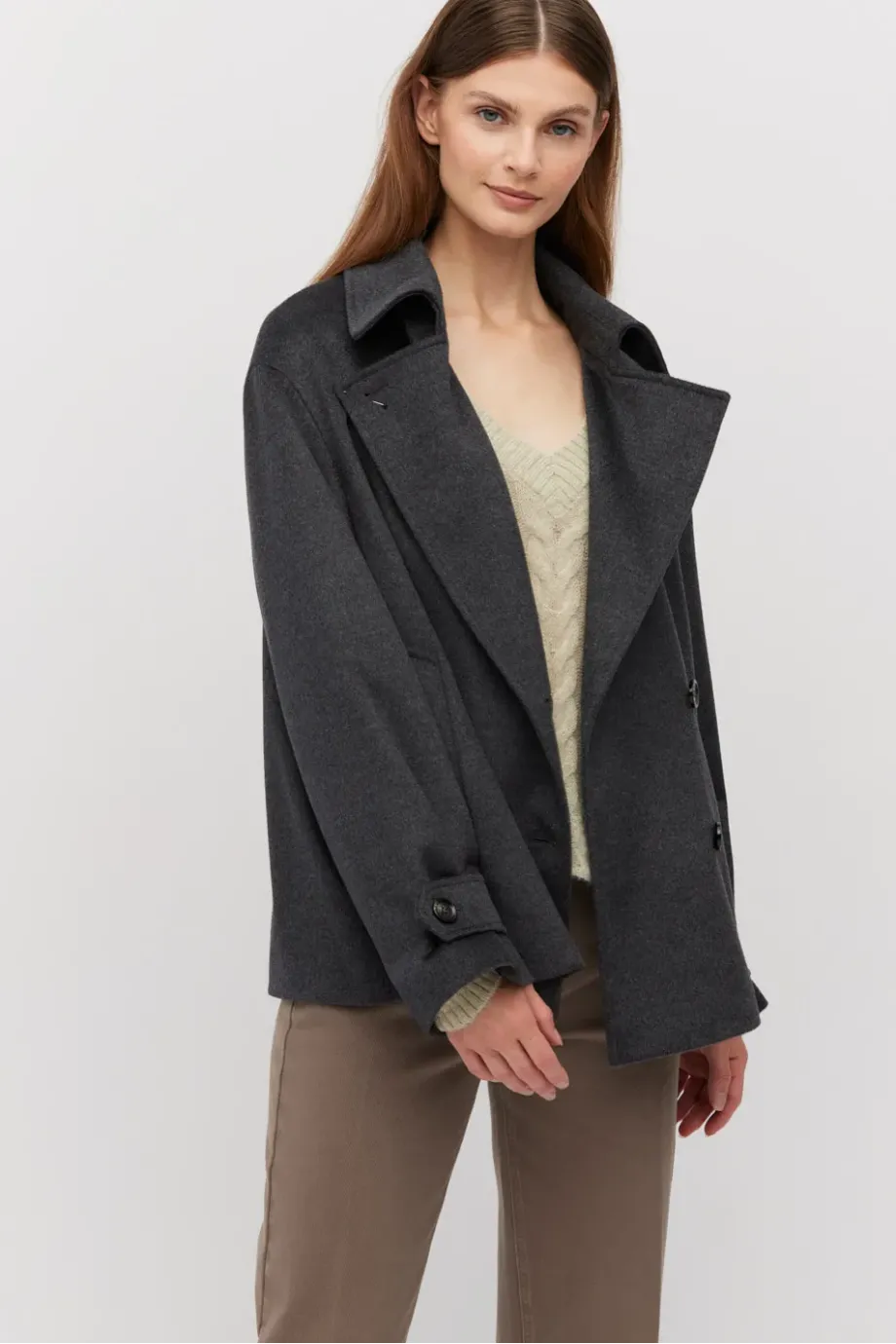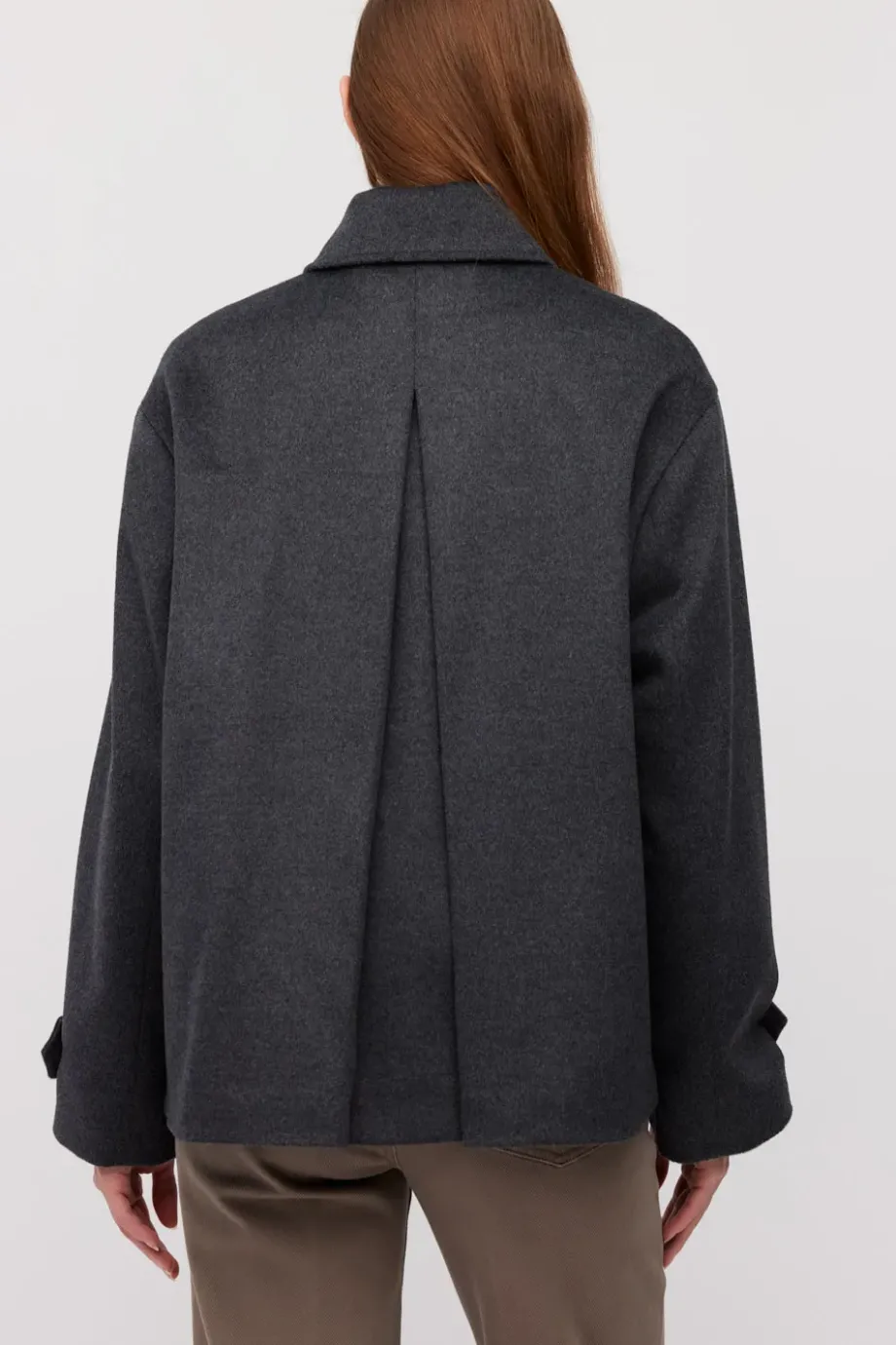 Dunkelgraue Wolljacke mit lockerem Schnitt. Zweireihig, bis zum Hals zu schließen. Modell mit Futter, leicht herabfallenden Schultern, Kellerfalte hinten und Schulterklappen an den Ärmeln.