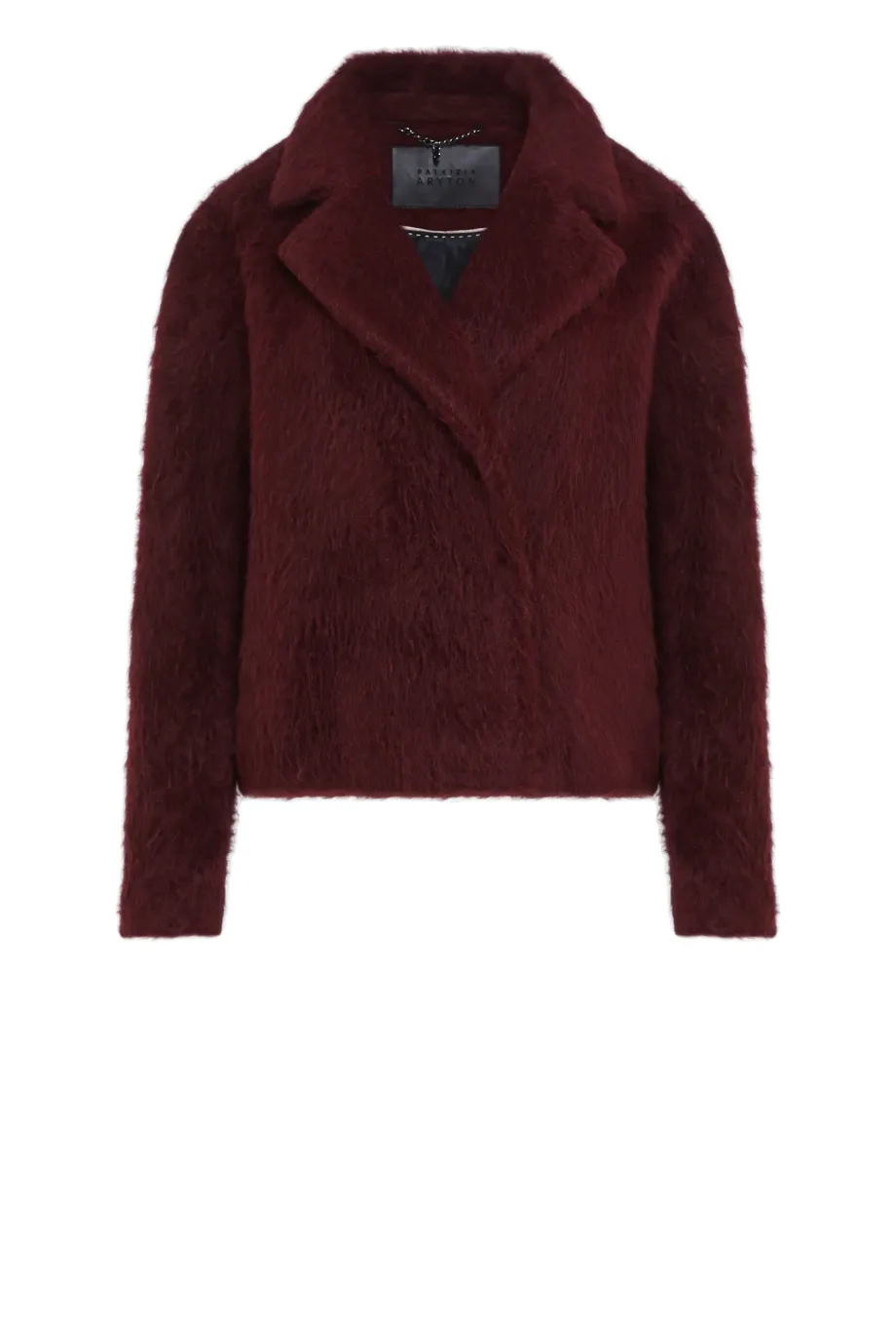 Jacke aus Alpakawolle und Lammwolle (Schurwolle). Lockerer Schnitt mit Kragen. Lange Ärmel. Druckknopfverschluss. Modell mit Futter und dekorativer Paspelierung. Farbe Kirschrot.